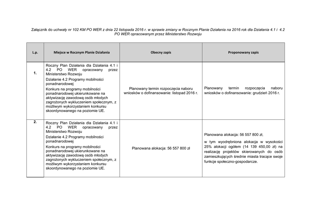 Załącznik do uchwały nr 102 KM PO WER z dnia 22 listopada 2016 r. w sprawie zmiany w Rocznym Planie Działania na 2016 rok dla Działania 4.1 i 4.2 PO WER opracowanym przez Ministerstwo Rozwoju L.p. 1. 2. Miejsce w Rocznym Planie Działania Roczny Plan Działania dla Działania 4.1 i 4.2 PO WER opracowany przez Ministerstwo Rozwoju Działanie 4.2 Programy mobilności ponadnarodowej Konkurs na programy mobilności ponadnarodowej ukierunkowane na aktywizację zawodową osób młodych zagrożonych wykluczeniem społecznym, z możliwym wykorzystaniem konkursu skoordynowanego na poziomie UE. Roczny Plan Działania dla Działania 4.1 i 4.2 PO WER opracowany przez Ministerstwo Rozwoju Działanie 4.2 Programy mobilności ponadnarodowej Konkurs na programy mobilności ponadnarodowej ukierunkowane na aktywizację zawodową osób młodych zagrożonych wykluczeniem społecznym, z możliwym wykorzystaniem konkursu skoordynowanego na poziomie UE. Obecny zapis Proponowany zapis Planowany termin rozpoczęcia naboru wniosków o dofinansowanie: listopad 2016 r. Planowany termin rozpoczęcia naboru wniosków o dofinansowanie: grudzień 2016 r. Planowana alokacja: 56 557 800 zł, Planowana alokacja: 56 557 800 zł w tym wyodrębniona alokacja w wysokości 25% alokacji ogółem (14 139 450,00 zł) na realizację projektów skierowanych do osób zamieszkujących średnie miasta tracące swoje funkcje społeczno-gospodarcze. 3. Dodano kryterium dostępu: Roczny Plan Działania dla Działania 4.1 i 4.2 PO WER opracowany przez Ministerstwo Rozwoju Działanie 4.2 Programy mobilności ponadnarodowej Konkurs na programy mobilności ponadnarodowej ukierunkowane na aktywizację zawodową osób młodych zagrożonych wykluczeniem społecznym, z możliwym wykorzystaniem konkursu skoordynowanego na poziomie UE. 4. Roczny Plan Działania dla Działania 4.1 i 4.2 PO WER opracowany przez Ministerstwo Rozwoju Działanie 4.2 Programy mobilności ponadnarodowej Konkurs na programy mobilności ponadnarodowej ukierunkowane na aktywizację zawodową osób młodych zagrożonych wykluczeniem społecznym, z możliwym wykorzystaniem konkursu skoordynowanego na poziomie UE. Kryterium dostępu Grupę docelową projektu stanowią: Brak kryterium. a) osoby zamieszkujące w rozumieniu Kodeksu Cywilnego średnie miasta tracące swoje funkcje społeczno-gospodarcze - w przypadku projektów, na które wyodrębniono 25% alokacji lub b) osoby zamieszkujące w rozumieniu Kodeksu Cywilnego terytorium Polski – w przypadku projektów wybieranych w ramach pozostałej alokacji. Pobyt uczestników za granicą trwa od 60 do 180 dni (w uzasadnionych przypadkach, po uzgodnieniu z IOK, na etapie realizacji projektu mobilność może zostać skrócona poniżej 2 miesięcy). Pobyt uczestników za granicą trwa od 45 do 60 dni (w uzasadnionych przypadkach, po uzgodnieniu z IOK, na etapie realizacji projektu mobilność może zostać skrócona poniżej 45 dni). 5. Roczny Plan Działania dla Działania 4.1 i 4.2 PO WER opracowany przez Ministerstwo Rozwoju Działanie 4.2 Programy mobilności ponadnarodowej Konkurs na programy mobilności ponadnarodowej ukierunkowane na aktywizację zawodową osób młodych zagrożonych wykluczeniem społecznym, z możliwym wykorzystaniem konkursu skoordynowanego na poziomie UE. Kryterium dostępu Podczas fazy przygotowania do mobilności, dla każdego uczestnika i przy jego udziale, opracowywany jest indywidualny plan działania, uwzględniający indywidualne potrzeby i możliwości uczestnika. Podczas fazy przygotowania do mobilności dla każdego uczestnika opracowywany jest indywidualny plan działania, uwzględniający indywidualne potrzeby i możliwości uczestnika. Maksymalna liczba osób (określona we wniosku o dofinansowanie) planowanych do objęcia wsparciem w projekcie wynosi 100, a minimalna 16. Roczny Plan Działania dla Działania 4.1 i 4.2 PO WER opracowany przez Ministerstwo Rozwoju Działanie 4.2 Programy mobilności ponadnarodowej Konkurs na programy mobilności ponadnarodowej ukierunkowane na aktywizację zawodową osób młodych zagrożonych wykluczeniem społecznym, z możliwym wykorzystaniem konkursu skoordynowanego na poziomie UE. Kryterium dostępu Maksymalna liczba osób (określona we wniosku o dofinansowanie) planowanych do objęcia wsparciem w projekcie wynosi 100, a minimalna 8. Uzasadnienie: Ze względu na maksymalnie 24-miesięczny okres realizacji projektu oraz jego złożoność (konieczność zrealizowania czterech obligatoryjnych etapów) szacuje się, że dla zapewnienia efektywnej i sprawnej realizacji projektu liczba jego uczestników nie powinna przekraczać 100. Kryterium dotyczy oceny założeń projektu, na etapie realizacji, w przypadku pojawienia się oszczędności lub gdy potencjał projektodawcy będzie odpowiedni, możliwe jest zwiększenie liczby uczestników projektu, za zgodą IOK. Z uwagi na fakt, że rekomendowane są wyjazdy uczestników za granicę w grupach od 8 do 12 osób, minimalna liczba uczestników jednego projektu to 8 osób. Kryterium weryfikowane na podstawie zapisów we wniosku. 6. Uzasadnienie: Ze względu na maksymalnie 24-miesięczny okres realizacji projektu oraz jego złożoność (konieczność zrealizowania czterech obligatoryjnych etapów) szacuje się, że dla zapewnienia efektywnej i sprawnej realizacji projektu liczba jego uczestników nie powinna przekraczać 100. Kryterium dotyczy oceny założeń projektu, na etapie realizacji, w przypadku pojawienia się oszczędności lub gdy potencjał projektodawcy będzie odpowiedni, możliwe jest zwiększenie liczby uczestników projektu, za zgodą IOK. Na etapie realizacji projektu w przypadkach losowych możliwe jest również zmniejszenie liczby uczestników poniżej 16 osób, za zgodą IOK. Kryterium weryfikowane na podstawie zapisów we wniosku. 7. Roczny Plan Działania dla Działania 4.1 i 4.2 PO WER opracowany przez Ministerstwo Rozwoju Działanie 4.2 Programy mobilności ponadnarodowej Konkurs 