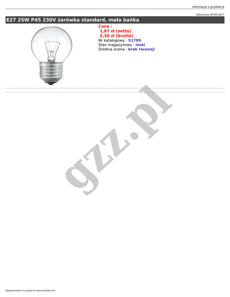 Informacje o produkcie Utworzono 04-03-2017 E27 25W P45 230V żarówka standard, mała bańka Cena : 1,87 zł (netto) 2,30 zł (brutto) gz z .p l Nr katalogowy : 51789 Stan magazynowy : niski Średnia ocena : brak recenzji Wygenerowano w programie www.oscGold.com