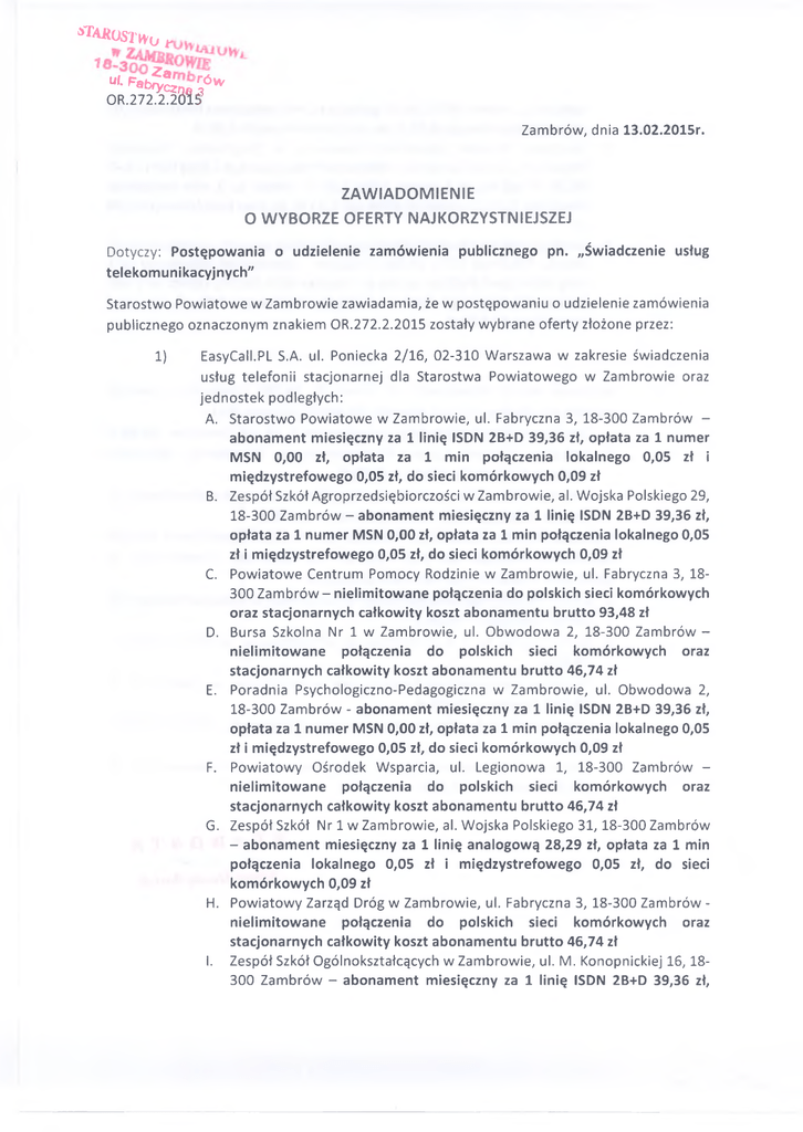 ^AKOST^O r Ut Fab^ R ł S ÓW OR.272.2.2015 Zambrów, dnia 13.02.2015r. ZAWIADOMIENIE O WYBORZE OFERTY NAJKORZYSTNIEJSZEJ Dotyczy: Postępowania o udzielenie zamówienia publicznego pn. „Świadczenie usług telekomunikacyjnych" Starostwo Powiatowe w Zambrowie zawiadamia, że w postępowaniu o udzielenie zamówienia publicznego oznaczonym znakiem OR.272.2.2015 zostały wybrane oferty złożone przez: 1) EasyCall.PL S.A. ul. Poniecka 2/16, 02-310 Warszawa w zakresie świadczenia usług telefonii stacjonarnej dla Starostwa Powiatowego w Zambrowie oraz jednostek podległych: A. Starostwo Powiatowe w Zambrowie, ul. Fabryczna 3, 18-300 Zambrów - abonament miesięczny za 1 linię ISDN 2B+D 39,36 zł, opłata za 1 numer MSN 0,00 zł, opłata za 1 min połączenia lokalnego 0,05 zł i międzystrefowego 0,05 zł, do sieci komórkowych 0,09 zł B. Zespół Szkół Agroprzedsiębiorczości w Zambrowie, al. Wojska Polskiego 29, 18-300 Zambrów - abonament miesięczny za 1 linię ISDN 2B+D 39,36 zł, opłata za 1 numer MSN 0,00 zł, opłata za 1 min połączenia lokalnego 0,05 zł i międzystrefowego 0,05 zł, do sieci komórkowych 0,09 zł C. Powiatowe Centrum Pomocy Rodzinie w Zambrowie, ul. Fabryczna 3, 18300 Zambrów - nielimitowane połączenia do polskich sieci komórkowych oraz stacjonarnych całkowity koszt abonamentu brutto 93,48 zł D. Bursa Szkolna Nr 1 w Zambrowie, ul. Obwodowa 2, 18-300 Zambrów - nielimitowane połączenia do polskich sieci komórkowych oraz stacjonarnych całkowity koszt abonamentu brutto 46,74 zł E. Poradnia Psychologiczno-Pedagogiczna w Zambrowie, ul. Obwodowa 2, 18-300 Zambrów - abonament miesięczny za 1 linię ISDN 2B+D 39,36 zł, opłata za 1 numer MSN 0,00 zł, opłata za 1 min połączenia lokalnego 0,05 zł i międzystrefowego 0,05 zł, do sieci komórkowych 0,09 zł F. Powiatowy Ośrodek Wsparcia, ul. Legionowa 1, 18-300 Zambrów - nielimitowane połączenia do polskich sieci komórkowych oraz stacjonarnych całkowity koszt abonamentu brutto 46,74 zł G. Zespół Szkół Nr 1 w Zambrowie, al. Wojska Polskiego 31,18-300 Zambrów - abonament miesięczny za 1 linię analogową 28,29 zł, opłata za 1 min połączenia lokalnego 0,05 zł i międzystrefowego 0,05 zł, do sieci komórkowych 0,09 zł H. Powiatowy Zarząd Dróg w Zambrowie, ul. Fabryczna 3, 18-300 Zambrów - nielimitowane połączenia do polskich sieci komórkowych oraz stacjonarnych całkowity koszt abonamentu brutto 46,74 zł I. Zespół Szkół Ogólnokształcących w Zambrowie, ul. M. Konopnickiej 16,18300 Zambrów - abonament miesięczny za 1 linię ISDN 2B+D 39,36 zł, opłata za 1 numer MSN 0,00 zł, opłata za 1 min połączenia lokalnego 0,05 zł i międzystrefowego 0,05 zł, do sieci komórkowych 0,09 zł J. Specjalny Ośrodek Szkolno-Wychowawczy w Długoborzu, Długobórz Pierwszy 5,18-301 Zambrów - abonament miesięczny za 1 linię ISDN 2B+D 39,36 zł, opłata za 1 numer MSN 0,00 zł, opłata za 1 min połączenia lokalnego 0,05 zł i międzystrefowego 0,05 zł, do sieci komórkowych 0,09 zł K. Centrum Obsługi Placówek Opiekuńczo-Wychowawczych w Zambrowie, al. Wojska Polskiego 52/2, 18-300 Zambrów - abonament miesięczny za 1 linię ISDN 2B+D 39,36 zł, opłata za 1 numer MSN 0,00 zł, opłata za 1 min połączenia lokalnego 0,05 zł i międzystrefowego 0,05 zł, do sieci komórkowych 0,09 zł 2) 3) Markomp Marek Matejkowski, ul. Bema 2B, 18-300 Zambrów w zakresie świadczenia dostępu do sieci Internet dla jednostek podległych: a. Powiatowy Ośrodek Wsparcia, ul. Legionowa 1,18-300 Zambrów - 59,00 zł b. Specjalny Ośrodek Szkolno-Wychowawczy w Długoborzu, Długobórz Pierwszy 5, 18-301 Zambrów - 59,00 zł c. Centrum Obsługi Placówek Opiekuńczo-Wychowawczych w Zambrowie, al. Wojska Polskiego 52/2, 18-300 Zambrów - 69,00 zł TepsaNet Stanisław Nowacki, ul. Wyszyńskiego 4B, 18-300 Zambrów w zakresie świadczenia dostępu do sieci Internet dla Starostwa Powiatowego w Zambrowie - 80,00 zł oraz jednostek podległych: a. Zespół Szkół Agroprzedsiębiorczości w Zambrowie, al. Wojska Polskiego 29, 18-300 Zambrów - 75,00 zł b. Bursa Szkolna Nr 1 w Zambrowie, ul. Obwodowa 2, 18-300 Zambrów - 75,00 zł c. Poradnia Psychologiczno-Pedagogiczna w Zambrowie, ul. Obwodowa 2, 18-300 Zambrów - 75,00 zł d. Zespół Szkół Nr 1 w Zambrowie, al. Wojska Polskiego 31, 18-300 Zambrów - 60,00 zł e. Zespół Szkół Ogólnokształcących w Zambrowie, ul. M. Konopnickiej 16, 18-300 Zambrów - 75,00 zł s t a r o s t a Robert Maciej Rosiak *0.0 •