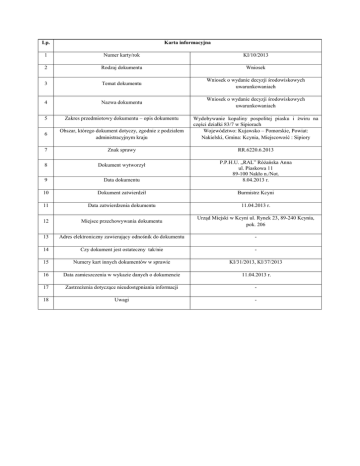 Lp. Karta informacyjna 1 Numer karty/rok KI/10/2013 2 Rodzaj dokumentu Wniosek 3 Temat dokumentu Wniosek o wydanie decyzji środowiskowych uwarunkowaniach 4 Nazwa dokumentu Wniosek o wydanie decyzji środowiskowych uwarunkowaniach 5 Zakres przedmiotowy dokumentu – opis dokumentu 6 Obszar, którego dokument dotyczy, zgodnie z podziałem administracyjnym kraju Wydobywanie kopaliny pospolitej piasku i żwiru na części działki 83/7 w Sipiorach Województwo: Kujawsko – Pomorskie, Powiat: Nakielski, Gmina: Kcynia, Miejscowość : Sipiory 7 Znak sprawy RR.6220.6.2013 8 Dokument wytworzył 9 Data dokumentu P.P.H.U. „RAL” Różańska Anna ul. Piaskowa 11 89-100 Nakło n./Not. 8.04.2013 r. 10 Dokument zatwierdził Burmistrz Kcyni 11 Data zatwierdzenia dokumentu 11.04.2013 r. 12 Miejsce przechowywania dokumentu Urząd Miejski w Kcyni ul. Rynek 23, 89-240 Kcynia, pok. 206 13 Adres elektroniczny zawierający odnośnik do dokumentu - 14 Czy dokument jest ostateczny tak/nie - 15 Numery kart innych dokumentów w sprawie KI/31/2013, KI/37/2013 16 Data zamieszczenia w wykazie danych o dokumencie 11.04.2013 r. 17 Zastrzeżenia dotyczące nieudostępniania informacji - 18 Uwagi -