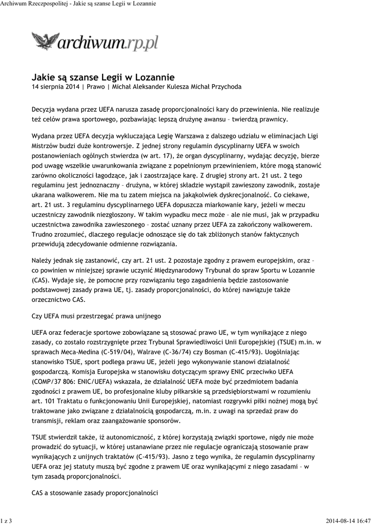 Archiwum Rzeczpospolitej - Jakie są szanse Legii w Lozannie 1z3 Jakie są szanse Legii w Lozannie 14 sierpnia 2014 | Prawo | Michał Aleksander Kulesza Michał Przychoda Decyzja wydana przez UEFA narusza zasadę proporcjonalności kary do przewinienia. Nie realizuje też celów prawa sportowego, pozbawiając lepszą drużynę awansu – twierdzą prawnicy. Wydana przez UEFA decyzja wykluczająca Legię Warszawa z dalszego udziału w eliminacjach Ligi Mistrzów budzi duże kontrowersje. Z jednej strony regulamin dyscyplinarny UEFA w swoich postanowieniach ogólnych stwierdza (w art. 17), że organ dyscyplinarny, wydając decyzję, bierze pod uwagę wszelkie uwarunkowania związane z popełnionym przewinieniem, które mogą stanowić zarówno okoliczności łagodzące, jak i zaostrzające karę. Z drugiej strony art. 21 ust. 2 tego regulaminu jest jednoznaczny – drużyna, w której składzie wystąpił zawieszony zawodnik, zostaje ukarana walkowerem. Nie ma tu zatem miejsca na jakąkolwiek dyskrecjonalność. Co ciekawe, art. 21 ust. 3 regulaminu dyscyplinarnego UEFA dopuszcza miarkowanie kary, jeżeli w meczu uczestniczy zawodnik niezgłoszony. W takim wypadku mecz może – ale nie musi, jak w przypadku uczestnictwa zawodnika zawieszonego – zostać uznany przez UEFA za zakończony walkowerem. Trudno zrozumieć, dlaczego regulacje odnoszące się do tak zbliżonych stanów faktycznych przewidują zdecydowanie odmienne rozwiązania. Należy jednak się zastanowić, czy art. 21 ust. 2 pozostaje zgodny z prawem europejskim, oraz – co powinien w niniejszej sprawie uczynić Międzynarodowy Trybunał do spraw Sportu w Lozannie (CAS). Wydaje się, że pomocne przy rozwiązaniu tego zagadnienia będzie zastosowanie podstawowej zasady prawa UE, tj. zasady proporcjonalności, do której nawiązuje także orzecznictwo CAS. Czy UEFA musi przestrzegać prawa unijnego UEFA oraz federacje sportowe zobowiązane są stosować prawo UE, w tym wynikające z niego zasady, co zostało rozstrzygnięte przez Trybunał Sprawiedliwości Unii Europejskiej (TSUE) m.in. w sprawach Meca-Medina (C-519/04), Walrave (C-36/74) czy Bosman (C-415/93). Uogólniając stanowisko TSUE, sport podlega prawu UE, jeżeli jego wykonywanie stanowi działalność gospodarczą. Komisja Europejska w stanowisku dotyczącym sprawy ENIC przeciwko UEFA (COMP/37 806: ENIC/UEFA) wskazała, że działalność UEFA może być przedmiotem badania zgodności z prawem UE, bo profesjonalne kluby piłkarskie są przedsiębiorstwami w rozumieniu art. 101 Traktatu o funkcjonowaniu Unii Europejskiej, natomiast rozgrywki piłki nożnej mogą być traktowane jako związane z działalnością gospodarczą, m.in. z uwagi na sprzedaż praw do transmisji, reklam oraz zaangażowanie sponsorów. TSUE stwierdził także, iż autonomiczność, z której korzystają związki sportowe, nigdy nie może prowadzić do sytuacji, w której ustanawiane przez nie regulacje ograniczają stosowanie praw wynikających z unijnych traktatów (C-415/93). Jasno z tego wynika, że regulamin dyscyplinarny UEFA oraz jej statuty muszą być zgodne z prawem UE oraz wynikającymi z niego zasadami – w tym zasadą proporcjonalności. CAS a stosowanie zasady proporcjonalności 2014-08-14 16:47 Archiwum Rzeczpospolitej - Jakie są szanse Legii w Lozannie 2z3 Jak wynika z orzecznictwa TSUE, środek prawny jest zgodny z zasadą proporcjonalności, jeżeli jest odpowiedni oraz konieczny dla osiągnięcia określonego celu, a także współmierny w stosunku do nakładanych ograniczeń, z czego wynika generalny zakaz przeprowadzania działań władczych organów ponad potrzebę. Oznacza to z kolei, że realizacja zasady proporcjonalności sprowadza się do poszukiwania „złotego środka" dla osiągnięcia zakładanego celu. Z orzeczenia CAS (sygn. CAS 2011/O/2574) wynika natomiast, iż celem przepisów dyscyplinarnych UEFA jest zapewnienie sprawiedliwej konkurencji, równego traktowania uczestników oraz właściwego funkcjonowanie sportu. Legia swoim postępowaniem nie naruszyła żadnego z tych celów. Należy jednak pamiętać, że postępowanie toczyć się będzie przed CAS, który nie jest zobowiązany do bezpośredniego stosowania prawa UE. Podkreślamy jednak, iż sam CAS wypracował w swoim orzecznictwie koncepcję proporcjonalności, którą uznał – jak sam to określił – za „podstawową zasadę prawa sportowego" (sygn. CAS 99/AA/246). Zgodnie z nią surowość kary powinna odpowiadać stopniowi naruszenia przepisów, a między sankcją a przewinieniem konieczne jest zachowanie równowagi. Ponieważ statut oraz regulamin dyscyplinarny UEFA ma być zgodny z prawem UE, naszym zdaniem CAS winien kierować się także podstawowymi zasadami rządzącymi prawem UE, a swoje rozumienie pojęcia „proporcjonalności" rozszerzyć właśnie o dorobek powstały w orzecznictwie TSUE. Kara na pewno sprawiedliwa? Podstawą do ukarania Legii był art. 21 ust. 2 regulaminu dyscyplinarnego UEFA, którego brzmienie nie dopuszcza w ogóle miarkowania kary. Można pokusić się o wniosek, że przepis ten nie gwarantuje realizacji podstawowej zasady prawa UE – tj. zasady proporcjonalności – i jako taki nie powinien być zastosowany. Wydaje się zatem, że jego zastosowanie przez CAS w istocie daje możliwość zawieszenia lub uchylenia decyzji UEFA. Powyższe jest także zgodne z klauzulą generalną wynikającą z art. 17 regulaminu dyscyplinarnego UEFA. Jak podkreślił CAS, zasada proporcjonalności powinna znaleźć zastosowanie przede wszystkim w przypadku regulacji sportowych, które na ogół przewidują zbyt restrykcyjne sankcje (CAS 2005/A/830). Biorąc to pod uwagę, w naszej opinii decyzja wydana przez UEFA narusza zasadę proporcjonalności, a przede wszystkim – nie realizuje podstawowych celów prawa sportowego – pozbawiając drużynę „boiskowo" lepszą awansu. Nie sposób zatem oprzeć się wrażeniu, że spór o decyzję UEFA wykluczającą Legię z udział