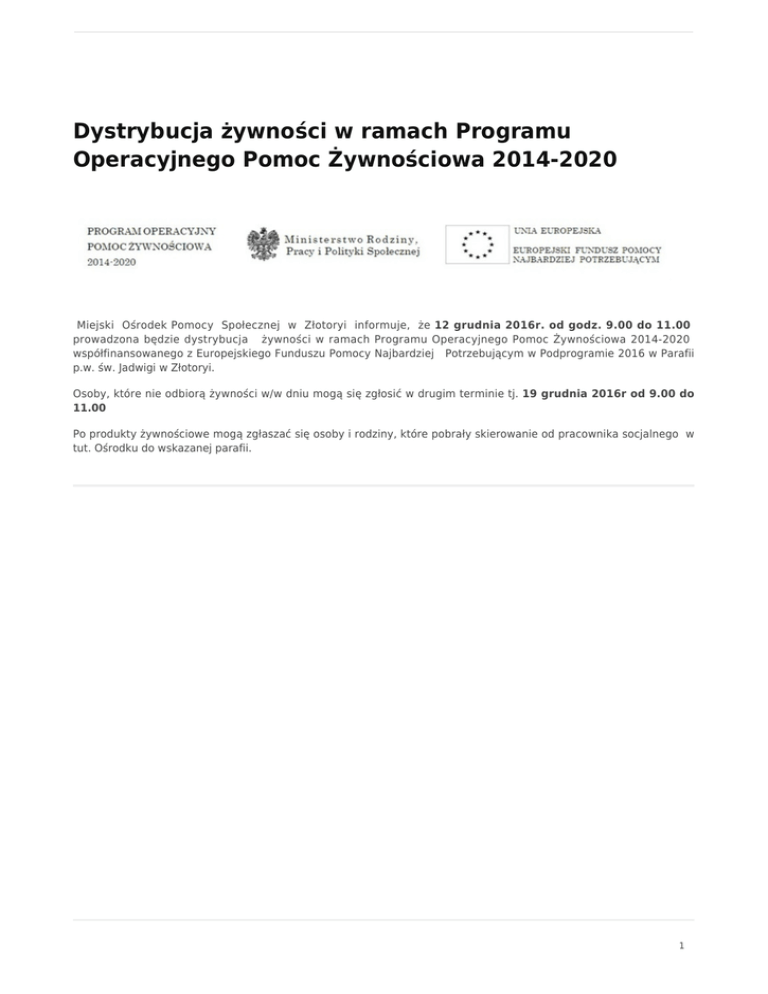 Dystrybucja żywności w ramach Programu Operacyjnego Pomoc Żywnościowa 2014-2020 Miejski Ośrodek Pomocy Społecznej w Złotoryi informuje, że 12 grudnia 2016r. od godz. 9.00 do 11.00 prowadzona będzie dystrybucja żywności w ramach Programu Operacyjnego Pomoc Żywnościowa 2014-2020 współfinansowanego z Europejskiego Funduszu Pomocy Najbardziej Potrzebującym w Podprogramie 2016 w Parafii p.w. św. Jadwigi w Złotoryi. Osoby, które nie odbiorą żywności w/w dniu mogą się zgłosić w drugim terminie tj. 19 grudnia 2016r od 9.00 do 11.00 Po produkty żywnościowe mogą zgłaszać się osoby i rodziny, które pobrały skierowanie od pracownika socjalnego w tut. Ośrodku do wskazanej parafii. 1