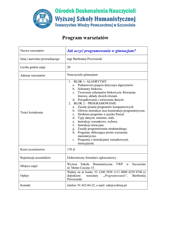 Program warsztatów Nazwa warsztatów Jak uczyć programowania w gimnazjum? Imię i nazwisko prowadzącego mgr Bartłomiej Piwowarski Liczba godzin zajęć 20 Adresat warsztatów Nauczyciele gimnazjum Treści kształcenia 1. BLOK 1- ALGORYTMY a. Podstawowe pojęcia dotyczące algorytmów. b. Schematy blokowe. c. Tworzenie schematów blokowych: Równania liniowe, układy dwóch równań. d. Porządkowanie i sortowanie danych. 2. BLOK 2 – PROGRAMOWANIE a. Zasady pisania programów komputerowych. b. Główne instrukcje oraz konstrukcje programistyczne. c. Struktura programu w języku Pascal. d. Typy danych, zmienne, stałe. e. Instrukcje warunkowe, wyboru. f. Instrukcje iteracyjne. g. Zasady programowania strukturalnego. h. Programy obliczające proste wyrażenia matematyczne. i. Programy z instrukcjami warunkowymi, iteracyjnymi. Koszt uczestnictwa 170 zł Rejestracja uczestników Elektroniczny formularz zgłoszeniowy Miejsce zajęć Opłaty Kontakt Wyższa Szkoła Humanistyczna TWP w Szczecinie ul. Monte Cassino 15. Wpłaty na nr konta: 53 1240 3930 1111 0000 4229 0746 (z dopiskiem: warsztaty „Programowanie”, Bartłomiej Piwowarski telefon: 91 422-04-22, e-mail: [email protected]