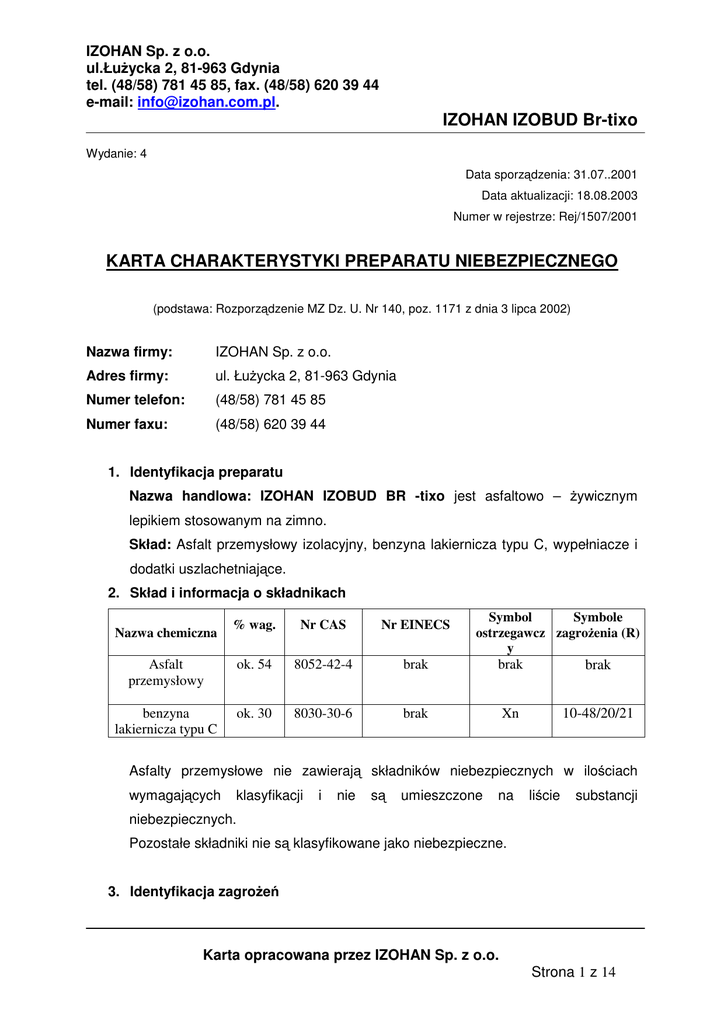 IZOHAN Sp. z o.o. ul.Łu ycka 2, 81-963 Gdynia tel. (48/58) 781 45 85, fax. (48/58) 620 39 44 e-mail: [email protected]. IZOHAN IZOBUD Br-tixo Wydanie: 4 Data sporz dzenia: 31.07..2001 Data aktualizacji: 18.08.2003 Numer w rejestrze: Rej/1507/2001 KARTA CHARAKTERYSTYKI PREPARATU NIEBEZPIECZNEGO (podstawa: Rozporz dzenie MZ Dz. U. Nr 140, poz. 1171 z dnia 3 lipca 2002) Nazwa firmy: IZOHAN Sp. z o.o. Adres firmy: ul. Łu ycka 2, 81-963 Gdynia Numer telefon: (48/58) 781 45 85 Numer faxu: (48/58) 620 39 44 1. Identyfikacja preparatu Nazwa handlowa: IZOHAN IZOBUD BR -tixo jest asfaltowo – ywicznym lepikiem stosowanym na zimno. Skład: Asfalt przemysłowy izolacyjny, benzyna lakiernicza typu C, wypełniacze i dodatki uszlachetniaj ce. 2. Skład i informacja o składnikach % wag. Nr CAS Nr EINECS Asfalt przemysłowy ok. 54 8052-42-4 brak benzyna lakiernicza typu C ok. 30 8030-30-6 brak Nazwa chemiczna Symbol Symbole ostrzegawcz zagro enia (R) y brak brak 10-48/20/21 Xn Asfalty przemysłowe nie zawieraj składników niebezpiecznych w ilo ciach wymagaj cych s klasyfikacji i nie umieszczone na li cie substancji niebezpiecznych. Pozostałe składniki nie s klasyfikowane jako niebezpieczne. 3. Identyfikacja zagro e Karta opracowana przez IZOHAN Sp. z o.o. Strona 1 z 14 IZOHAN Sp. z o.o. ul.Łu ycka 2, 81-963 Gdynia tel. (48/58) 781 45 85, fax. (48/58) 620 39 44 e-mail: [email protected]. IZOHAN IZOBUD Br-tixo Zagro enie po arowe: Produkt łatwopalny. Zawiera składniki tworz ce z powietrzem mieszaniny wybuchowe. Pary s ci sze od powietrza – gromadz si przy powierzchni i w dolnych partiach pomieszcze . Zagro enie toksykologiczne: Składniki zawarte w produkcie działaj dra ni co na skór , oczy i drogi oddechowe. W przypadku spo ycia wyst pi objawy silnego podra nienia błon luzowych przewodu pokarmowego, a po silnym wchłoni ciu mog zakłócenia w pracy serca, o rodkowego układu wyst pi nerwowego oraz zakłócenie pracy w troby i nerek. Zagro enie ekotoksykologiczne: działaj ce szkodliwie na organizmy Benzyna lakiernicza odparowuje Benzyna lakiernicza zawiera składniki ywe, w szczególno ci organizmy wodne. stosunkowo szybko. Ulega biologicznej degradacji. 4. Pierwsza pomoc Uwaga: W pierwszej kolejno ci nale y wyprowadzi poszkodowan osob ze ska onego rodowiska. Uło y na lewym boku z głow skierowan w dół. Zatrucie inhalacyjne: 1. Natychmiast usun ratuj cy s zagro onego ze ska onej atmosfery. Upewni si , czy wyposa eni w aparaty oddechowe, aby nie stali si ofiarami zatrutej atmosfery. Kontrolowa delikatnie głow ustami pacjenta. oddech pacjenta. Przechyli do tyłu, do tego stopnia, by usun oddychaniu. Wsłuchiwa Brak si kolejnymi przeszkody w w oddech, przykładaj c ucho nad nosem i oddechu: natychmiast zastosowa sztuczne oddychanie, gdy brak t tna – zastosowa masa serca. 2. Zapewni pomoc lekarsk . Zatrucie doustne: 1. Pod adnym warunkiem nie wywoływa wymiotów. Przy utracie przytomno ci: – uło y poszkodowan osob w pozycji dla nieprzytomnych, – skontrolowa , czy samodzielnie oddycha, – je eli nie oddycha, zastosowa sztuczne oddychanie, – nie podawa niczego doustnie, gdy poszkodowana Karta opracowana przez IZOHAN Sp. z o.o. osoba Strona 2 z 14 jest IZOHAN Sp. z o.o. ul.Łu ycka 2, 81-963 Gdynia tel. (48/58) 781 45 85, fax. (48/58) 620 39 44 e-mail: [email protected]. IZOHAN IZOBUD Br-tixo nieprzytomna, – nie podawa alkoholu, morfiny lub innych rodków pobudzaj cych. Przy zachowanej przytomno ci: – podawa 2 opakowania (10g) aktywnego w gla drzewnego zawieszonego w 500 ml wody, a nast pnie 3 dawki po 1 opakowaniu (5g) w 100 ml wody co 20 minut. 2. Do chwili odtransportowania do szpitala choremu zapewni spokój, le enie i ciepło. Ska enie oczu: 1. Wymywa produkt z oka za pomoc du ej ilo ci wody tak szybko, jak tylko jest to mo liwe. Utrzymywa powieki szeroko rozchylone. Czynno by ta musi wykonywana przez co najmniej 10 minut. Je li nie ma pewno ci, e produkt został całkowicie usuni ty, płukanie oka powtarza przez dalsze 10 minut. 2. Zapewni pomoc okulisty. Ska enie skóry: 1. Usun ilo ci natychmiast ska on odzie i obuwie. Spłukiwa produkt obfit wody przez co najmniej 10 minut. Je eli na skórze widoczny jest jakikolwiek lad substancji chemicznej, spłukiwanie nale y kontynuowa przez nast pne 10 minut. 2. W przypadku gdy podra nienie skóry nie mija, skonsultowa si z lekarzem dermatologiem. 5. Post powanie w przypadku po aru Szczególne niebezpiecze stwa: Produkt łatwo palny W czasie spalania mog powsta truj ce dymy lub pary, tlenki w gla. rodki ga nicze: Ga nice CO2, ga nice proszkowe z proszkiem gasz cym ABC, ga nice proszkowe z proszkiem gasz cym BC, ga nice pianowe, ga nice płynowe z dodatkowym wodnym roztworem rodka. Zalecenia szczegółowe: Mały po ar gasi proszkow (ABC albo BC), du y po ar gasi ga nic pian niegow (CO2) lub lub w ostateczno ci rozproszonymi pr dami wody. Karta opracowana przez IZOHAN Sp. z o.o. Strona 3 z 14 IZOHAN Sp. z o.o. ul.Łu ycka 2, 81-963 Gdynia tel. (48/58) 781 45 85, fax. (48/58) 620 39 44 e-mail: [email protected]. Uwaga: Nie stosowa IZOHAN IZOBUD Br-tixo zwartych strumieni wody na powierzchni cieczy. Powoduje to rozrzucanie pal cego si pal cej si produktu, a tym samym rozprzestrzenianie ognisk po aru. Zbiorniki i inne opakowania nara one na działanie wysokiej temperatury chłodzi wod , a w miar mo liwo ci usun z zagro onego obszaru. 6. Post powanie w przypadku niezamierzonego uwolnienia do rodowiska rodki ochrony osobistej: Unika kontaktu z uwalniaj cym si produktem. Stosowa ubrania ochronne z tkanin powlekanych, r kawice ochronne odporne na działanie w glowodorów, okulary ochronne w szczelnej obudowie, a w przypadku wyra nie wyczuwalnego, charakterystycznego zapachu benzyny lakierniczej – ochrony dróg oddechowych. Nale y pami ta o ograniczonym czasie gazowych działania ochronnego filtrów cz steczkowych i (filtr cz steczkowy oznaczony kolorem białym i symbolem P2, filtr par organicznych i rozpuszczalników oznaczony kolorem br 
