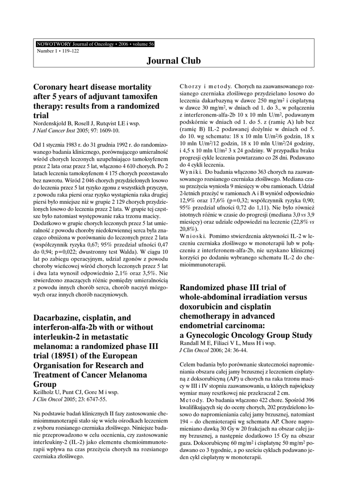 NOWOTWORY Journal of Oncology • 2006 • volume 56 Number 1 • 119–122 Journal Club Coronary heart disease mortality after 5 years of adjuvant tamoxifen therapy: results from a randomized trial Nordenskjold B, Rosell J, Rutqvist LE i wsp. J Natl Cancer Inst 2005; 97: 1609-10. Od 1 stycznia 1983 r. do 31 grudnia 1992 r. do randomizowanego badania klinicznego, porównujàcego umieralnoÊç wÊród chorych leczonych uzupe∏niajàco tamoksyfenem przez 2 lata oraz przez 5 lat, w∏àczono 4 610 chorych. Po 2 latach leczenia tamoksyfenem 4 175 chorych pozostawa∏o bez nawrotu. WÊród 2 046 chorych przydzielonych losowo do leczenia przez 5 lat ryzyko zgonu z wszystkich przyczyn, z powodu raka piersi oraz ryzyko wystàpienia raka drugiej piersi by∏o mniejsze ni˝ w grupie 2 129 chorych przydzielonych losowo do leczenia przez 2 lata. W grupie tej cz´stsze by∏o natomiast wyst´powanie raka trzonu macicy. Dodatkowo w grupie chorych leczonych przez 5 lat umieralnoÊç z powodu choroby niedokrwiennej serca by∏a znaczàco obni˝ona w porównaniu do leczonych przez 2 lata (wspó∏czynnik ryzyka 0,67; 95% przedzia∏ ufnoÊci 0,47 do 0,94; p=0,022; dwustronny test Walda). W ciàgu 10 lat po zabiegu operacyjnym, udzia∏ zgonów z powodu choroby wieƒcowej wÊród chorych leczonych przez 5 lat i dwa lata wynosi∏ odpowiednio 2,1% oraz 3,5%. Nie stwierdzono znaczàcych ró˝nic pomi´dzy umieralnoÊcià z powodu innych chorób serca, chorób naczyƒ mózgowych oraz innych chorób naczyniowych. Dacarbazine, cisplatin, and interferon-alfa-2b with or without interleukin-2 in metastatic melanoma: a randomized phase III trial (18951) of the European Organisation for Research and Treatment of Cancer Melanoma Group Keilholz U, Punt CJ, Gore M i wsp. J Clin Oncol 2005; 23: 6747-55. Na podstawie badaƒ klinicznych II fazy zastosowanie chemioimmunoterapii sta∏o si´ w wielu oÊrodkach leczeniem z wyboru rozsianego czerniaka z∏oÊliwego. Niniejsze badanie przeprowadzono w celu ocenienia, czy zastosowanie interleukiny-2 (IL-2) jako elementu chemioimmunoterapii wp∏ywa na czas prze˝ycia chorych na rozsianego czerniaka z∏oÊliwego. C h o r z y i m e t o d y. Chorych na zaawansowanego rozsianego czerniaka z∏oÊliwego przydzielano losowo do leczenia dakarbazynà w dawce 250 mg/m2 i cisplatynà w dawce 30 mg/m2, w dniach od 1. do 3., w po∏àczeniu z interferonem-alfa-2b 10 x 10 mln U/m2, podawanym podskórnie w dniach od 1. do 5. z (rami´ A) lub bez (rami´ B) IL-2 podawanej do˝ylnie w dniach od 5. do 10. wg schematu: 18 x 10 mln U/m2/6 godzin, 18 x 10 mln U/m2/12 godzin, 18 x 10 mln U/m2/24 godziny, i 4,5 x 10 mln U/m2 3 x 24 godziny. W przypadku braku progresji cykle leczenia powtarzano co 28 dni. Podawano do 4 cykli leczenia. W y n i k i. Do badania w∏àczono 363 chorych na zaawansowanego rozsianego czerniaka z∏oÊliwego. Mediana czasu prze˝ycia wynios∏a 9 miesi´cy w obu ramionach. Udzia∏ 2-letnich prze˝yç w ramionach A i B wyniós∏ odpowiednio 12,9% oraz 17,6% (p=0,32; wspó∏czynnik ryzyka 0,90; 95% przedzia∏ ufnoÊci 0,72 do 1,11). Nie by∏o równie˝ istotnych ró˝nic w czasie do progresji (mediana 3,0 vs 3,9 miesi´cy) oraz udziale odpowiedzi na leczenie (22,8% vs 20,8%). W n i o s k i. Pomimo stwierdzenia aktywnoÊci IL-2 w leczeniu czerniaka z∏oÊliwego w monoterapii lub w po∏àczeniu z interferonem-alfa-2b, nie uzyskano klinicznej korzyÊci po dodaniu wybranego schematu IL-2 do chemioimmunoterapii. Randomized phase III trial of whole-abdominal irradiation versus doxorubicin and cisplatin chemotherapy in advanced endometrial carcinoma: a Gynecologic Oncology Group Study Randall M E, Filiaci V L, Muss H i wsp. J Clin Oncol 2006; 24: 36-44. Celem badania by∏o porównanie skutecznoÊci napromieniania obszaru ca∏ej jamy brzusznej z leczeniem cisplatynà z doksorubicynà (AP) u chorych na raka trzonu macicy w III i IV stopniu zaawansowania, u których najwi´kszy wymiar masy resztkowej nie przekracza∏ 2 cm. M e t o d y. Do badania w∏àczono 422 chore. SpoÊród 396 kwalifikujàcych si´ do oceny chorych, 202 przydzielono losowo do napromieniania ca∏ej jamy brzusznej, natomiast 194 – do chemioterapii wg schematu AP. Chore napromieniano dawkà 30 Gy w 20 frakcjach na obszar ca∏ej jamy brzusznej, a nast´pnie dodatkowo 15 Gy na obszar guza. Doksorubicyn´ 60 mg/m2 i cisplatyn´ 50 mg/m2 podawano co 3 tygodnie, a po szeÊciu cyklach podawano jeden cykl cisplatyny w monoterapii. 120 W y n i k i. Rozk∏ad cech klinicznych i patologicznych w obu grupach by∏ podobny. Mediana wieku chorych wynios∏a 63 lata. U 50% rozpoznano raka endometrioidalnego. Mediana czasu obserwacji wynios∏a 74 miesiàce. Wspó∏czynnik ryzyka wystàpienia progresji po uwzgl´dnieniu stopnia zaawansowania wyniós∏ 0,71 na korzyÊç AP (95% przedzia∏ ufnoÊci 0,55 do 0,91; p<0,01). Po 60 miesiàcach przewidywane udzia∏y prze˝yç wolnych od choroby, z uwzgl´dnieniem stopnia zaawansowania, wÊród chorych otrzymujàcych AP i poddanych radioterapii, wynosi∏y odpowiednio 50% i 38%. Wspó∏czynnik ryzyka zgonu po uwzgl´dnieniu stopnia zaawansowania wyniós∏ 0,68 (95% przedzia∏ ufnoÊci 0,52 do 0,89; p<0,01) na korzyÊç AP. Ponadto po 60 miesiàcach spodziewane udzia∏y prze˝yç ca∏kowitych, po uwzgl´dnieniu stopnia zaawansowania, wynios∏y 55% i 42% wÊród chorych odpowiednio otrzymujàcych chemioterapi´ i napromienianych. Bardziej nasilone ostre objawy niepo˝àdane leczenia obserwowano podczas leczenia AP. Powik∏ania leczenia prawdopodobnie przyczyni∏y si´ do zgonu oÊmiu (4%) chorych w ramieniu AP oraz 5 (2%) w ramieniu z radioterapià. W n i o s k i. Chemioterapia AP zwiàzana jest ze znamiennie d∏u˝szym czasem do progresji choroby oraz ca∏kowitym czasem prze˝ycia w porównaniu do napromieniania ca∏ej jamy brzusznej. Pomimo to konieczna jest dalsza poprawa skutecznoÊci i ograniczenie toksycznoÊci leczenia w tej grupie chorych. Molecular det