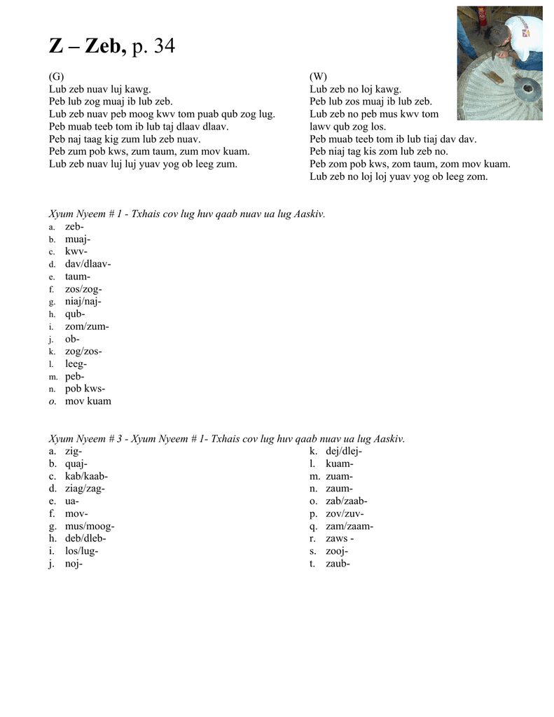Z – Zeb, p. 34 (G) Lub zeb nuav luj kawg. Peb lub zog muaj ib lub zeb. Lub zeb nuav peb moog kwv tom puab qub zog lug. Peb muab teeb tom ib lub taj dlaav dlaav. Peb naj taag kig zum lub zeb nuav. Peb zum pob kws, zum taum, zum mov kuam. Lub zeb nuav luj luj yuav yog ob leeg zum. (W) Lub zeb no loj kawg. Peb lub zos muaj ib lub zeb. Lub zeb no peb mus kwv tom lawv qub zog los. Peb muab teeb tom ib lub tiaj dav dav. Peb niaj tag kis zom lub zeb no. Peb zom pob kws, zom taum, zom mov kuam. Lub zeb no loj loj yuav yog ob leeg zom. Xyum Nyeem # 1 - Txhais cov lug huv qaab nuav ua lug Aaskiv. a. zebb. muajc. kwvd. dav/dlaave. taumf. zos/zogg. niaj/najh. qubi. zom/zumj. obk. zog/zosl. leegm. pebn. pob kwso. mov kuam Xyum Nyeem # 3 - Xyum Nyeem # 1- Txhais cov lug huv qaab nuav ua lug Aaskiv. a. zigk. dej/dlejb. quajl. kuamc. kab/kaabm. zuamd. ziag/zagn. zaume. uao. zab/zaabf. movp. zov/zuvg. mus/moogq. zam/zaamh. deb/dlebr. zaws i. los/lugs. zoojj. nojt. zaub-