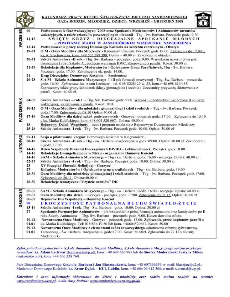 WRZESIEŃ KALENDARZ PRACY RUCHU ŚWIATŁO-ŻYCIE DIECEZJI SANDOMIERSKIEJ OAZA RODZIN, MŁODZIEŻ, DZIECI: WRZESIEŃ – GRUDZIEŃ 2008 06 12-13 13-14 19-21 20-21 21-24 PAŹDZIERNIK 21 26-28 04-05 10-12 17-19 LISTOPAD 18 25-26 07-11 08-10 14-16 14-16 14-16 22-23 23 27 28-30 GRUDZIEŃ 28-30 05-07 05-07 06-07 08 13-14 27 29.1201.01 29.1201.01 Podsumowanie Oaz wakacyjnych '2008 oraz Spotkanie Moderatorów i Animatorów turnusów wakacyjnych, a także członków poszczególnych diakonii - Tbg - św. Barbara. Początek: godz. 9:30 ŚWI ĘTY K R ZYŻ – D I E C E Z JALN E S POTKAN I E M Ł O DYC H – POWITANIE MARYI W JASNOGÓRSKIM WIZERUNKU NAWIEDZENIA Podsumowanie pracy rocznej Domowego Kościoła na szczeblu centralnym - Olsztyn O M - Oaza Modlitwy dla Młodzieży - Radomyśl n/Sanem. Początek godz.17:00. Zgłoszenia do 17.09 u ks. A. Stachowicza, kom. +48 505 288 398. Opłata – 40.00 zł. Zakończenie obiadem. Szkoła Animatora -II rok - Tbg. Św. Barbara – początek: godz. 9.00. Warunkiem uczestnictwa jest: ukończenie I roku Szkoły A., podjęcie wymagań KWC, skierowanie z parafii. Koszt: 30.00 zł. Rekolekcje dla Kapłanów, Moderatorów i Opiekunów Grup Parafialnych, Tbg - Św. Barbara. Początek: godz. 17.00. Zakończenie ok. godz. 14.00. Krąg Diecezjalny Domowego Kościoła – Sandomierz S A M – Szkoła Animatora Muzycznego I i II rok formacji muzycznej - Tbg. Św. Barbara – początek: godz. 16.00. Zgłoszenia: ks. Adam Lechwar – tel. 015/ 8228129 w. 23, kom.:+48 698 626 985. Zapraszamy także grupy scholanek (klasy gimnazjalne i średnie). Uczestnicy przywożą skierowanie z parafii. Koszt: 40.00 zł. Szkoła Animatora – rok I - Tbg. Św. Barbara: godz. 9.00. Warunki uczestnictwa: ukończony II st. oazy wakacyjnej, skierowanie z parafii. Koszt: 30zł. O M - Oaza Modlitwy dla młodzieży gimnazjalnej i szkół średnich – Tbg - św. Barbara. Początek godz.17:00. Zgłoszenia do 08.10 Opłata:40.00 zł. Oaza Modlitwy dla dzieci szkół podstawowych - Gorzyce - początek godz. 17:00. Zgłoszenia do 15.10 u ks. Marka Kulińskiego, kom. +48 604 520 667. Opłata: 40.00 zł Rejonowy Dzień Wspólnoty - czas i program ustala się z Rejonowym Duszpasterzem Młodzieży Szkoła Animatora -I rok - Tbg - św. Barbara. Początek godz. 10:00. Opłata: 30.00 zł Sesja o pilotowaniu kręgów Domowego Kościoła w Księżomierzu Szkoła Animatora -II rok - Tbg - św. Barbara –rozpoczęcie o godz. 09:00. Opłata: 80.00 zł. Zakończenie o godz. 17.00 Dzień Wspólnoty Diakonii Diecezjalnych DWDD – Lublin-Sławinek. Początek godz.18:00 Rekolekcje Ewangelizacyjne w Nisku - organizator Domowy Kościół SAM – Szkoła Animatora Muzycznego - Tbg - św. Barbara, godz. 16:00 - recepcja. Opłata: 40.00 zł. Szkoła Animatora -I rok - Tbg - Św. Barbara. Początek godz. 10:00. Opłata: 30.00 zł. XV Przegląd Piosenki Religijnej - Gorzyce Kolegium Moderatorów i Opiekunów grup parafialnych - Tbg - św. Barbara, godz. 19:00 Oaza Modlitwy dla młodzieży gimnazjalnej i szkół średnich – Tbg - św. Barbara. Początek godz.17:00. Zgłoszenia do 26.11. Opłata:40.00 zł. Rekolekcje tematyczne:”Czyńcie uczniów” DK SAM – Szkoła Animatora Muzycznego - Tbg - św. Barbara. Godz. 16:00 - recepcja. Opłata: 40.00 zł. Oaza Modlitwy dla dzieci - Gorzyce - początek godz. 17:00. Zgłoszenia do 03.12. Opłata: 40.00 zł Rejonowe Dni Wspólnoty – Domowy Kościół U R O C Z Y S T O Ś Ć P A T R O N A L N A R U C H U Ś W I A T Ł O -Ż Y C I E Szkoła Animatora -I rok. Tbg - Św. Barbara - godz. 10:00. Opłata: 30.00 zł Spotkanie Formacyjne Animatorów – dla wszystkich z pełną formacją animatora oraz kandydatów po II roku Szkoły Animatora - Tbg. Św. Barbara – początek: godz. 9.00. Koszt: dowolna ofiara. Noworoczna Oaza Modlitwy – Gorzyce – początek godz. 17.00. Zgłoszenia przez kapłanów parafii u ks. Marka Kulińskiego. Tel: 015/836 10 80 lub kom. +48604520667. Koszt: 50.00 Noworoczna Oaza Modlitwy z elementami tańca towarzyskiego zakończona zabawą sylwestrową. Tarnobrzeg - Św. Barbara. Rozpoczęcie, godz:17.00. Koszt: 50.00zł. Zgłoszenia do 27.12 u Siostry Moderatorki Zgłoszenia do uczestnictwa w Szkole Animatora, Oazach Modlitwy, Szkole Animatora Muzycznego można przekazać e-mailem: ks. Adam Lechwar ([email protected]), kom. +48 698 626 985 lub do Siostry Moderatorki Justyny Mikos ([email protected]), kom. +48 606 238 769. Para Diecezjalna Domowego Kościoła: Barbara i Jan Błaszczukowie, kom. +48 607366959, e- mail: [email protected].; Moderator Domowego Kościoła: ks. Artur Dyjak – KUL Lublin, kom. +48 606 06 612 568, e-mail: [email protected]. Kalendarz i inne informacje skierowane do dzieci i młodzieży oraz rodzin można znaleźć na stronie: www.sandomierz.oaza.pl , a dla Oazy Rodzin: www.sandomierz.oaza.org.pl/dk