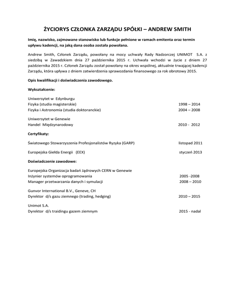 ŻYCIORYS CZŁONKA ZARZĄDU SPÓŁKI – ANDREW SMITH Imię, nazwisko, zajmowane stanowisko lub funkcje pełnione w ramach emitenta oraz termin upływu kadencji, na jaką dana osoba została powołana. Andrew Smith, Członek Zarządu, powołany na mocy uchwały Rady Nadzorczej UNIMOT S.A. z siedzibą w Zawadzkiem dnia 27 października 2015 r. Uchwała wchodzi w życie z dniem 27 października 2015 r. Członek Zarządu został powołany na okres wspólnej, aktualnie trwającej kadencji Zarządu, która upływa z dniem zatwierdzenia sprawozdania finansowego za rok obrotowy 2015. Opis kwalifikacji i doświadczenia zawodowego. Wykształcenie: Uniwersytet w Edynburgu Fizyka (studia magisterskie) Fizyka i Astronomia (studia doktoranckie) 1998 – 2014 2004 – 2008 Uniwersytet w Genewie Handel Międzynarodowy 2010 - 2012 Certyfikaty: Światowego Stowarzyszenia Profesjonalistów Ryzyka (GARP) listopad 2011 Europejska Giełda Energii (EEX) styczeń 2013 Doświadczenie zawodowe: Europejska Organizacja badań Jądrowych CERN w Genewie Inżynier systemów oprogramowania Manager przetwarzania danych i symulacji 2005 -2008 2008 – 2010 Gunvor International B.V., Geneve, CH Dyrektor d/s gazu ziemnego (trading, hedging) 2010 – 2015 Unimot S.A. Dyrektor d/s traidingu gazem ziemnym 2015 - nadal Wskazanie działalności wykonywanej przez daną osobę poza emitentem, gdy działalność ta ma istotne znaczenie dla emitenta. Brak takiej działalności. Wskazanie wszystkich spółek prawa handlowego, w których, w okresie co najmniej ostatnich trzech lat, dana osoba była członkiem organów zarządzających lub nadzorczych albo wspólnikiem, ze wskazaniem, czy dana osoba nadal pełni funkcje w organach lub jest nadal wspólnikiem. Brak takiej działalności Informacje na temat prawomocnych wyroków, na mocy których dana osoba została skazana za przestępstwa oszustwa w okresie co najmniej ostatnich pięciu lat oraz wskazanie, czy w okresie co najmniej ostatnich pięciu lat osoba taka otrzymała sądowy zakaz działania jako członek organów zarządzających lub nadzorczych w spółkach prawa handlowego. Brak. Szczegóły wszystkich przypadków upadłości, zarządu komisarycznego lub likwidacji, w okresie co najmniej ostatnich pięciu lat, w odniesieniu do podmiotów, w których dana osoba pełniła funkcje członka organu zarządzającego lub nadzorczego. Brak Informacja, czy dana osoba prowadzi działalność, która jest konkurencyjna w stosunku do działalności emitenta, oraz czy jest wspólnikiem konkurencyjnej spółki cywilnej lub osobowej albo członkiem organu spółki kapitałowej lub członkiem organu jakiejkolwiek konkurencyjnej osoby prawnej. Brak takiej działalności Informacja, czy dana osoba figuruje w rejestrze dłużników niewypłacalnych, prowadzonym na podstawie ustawy z dnia 20 sierpnia 1997 r. o Krajowym Rejestrze Sądowym. Nie figuruje.