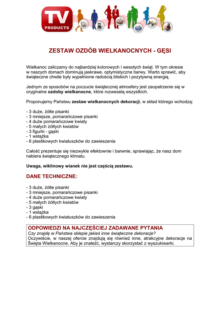 ZESTAW OZDÓB WIELKANOCNYCH - GĘSI Wielkanoc zaliczamy do najbardziej kolorowych i wesołych świąt. W tym okresie w naszych domach dominują jaskrawe, optymistyczne barwy. Warto sprawić, aby świąteczne chwile były wypełnione radością bliskich i pozytywną energią. Jednym ze sposobów na poczucie świątecznej atmosfery jest zaopatrzenie się w oryginalne ozdoby wielkanocne, które rozweselą wszystkich. Proponujemy Państwu zestaw wielkanocnych dekoracji, w skład którego wchodzą: - 3 duże, żółte pisanki - 3 mniejsze, pomarańczowe pisanki - 4 duże pomarańczowe kwiaty - 5 małych żółtych kwiatów - 3 figurki - gąski - 1 wstążka - 6 plastikowych kwiatuszków do zawieszenia Całość prezentuje się niezwykle efektownie i barwnie, sprawiając, że nasz dom nabiera świątecznego klimatu. Uwaga, wiklinowy wianek nie jest częścią zestawu. DANE TECHNICZNE: - 3 duże, żółte pisanki - 3 mniejsze, pomarańczowe pisanki - 4 duże pomarańczowe kwiaty - 5 małych żółtych kwiatów - 3 gąski - 1 wstążka - 6 plastikowych kwiatuszków do zawieszenia ODPOWIEDZI NA NAJCZĘŚCIEJ ZADAWANE PYTANIA Czy znajdę w Państwa sklepie jakieś inne świąteczne dekoracje? Oczywiście, w naszej ofercie znajdują się również inne, atrakcyjne dekoracje na Święta Wielkanocne. Aby je znaleźć, wystarczy skorzystać z wyszukiwarki.