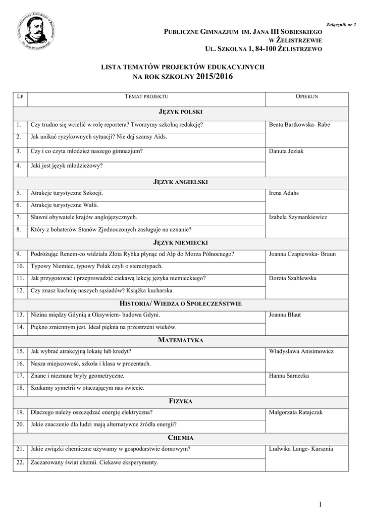 Załącznik nr 2 PUBLICZNE GIMNAZJUM IM. JANA III SOBIESKIEGO W ŻELISTRZEWIE UL. SZKOLNA 1, 84-100 ŻELISTRZEWO LISTA TEMATÓW PROJEKTÓW EDUKACYJNYCH NA ROK SZKOLNY 2015/2016 LP TEMAT PROJEKTU OPIEKUN JĘZYK POLSKI 1. Czy trudno się wcielić w rolę reportera? Tworzymy szkolną redakcję? 2. Jak unikać ryzykownych sytuacji? Nie daj szansy Aids. 3. Czy i co czyta młodzież naszego gimnazjum? 4. Jaki jest język młodzieżowy? Beata Bartkowska- Rabe Danuta Jeziak JĘZYK ANGIELSKI 5. Atrakcje turystyczne Szkocji. Irena Adahs 6. Atrakcje turystyczne Walii. 7. Sławni obywatele krajów anglojęzycznych. 8. Który z bohaterów Stanów Zjednoczonych zasługuje na uznanie? Izabela Szymankiewicz JĘZYK NIEMIECKI 9. Podróżując Renem-co widziała Złota Rybka płynąc od Alp do Morza Północnego? 10. Typowy Niemiec, typowy Polak czyli o stereotypach. 11. Jak przygotować i przeprowadzić ciekawą lekcję języka niemieckiego? 12. Czy znasz kuchnię naszych sąsiadów? Książka kucharska. Joanna Czapiewska- Braun Dorota Szablewska HISTORIA/ WIEDZA O SPOŁECZEŃSTWIE 13. Nizina między Gdynią a Oksywiem- budowa Gdyni. Joanna Błaut 14. Piękno zmiennym jest. Ideał piękna na przestrzeni wieków. MATEMATYKA 15. Jak wybrać atrakcyjną lokatę lub kredyt? 16. Nasza miejscowość, szkoła i klasa w procentach. 17. Znane i nieznane bryły geometryczne. 18. Szukamy symetrii w otaczającym nas świecie. Władysława Anisimowicz Hanna Sarnecka FIZYKA 19. Dlaczego należy oszczędzać energię elektryczna? Małgorzata Ratajczak 20. Jakie znaczenie dla ludzi mają alternatywne źródła energii? CHEMIA 21. Jakie związki chemiczne używamy w gospodarstwie domowym? 22. Zaczarowany świat chemii. Ciekawe eksperymenty. Ludwika Lange- Karsznia 1 Załącznik nr 2 PUBLICZNE GIMNAZJUM IM. JANA III SOBIESKIEGO W ŻELISTRZEWIE UL. SZKOLNA 1, 84-100 ŻELISTRZEWO BIOLOGIA 23. Szata roślinna najbliższej okolicy. 24. Jak obchodzić Dzień Ziemi? Maria Makowska GEOGRAFIA 25 Odyseja umysłu Magdalena Styn- Malinowska PLASTYKA/ ZAJĘCIA ARTYSTYCZNE/MUZYKA 26. Fryderyk Chopin- kompozytor sercu najbliższy. 27. Stanisław Moniuszko- twórca polskiej opery narodowej. Janusz Dubiebniecki INFORMATYKA 28. Nowe technologie wykorzystywane w informatyce, teraźniejszość i przyszłość. 29. Jak przygotować kronikę klasową z wykorzystaniem narzędzi informatycznych. Aneta Wincewicz ZAJĘCIA TECHNICZNE 30. Najwięksi wynalazcy techniki. 31. Zasady zdrowego odżywiania. Katarzyna Bochentin WYCHOWANIE FIZYCZNE 32. Szkolna olimpiada klas I-III Szkoły Podstawowej. 33. Gry i zabawy naszych dziadków. 34. Szkolna olimpiada klas I-III Gimnazjum. 35. Czy warto uczestniczyć w imprezach szkolnych. 36. Szkolna olimpiada klas IV-VI Szkoły Podstawowej. 37. Współzawodnictwo sportowe jako „kuźnia” charakteru. 38. RELIGIA Jak uczniowie gimnazjum obchodzą Święta Bożego Narodzenia. 39. Jacy są ulubieni Święci i Błogosławieni uczniów gimnazjum. Karolina Jaszczur - Nowicka Ryszard Sitkiewicz Magdalena Stromska Dorota Szułczyńska Dyrektor Zespołu Szkół w Żelistrzewie Jolanta Bieszke 2
