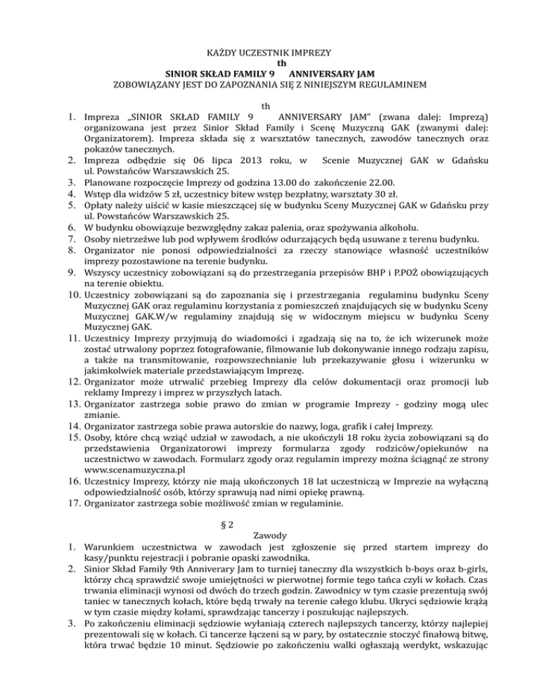 KAŻDY UCZESTNIK IMPREZY th SINIOR SKŁAD FAMILY 9 ANNIVERSARY JAM ZOBOWIĄZANY JEST DO ZAPOZNANIA SIĘ Z NINIEJSZYM REGULAMINEM 1. Impreza „SINIOR SKŁAD FAMILY 9 th ANNIVERSARY JAM” (zwana dalej: Imprezą) organizowana jest przez Sinior Skład Family i Scenę Muzyczną GAK (zwanymi dalej: Organizatorem). Impreza składa się z warsztatów tanecznych, zawodów tanecznych oraz pokazów tanecznych. 2. Impreza odbędzie się 06 lipca 2013 roku, w Scenie Muzycznej GAK w Gdańsku ul. Powstańców Warszawskich 25. 3. Planowane rozpoczęcie Imprezy od godzina 13.00 do zakończenie 22.00. 4. Wstęp dla widzów 5 zł, uczestnicy bitew wstęp bezpłatny, warsztaty 30 zł. 5. Opłaty należy uiścić w kasie mieszczącej się w budynku Sceny Muzycznej GAK w Gdańsku przy ul. Powstańców Warszawskich 25. 6. W budynku obowiązuje bezwzględny zakaz palenia, oraz spożywania alkoholu. 7. Osoby nietrzeźwe lub pod wpływem środków odurzających będą usuwane z terenu budynku. 8. Organizator nie ponosi odpowiedzialności za rzeczy stanowiące własność uczestników imprezy pozostawione na terenie budynku. 9. Wszyscy uczestnicy zobowiązani są do przestrzegania przepisów BHP i P.POŻ obowiązujących na terenie obiektu. 10. Uczestnicy zobowiązani są do zapoznania się i przestrzegania regulaminu budynku Sceny Muzycznej GAK oraz regulaminu korzystania z pomieszczeń znajdujących się w budynku Sceny Muzycznej GAK.W/w regulaminy znajdują się w widocznym miejscu w budynku Sceny Muzycznej GAK. 11. Uczestnicy Imprezy przyjmują do wiadomości i zgadzają się na to, że ich wizerunek może zostać utrwalony poprzez fotografowanie, filmowanie lub dokonywanie innego rodzaju zapisu, a także na transmitowanie, rozpowszechnianie lub przekazywanie głosu i wizerunku w jakimkolwiek materiale przedstawiającym Imprezę. 12. Organizator może utrwalić przebieg Imprezy dla celów dokumentacji oraz promocji lub reklamy Imprezy i imprez w przyszłych latach. 13. Organizator zastrzega sobie prawo do zmian w programie Imprezy - godziny mogą ulec zmianie. 14. Organizator zastrzega sobie prawa autorskie do nazwy, loga, grafik i całej Imprezy. 15. Osoby, które chcą wziąć udział w zawodach, a nie ukończyli 18 roku życia zobowiązani są do przedstawienia Organizatorowi imprezy formularza zgody rodziców/opiekunów na uczestnictwo w zawodach. Formularz zgody oraz regulamin imprezy można ściągnąć ze strony www.scenamuzyczna.pl 16. Uczestnicy Imprezy, którzy nie mają ukończonych 18 lat uczestniczą w Imprezie na wyłączną odpowiedzialność osób, którzy sprawują nad nimi opiekę prawną. 17. Organizator zastrzega sobie możliwość zmian w regulaminie. §2 Zawody 1. Warunkiem uczestnictwa w zawodach jest zgłoszenie się przed startem imprezy do kasy/punktu rejestracji i pobranie opaski zawodnika. 2. Sinior Skład Family 9th Anniverary Jam to turniej taneczny dla wszystkich b-boys oraz b-girls, którzy chcą sprawdzić swoje umiejętności w pierwotnej formie tego tańca czyli w kołach. Czas trwania eliminacji wynosi od dwóch do trzech godzin. Zawodnicy w tym czasie prezentują swój taniec w tanecznych kołach, które będą trwały na terenie całego klubu. Ukryci sędziowie krążą w tym czasie między kołami, sprawdzając tancerzy i poszukując najlepszych. 3. Po zakończeniu eliminacji sędziowie wyłaniają czterech najlepszych tancerzy, którzy najlepiej prezentowali się w kołach. Ci tancerze łączeni są w pary, by ostatecznie stoczyć finałową bitwę, która trwać będzie 10 minut. Sędziowie po zakończeniu walki ogłaszają werdykt, wskazując ręką zwycięzcę. Duet, który wygra zawody otrzymuje specjalne trofeum. 4. Remis – werdykt remisowy następuje, gdy przynajmniej dwóch sędziów nie wskaże ewidentnego zwycięzcy. 5. Ustępstwem jest sytuacja w której przeciwnik nie stawi się do walki, zrezygnuje lub wystąpi nieparzysta liczba uczestników. W takim wypadku uczestnik (uczestnicy), którzy stawią się do walki przechodzą do kolejnej rundy. 6. Walki odbywają się do muzyki granej przez Dj,a. 7. Zabronione jest przeszkadzanie, przerywanie przeciwnikowi. Istotny jest sill. 8. Każdy uczestnik zobowiązany jest do przestrzegania kolejności startowych wyznaczanych na bieżąco przez przedstawicieli Organizatora. Każdy uczestnik zobowiązany jest do przestrzegania zasad fair play. 9. Zawody oceniać będą sędziowie zaproszeni przez Organizatora. Skład sędziowski oraz jego decyzje są niepodważalne. Organizator nie ma wpływu na werdykty, zaś wszelkie wątpliwości, skargi, zażalenia należy kierować bezpośrednio do składu sędziowskiego. 10. Organizatorzy nie odpowiadają za prawa autorskie do utworów ewentualnie naruszone przez uczestników zawodów. 11. Każdy uczestnik zawodów występuje na własną odpowiedzialność. 12. Koszty przejazdu i ubezpieczenia pokrywają uczestnicy zawodów. 13. Organizatorzy nie zapewniają noclegu dla uczestników zawodów. 14. Organizator zastrzega sobie prawo do odwołania zawodów przy niewystarczającej liczbie zgłoszeń. 15. Organizator zastrzega sobie prawo dyskwalifikacji uczestnika zawodów lub uczestników zawodów, które odbędą się podczas Imprezy w przypadku ich niestosownego zachowania w stosunku do sędziów, przedstawicieli Organizatora lub pozostałych uczestników Imprezy lub nieprzestrzegania niniejszego regulaminu. 16. Organizator zapewnia nagrody dla uczestników zawodów. 19. Niniejszy regulamin znajduje się w widocznym miejscu w budynku Sceny Muzycznej GAK oraz na stronie www.scenamuzyczna.pl