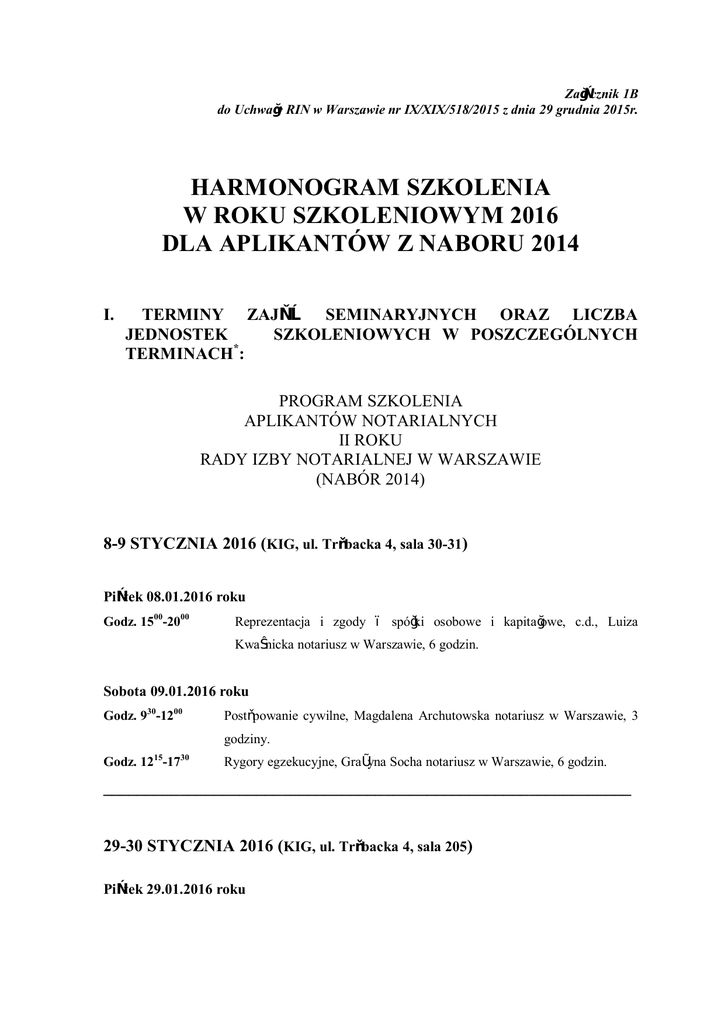 Załącznik 1B do Uchwały RIN w Warszawie nr IX/XIX/518/2015 z dnia 29 grudnia 2015r. HARMONOGRAM SZKOLENIA W ROKU SZKOLENIOWYM 2016 DLA APLIKANTÓW Z NABORU 2014 I. TERMINY ZAJĘĆ SEMINARYJNYCH ORAZ LICZBA JEDNOSTEK SZKOLENIOWYCH W POSZCZEGÓLNYCH * TERMINACH : PROGRAM SZKOLENIA APLIKANTÓW NOTARIALNYCH II ROKU RADY IZBY NOTARIALNEJ W WARSZAWIE (NABÓR 2014) 8-9 STYCZNIA 2016 (KIG, ul. Trębacka 4, sala 30-31) Piątek 08.01.2016 roku Godz. 1500-2000 Reprezentacja i zgody – spółki osobowe i kapitałowe, c.d., Luiza Kwaśnicka notariusz w Warszawie, 6 godzin. Sobota 09.01.2016 roku Godz. 930-1200 Postępowanie cywilne, Magdalena Archutowska notariusz w Warszawie, 3 godziny. Godz. 1215-1730 Rygory egzekucyjne, Grażyna Socha notariusz w Warszawie, 6 godzin. ______________________________________________________________ 29-30 STYCZNIA 2016 (KIG, ul. Trębacka 4, sala 205) Piątek 29.01.2016 roku Godz. 1500-1730 Ochrona danych osobowych, radca prawny Bartłomiej Opaliński, 3 godziny. Godz. 1730-2000 Postępowanie cywilne, Magdalena Archutowska notariusz w Warszawie, 3 godziny. Sobota 30.01.2016 roku Godz. 930-1200 Prawo cywilne – warunek, Wojciech Foruński notariusz w Piasecznie, 3 godziny. Godz. 1215-1445 Ochrona danych osobowych, radca prawny Bartłomiej Opaliński, 3 godziny. Godz. 1500-1730 Księgi wieczyste, Sędzia Sądu Rejonowego Edyta Sornat-Unisk,, 3 godziny. 5-6 LUTEGO 2016 (KIG, ul. Trębacka 4, sala 30-31) Piątek 05.02.2016 roku Godz. 1500-2000 Kodeks spółek handlowych – zagadnienia ogólne, Luiza Kwaśnicka notariusz w Warszawie, 6 godzin. Sobota 06.02.2016 roku Godz. 930-1200 15 Godz. 12 -14 45 Księgi wieczyste, sędzia Sądu Rejonowego Edyta Sornat-Unisk, 3 godziny. Etyka, Tomasz Niedzieński, rzecznik dyscyplinarny Okręgowej Izby Radców Prawnych, 3 godziny. Godz. 1500-1730 Prawo cywilne - zobowiązania, Agnieszka Przybysiak notariusz w Warszawie, 3 godziny. 19-20 LUTEGO 2016 (KIG, ul. Trębacka 4, sala 205) Piątek 19.02.2016 roku Godz. 1500-2000 Umowa spółki z o.o., Luiza Kwaśnicka notariusz w Warszawie, 6 godzin. Sobota 20.02.2016 roku Godz. 930-1200 Prawo cywilne – spadki, dziedziczenie ustawowe, Alicja Janowska, emerytowany notariusz, 3 godziny. Godz. 1215-1730 Księgi wieczyste, Piotr Siciński notariusz w Warszawie, 6 godzin. 26-27 LUTEGO 2016 (KIG, ul. Trębacka 4, sala 205) Piątek 26.02.2016 roku Godz. 1500-2000 Dokumenty w praktyce notarialnej, Ewa Serafin notariusz w Warszawie, 6 godzin. Sobota 27.02.2016 roku Godz. 930-1200 Podatek od spadków i darowizn – Kinga Nałęcz, notariusz w Warszawie, 3 godziny. 15 Godz. 12 -17 30 Księgi wieczyste, Piotr Siciński notariusz w Warszawie, 6 godzin. _______________________________________________________________________________ ___ 4-5 MARCA 2016 (KIG, ul. Trębacka 4, sala 30-31) Piątek 04.03.2016 roku Godz. 1500-2000 Elektroniczna księga wieczysta zmiany w zakresie wniosku wieczystoksięgowego, Piotr Siciński notariusz w Warszawie, 6 godzin. Sobota 05.03.2016 roku Godz. 930-1445 Pełnomocnictwa z zagranicy, dr hab. Paweł Czubik, notariusz w Krakowie, 6 godzin. 11-12 MARCA 2016 (KIG, ul. Trębacka 4, sala 205) Piątek 11.03.2016 roku Godz. 1500-2000 Prawo spółdzielcze – organy spółdzielni i ich uprawnienia, Wojciech Fortuński, notariusz w Piasecznie, 6 godzin. Sobota 12.03.2016 roku Godz. 930-1200 Podatek od czynności cywilnoprawnych, Kinga Nałęcz, notariusz w Warszawie, 3 godziny. Godz. 1215-1730 Pierwokupy, Grażyna Socha notariusz w Warszawie, 6 godzin. 1-2 KWIETNIA 2016 (KIG, ul. Trębacka 4, sala 205) Piątek 01.04.2016 roku Godz. 1500-2000 Prawo rolne, Michał Sawicki, notariusz w Olecku, 6 godzin. Sobota 02.04.2016 roku Godz. 930-1200 Prawo cywilne – spadki: testamenty, Alicja Janowska, emerytowany notariusz, 3 godziny. Godz. 1215-1730 Prawo upadłościowe i restrukturyzacyjne, Katarzyna Uszak, radca prawny, syndyk, 6 godzin. ______________________________________________________________ __ 8-9 KWIETNIA 2016 (KIG, ul. Trębacka 4, sala 30-31) Piątek 08.04.2016 roku Godz. 1500-2000 Prawo rodzinne – opieka i kuratela, Hanna Zbrzeżna–Cąkała notariusz w Warszawie, 6 godzin. Sobota 09.04.2016 roku Godz. 930-1245 Sztuka komunikacji, Maciej Orłoś, 4 godziny. _______________________________________________________________________________ 15-16 KWIETNIA 2016 (KIG, ul. Trębacka 4, sala 205) Piątek 15.04.2016 roku Godz. 1500-2000 Prawo rzeczowe – podsumowanie części ogólnej, warsztaty, Ewa Serafin, notariusz w Warszawie, 6 godzin. Sobota 16.04.2016 roku Godz. 930-1445 Kościelne osoby prawne, Joanna Greguła, notariusz w Krakowie 6 godzin. 6-7 MAJA 2016 r. (KIG, ul. Trębacka 4, sala 30-31) Piątek 13.05.2016 roku Godz. 1500-2000 Prawo handlowe – spółki osobowe a kapitałowe, Luiza Kwaśnicka, 6 godzin. Sobota 14.05.2016 roku Godz. 930-1200 Prawo cywilne – spadki; akty poświadczenia dziedziczenia, Małgorzata Brylewska-Iwańczyk notariusz w Warszawie, 3 godziny. Godz. 1215-1730 Umowy majątkowe małżeńskie i stosunki majątkowe małżeńskie w prawie prywatnym międzynarodowym, dr hab. Paweł Czubik, notariusz w Krakowie, 6 godzin. ______________________________________________________________ 13-14 MAJA 2016 r. (KIG, ul. Trębacka 4, sala 205) Piątek 13.05.2016 roku Godz. 1500-2000 Prawo handlowe – spółki kapitałowe, umowy, statuty, Luiza Kwaśnicka, 6 godzin. Sobota 14.05.2016 roku Godz. 930-1200 Podatek od czynności cywilnoprawnych – podsumowanie, Kinga Nałęcz, notariusz w Warszawie, 3 godziny. 15 Godz. 12 -17 30 Prawo cywilne – zobowiązania: umowa renty i dożywocia, dr hab. Adam Bieranowski, notariusz w Olsztynie, 6 godzin ______________________________________________________________ 10-11 CZERWCA 2016 r. (KIG, ul. Trębacka 4, sala 205) Piątek 10.06.2016 roku Godz. 1500-2000 Prawo o notariacie – podsumowanie i zajęcia praktyczne, notariusz, 6 godzin. Sobota 11.06.2016 roku Godz. 930-1445 Prawo rodzinne – stosunki między rodzicami a