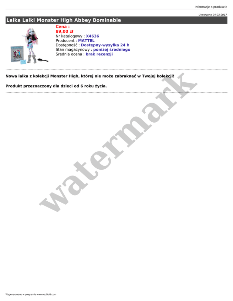 Informacje o produkcie Utworzono 04-03-2017 Lalka Lalki Monster High Abbey Bominable Cena : 89,00 zł Nr katalogowy : X4636 Producent : MATTEL Dostępność : Dostępny-wysyłka 24 h Stan magazynowy : poniżej średniego Średnia ocena : brak recenzji Nowa lalka z kolekcji Monster High, której nie może zabraknąć w Twojej kolekcji! w at er m ar k Produkt przeznaczony dla dzieci od 6 roku życia. Wygenerowano w programie www.oscGold.com