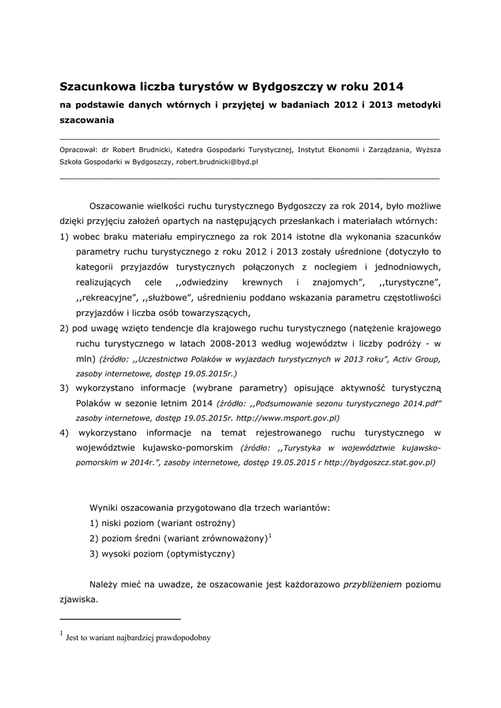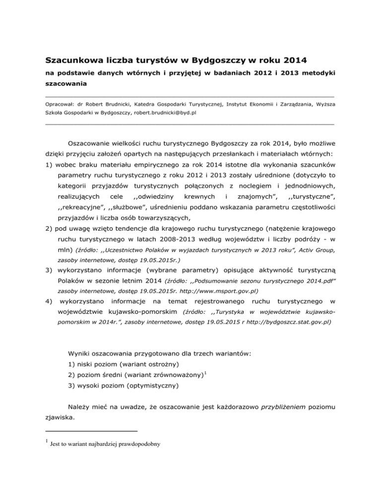 Szacunkowa liczba turystów w Bydgoszczy w roku 2014 na podstawie danych wtórnych i przyjętej w badaniach 2012 i 2013 metodyki szacowania _______________________________________________________________________ Opracował: dr Robert Brudnicki, Katedra Gospodarki Turystycznej, Instytut Ekonomii i Zarządzania, Wyższa Szkoła Gospodarki w Bydgoszczy, [email protected] _______________________________________________________________________ Oszacowanie wielkości ruchu turystycznego Bydgoszczy za rok 2014, było możliwe dzięki przyjęciu założeń opartych na następujących przesłankach i materiałach wtórnych: 1) wobec braku materiału empirycznego za rok 2014 istotne dla wykonania szacunków parametry ruchu turystycznego z roku 2012 i 2013 zostały uśrednione (dotyczyło to kategorii przyjazdów turystycznych połączonych z noclegiem i jednodniowych, realizujących cele ,,odwiedziny krewnych i znajomych”, ,,turystyczne”, ,,rekreacyjne”, ,,służbowe”, uśrednieniu poddano wskazania parametru częstotliwości przyjazdów i liczba osób towarzyszących, 2) pod uwagę wzięto tendencje dla krajowego ruchu turystycznego (natężenie krajowego ruchu turystycznego w latach 2008-2013 według województw i liczby podróży - w mln) (źródło: ,,Uczestnictwo Polaków w wyjazdach turystycznych w 2013 roku”, Activ Group, zasoby internetowe, dostęp 19.05.2015r.) 3) wykorzystano informacje (wybrane parametry) opisujące aktywność turystyczną Polaków w sezonie letnim 2014 (źródło: ,,Podsumowanie sezonu turystycznego 2014.pdf” zasoby internetowe, dostęp 19.05.2015r. http://www.msport.gov.pl) 4) wykorzystano informacje na temat rejestrowanego ruchu turystycznego w województwie kujawsko-pomorskim (źródło: ,,Turystyka w województwie kujawskopomorskim w 2014r.”, zasoby internetowe, dostęp 19.05.2015 r http://bydgoszcz.stat.gov.pl) Wyniki oszacowania przygotowano dla trzech wariantów: 1) niski poziom (wariant ostrożny) 2) poziom średni (wariant zrównoważony) 1 3) wysoki poziom (optymistyczny) Należy mieć na uwadze, że oszacowanie jest każdorazowo przybliżeniem poziomu zjawiska. 1 Jest to wariant najbardziej prawdopodobny Według szacunków sporządzonych dla roku 2014 przyjazdowy ruch turystyczny do Bydgoszczy (przyjazdy turystyczne – co najmniej z jednym noclegiem) mógł osiągnąć poziom: 1) w wariancie ostrożnym – 283006,2 osób, 2) w wariancie zrównoważonym – 401229,1 osób, 3) w wariancie optymistycznym - 495807,4 osób. Badania w roku 2012 i 2013 udokumentowały intensywne zjawisko przyjazdów jednodniowych. Na podstawie przyjętych założeń podjęto próbę oszacowania wielkości ruchu, przy czym wykonane szacunki dotyczą wyłącznie liczby odwiedzających jednodniowych realizujących w Bydgoszczy cele ,,stricte turystyczne” (wakacje, podróż turystyczna) oraz ,,odwiedziny krewnych i znajomych” 2 (w opracowaniu zamieszczono tylko tzw. wariant ostrożny). Według wykonanych obliczeń liczba odwiedzających jednodniowych realizujących cele stricte turystyczne oraz odwiedziny krewnych i znajomych w roku 2014 mogła osiągnąć poziom: 165 914,63 osób. 2 ,, Szacowanie wielkości ruchu turystycznego w konkretnym miejscu i czasie nie jest zadaniem łatwym. Szacunki ogólnej liczby odwiedzających i turystów (odwiedzających bez jednodniowych) możliwe są raczej dla dużych agregatów terytorialnych (województw, dużych aglomeracji) z wykorzystaniem metod niestandardowych, często opierających się na badaniach ankietowych oraz wiedzy ekspertów. W trakcie badań ankietowych można sprecyzować wskaźniki charakteryzujące liczbę turystów jednodniowych, nocujących u znajomych, rodziny a także podjąć próbę oszacowania wielkości „szarej strefy” w turystyce. Dzięki temu, znając wielkość ruchu turystycznego na podstawie sprawozdań KT-1 dokonuje się, metodą wskaźnikową, odpowiednich szacunków pozostałych składowych ruchu turystycznego. Warunkiem stosowania powyższej metody jest dysponowanie odpowiednio dużą liczbą ankiet przeprowadzonych w konkretnym miejscu i czasie (Grabiński T, Słomka Z., Kobus J. 2006)