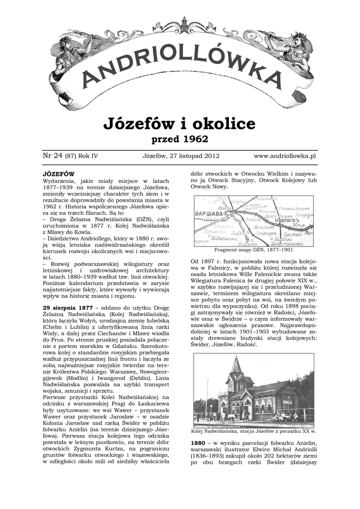 Józefów i okolice przed 1962 Nr 24 (87) Rok IV Józefów, 27 listopad 2012 JÓZEFÓW Wydarzenia, jakie miały miejsce w latach 1877–1939 na terenie dzisiejszego Józefowa, zmieniły wcześniejszy charakter tych ziem i w rezultacie doprowadziły do powstania miasta w 1962 r. Historia współczesnego Józefowa opiera się na trzech filarach. Są to: – Droga Żelazna Nadwiślańska (DŻN), czyli uruchomiona w 1877 r. Kolej Nadwiślańska z Mławy do Kowla. – Dziedzictwo Andriollego, który w 1880 r. swoją wizją letniska nadświdrzańskiego określił kierunek rozwoju okolicznych wsi i miejscowości. – Rozwój podwarszawskiej wilegiatury oraz letniskowej i uzdrowiskowej architektury w latach 1880–1939 wzdłuż tzw. linii otwockiej. Poniższe kalendarium przedstawia w zarysie najistotniejsze fakty, które wywarły i wywierają wpływ na historię miasta i regionu. 29 sierpnia 1877 – oddano do użytku Drogę Żelazną Nadwiślańską (Kolej Nadwiślańską), która łączyła Wołyń, urodzajną ziemię lubelską (Chełm i Lublin) z ufortyfikowaną linią rzeki Wisły, a dalej przez Ciechanów i Mławę wiodła do Prus. Po stronie pruskiej posiadała połączenie z portem morskim w Gdańsku. Szerokotorowa kolej o standardzie rosyjskim przebiegała wzdłuż przypuszczalnej linii frontu i łączyła ze sobą najważniejsze rosyjskie twierdze na terenie Królestwa Polskiego: Warszawę, Nowogieorgijewsk (Modlin) i Iwangorod (Dęblin). Linia Nadwiślańska pozwalała na szybki transport wojska, amunicji i sprzętu. Pierwsze przystanki Kolei Nadwiślańskiej na odcinku z warszawskiej Pragi do Łaskarzewa były usytuowane: we wsi Wawer – przystanek Wawer oraz przystanek Jarosław – w osadzie Kolonia Jarosław nad rzeką Świder w pobliżu folwarku Anielin (na terenie dzisiejszego Józefowa). Pierwsza stacja kolejowa tego odcinka powstała w leśnym pustkowiu, na terenie dóbr otwockich Zygmunta Kurtza, na pograniczu gruntów folwarku otwockiego i wiązowskiego, w odległości około mili od siedziby właściciela www.andriollowka.pl dóbr otwockich w Otwocku Wielkim i nazywano ją Otwock Stacyjny, Otwock Kolejowy lub Otwock Nowy. Fragment mapy DŻN, 1877–1901 Od 1897 r. funkcjonowała nowa stacja kolejowa w Falenicy, w pobliżu której rozwinęła się osada letniskowa Wille Falenickie zwana także Wilegiatura Falenica (w drugiej połowie XIX w., w szybko rozwijającej się i przeludnionej Warszawie, terminem wilegiatura określano miejsce pobytu oraz pobyt na wsi, na świeżym powietrzu dla wypoczynku). Od roku 1898 pociągi zatrzymywały się również w Radości, Józefowie oraz w Świdrze – o czym informowały warszawskie ogłoszenia prasowe. Najprawdopodobniej w latach 1901–1903 wybudowane zostały drewniane budynki stacji kolejowych: Świder, Józefów, Radość. Kolej Nadwiślańska, stacja Józefów z początku XX w. 1880 – w wyniku parcelacji folwarku Anielin, warszawski ilustrator Elwiro Michał Andriolli (1836–1893) zakupił około 202 hektarów ziemi po obu brzegach rzeki Świder (dzisiejszy Otwock i Józefów) i rozpoczął kolonizację nabytych terenów. Wykorzystując bliskość przystanku kolejowego Jarosław i stacji Otwock, realizował własną wizję letniskowej kolonii. Na zakupionym terenie artysta karczował las, wytyczał drogi, bulwar spacerowy wzdłuż rzeki, wzmacniał brzegi rzeki, budował groble, a nawet drewniany most, uprawiał pole, założył ogród owocowy i park. Każdy z nowych domów powstawał według jego projektu i pod jego czujnym okiem i kierunkiem, ale przy współpracy z cieślami z pobliskich miejscowości. Dla wygody właściciela i letnich mieszkańców wille otrzymywały własne nazwy. Od wiosny 1898 r. pojawiły się ogłoszenia w warszawskiej prasie informujące o letnich mieszkaniach do wynajęcia w pobliżu przystanku Józefów położonym przy Kolei Nadwiślańskiej (była to druga stacja kolejowa na terenie dzisiejszego Józefowa). Drewniany budynek tej stacji z charakterystyczną wieżą, podobny był do budynków w Świdrze i w Radości. Został wybudowany najprawdopodobniej w latach 1901–1903. Wejście główne prowadziło do dużej poczekalni i kasy biletowej. Drugie wejście prowadziło do biura zawiadowcy stacji, który na piętrze miał służbowe mieszkanie. 1905–1906 – osadnicy żydowscy zamieszkali w Falenicy. Stacje Kolei Nadwiślańskiej na odcinku Warszawa–Pilawa, 1914 1913 – kupcy żydowscy założyli Towarzystwo Miłośników Letnich Mieszkań zajmujące się sprzedażą gruntów w okolicach przyszłego letniska Michalin. E.M.Andriolli, rysunek, 1880 Z chwilą pojawienia się pierwszych letników u Elwira Michała Andriollego, jego bezpośredni sąsiedzi również zaczęli przystosowywać pomieszczenia swoich chałup do wynajmu. Niebawem w domach wiejskich i willach położonych nad Świdrem zamieszkali goście z miasta. 16 kwietnia 1914 r. na stacji kolei wąskotorowej Wawer nastąpiło otwarcie nowego odcinka Kolei Jabłonowskiej z Wawra do Karczewa. Kolej wąskotorowa na odcinku Jabłonna– Wawer funkcjonowała już od 1901 r. Jej trasa przebiegała z Jabłonny wzdłuż Wisły do stacji Most w Warszawie i dalej przez Kamionek, Grochów i Gocławek do Wawra. Nowe połączenie kolejowe, zwane kolejką lub koleją dojazdową, dzięki licznym przystankom dawało możliwość dogodnego podróżowania do oraz z Warszawy. Odcinek Wawer–Karczew, podobnie jak odcinek Jabłonna–Most, przebiegał równolegle do Kolei Nadwiślańskiej z tą różnicą, że był jeszcze bardziej do niej przybliżony, a na odcinku Wawer– Anin odległość ta nie przekraczała kilkudziesięciu metrów. Fakt ten wzmacniał konkurencyjną pozycję nowego połączenia w stosunku do istniejącej linii Kolei Nadwiślańskiej. Przyczynił się również do budowy nowych willi letniskowych w sąsiedztwie przystanków, a z powodu dużej liczby podróżujących wkrótce zwiększono częstotliwość kursowania pociągów. Fr