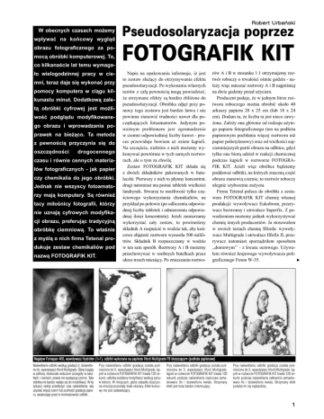 Robert Urbañski W obecnych czasach możemy wpływać na końcowy wygląd obrazu fotograficznego za pomocą obróbki komputerowej. To, co kilkanaście lat temu wymagało wielogodzinnej pracy w ciemni, teraz daje się wykonać przy pomocy komputera w ciągu kilkunastu minut. Dodatkową zaletą obróbki cyfrowej jest możliwość podglądu modyfikowanego obrazu i wprowadzania poprawek na bieżąco. Ta metoda z pewnością przyczynia się do oszczędności drogocennego czasu i równie cennych materiałów fotograficznych - jak papier czy chemikalia do jego obróbki. Jednak nie wszyscy fotoamatorzy mają komputery. Są również tacy miłośnicy fotografii, którzy nie uznają cyfrowych modyfikacji obrazu, preferując tradycyjną obróbkę ciemniową. To właśnie z myślą o nich firma Tetenal produkuje zestaw chemikaliów pod nazwą FOTOGRAFIK KIT. Pseudosolaryzacja poprzez FOTOGRAFIK KIT Napis na opakowaniu informuje, iż jest to zestaw służący do otrzymywania efektu pseudosolaryzacji. Po wykonaniu własnych testów z całą pewnością mogę powiedzieć, że otrzymane efekty są bardzo zbliżone do pseudosolaryzacji. Obróbka zdjęć przy pomocy tego zestawu jest bardzo łatwa i nie powinna stanowić trudności nawet dla początkujących fotoamatorów. Jedynym poważnym problemem jest zgromadzenie w ciemni odpowiedniej liczby kuwet - proces przewiduje bowiem aż osiem kąpieli. Na szczęście, niektóre z nich możemy wykonywać powtórnie w tych samych roztworach, ale o tym za chwilę. Zestaw FOTOGRAFIK KIT składa się z dwóch składników pakowanych w buteleczki. Pierwszy z nich to płynny koncentrat, drugi natomiast ma postać tabletek wielkości landrynek. Stwarza to możliwość tylko częściowego wykorzystania chemikaliów, na przykład po połowie (po odliczeniu odpowiedniej liczby tabletek i odmierzeniu odpowiedniej ilości koncentratu). Jeżeli zamierzamy wykorzystać cały zestaw, to powinniśmy składnik A rozpuścić w wodzie tak, aby końcowa objętość roztworu wynosiła 500 mililitrów. Składnik B rozpuszczamy w wodzie w ten sam sposób. Roztwory A i B możemy przechowywać w osobnych butelkach przez okres trzech miesięcy. Po zmieszaniu roztwo- rów A i B w stosunku 1:1 otrzymujemy roztwór roboczy o trwałości ośmiu godzin - należy więc mieszać roztwory A i B najpóźniej na dwie godziny przed użyciem. Producent podaje, że w jednym litrze roztworu roboczego można obrobić około 40 arkuszy papieru 20 x 25 cm (lub 18 x 24 cm). Dodam tu, że liczba ta jest nieco zawyżona. Zależy ona głównie od rodzaju użytego papieru fotograficznego (ten na podłożu papierowym pochłania więcej roztworu niż papier polietylenowy) oraz od wielkości najciemniejszych partii obrazu na odbitce, gdyż tylko one biorą udział w reakcji chemicznej podczas kąpieli w roztworze FOTOGRAFIK KIT. Jeżeli więc obróbce będziemy poddawać odbitki, na których znaczną część obrazu stanowią czernie, to roztwór roboczy ulegnie szybszemu zużyciu. Firma Tetenal poleca do obróbki z zestawem FOTOGRAFIK KIT chemię własnej produkcji: wywoływacz Eukobrom, przerywacz bezwonny i utrwalacz Superfix. Z powodzeniem możemy jednak wykorzystywać chemię innych producentów. Ja stosowałem w swoich testach chemię Ilforda: wywoływacz Multigrade i utrwalacz Ilfofix II, przerywacz natomiast sporządziłem sposobem ,,domowym’’ - z kwasu octowego. Używałem również krajowego wywoływacza poligraficznego Foton W-35. Negatyw Fomapan 400, wywo³ywacz Hydrofen (1+1), odbitki wykonane na papierze Ilford Multigrade FB b³yszcz¹cym (pod³o¿e papierowe) Naœwietlanie odbitki wed³ug gradacji 2, doœwietlone t³o, wywo³ywacz Ilford Multigrade. Obraz bogaty w pó³tony, doskonale widoczne szczegó³y w œwiat³ach i cieniach, prawie nie wystêpuj¹ czernie. Taka odbitka nie bardzo nadaje siê do modyfikacji. W tej sytuacji nale¿y przed³u¿yæ czas naœwietlania, aby uzyskaæ wiêcej czerni lub podnieœæ gradacjê papieru, zwiêkszaj¹c przez to kontrastowoœæ odbitki . Przy naœwietlaniu odbitki gradacja zosta³a podniesiona do 5, wywo³ywacz Ilford Multigrade, k¹piel w roztworze FOTOGRAFIK KIT trwa³a 120 sekund, odbitka poddana modyfikacji wed³ug opisu w tekœcie. W miejscach, gdzie odpad³a z³uszczona emulsja pozosta³y bia³e obszary. Efekt koñcowy nie jest zadawalaj¹cy. Przy naœwietlaniu odbitki gradacja zosta³a podniesiona do 5, wywo³ywacz Ilford Multigrade, k¹piel w roztworze FOTOGRAFIK KIT trwa³a 120 sekund, podczas naœwietlania czêœciowo zamaskowano t³o i doœwietlono kwiaty. Otrzymany efekt jest teraz bardzo interesuj¹cy. Przy naœwietlaniu odbitki gradacja zosta³a podniesiona do 5, wywo³ywacz Ilford Multigrade, k¹piel w roztworze FOTOGRAFIK KIT trwa³a 120 sekund, podczas naœwietlania ca³kowicie zamaskowano t³o i doœwietlono kwiaty. Otrzymany efekt podoba mi siê najbardziej. 1 Negatyw Fomapan 400, wywo³ywacz Hydrofen (1+1), odbitki wykonane na papierze Ilford Multigrade RC b³yszcz¹cym (pod³o¿e polietylenowe) Naœwietlanie odbitki wed³ug gradacji 2, wywo³ywacz Ilford Multigrade, k¹piel w roztworze FOTOGRAFIK KIT trwa³a 120 sekund, doœwietlano t³o, które uleg³o ca³kowitemu z³uszczeniu. Naœwietlanie odbitki wed³ug gradacji 2, wywo³ywacz Ilford Multigrade, k¹piel w roztworze FOTOGRAFIK KIT trwa³a 120 sekund, po z³uszczeniu emulsji i p³ukaniu odbitkê poddano naœwietlaniu - patrz proces 4 (b) - œwiat³em ¿arówki 60 W przez 15 sekund. Po przygotowaniu wszystkich roztworów roboczych możemy przystąpić do pracy w ciemni. Naświetlamy odbitkę pod powiększalnikiem, a następnie poddajemy ją następującym procesom: 4. Płukanie odbitki w strumieniu bieżącej wody o temperaturze około 20°C. Złuszczona emulsja zaczyna odpadać, możemy jej w tym pomóc pocierając delikatnie powierzchnię odbitki gąbką. Gdy złuszczona emulsja nie chce odejść, spróbujmy podnieść temperaturę wody do 30 40°C. (a) Jeżeli chcemy otrzyma
