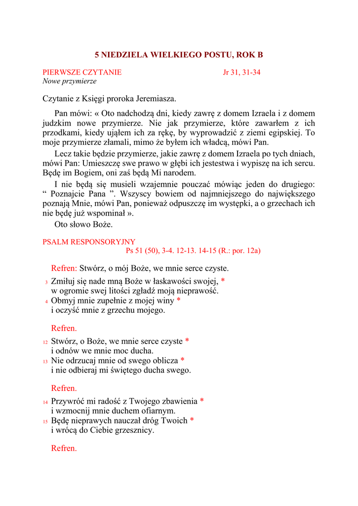 5 NIEDZIELA WIELKIEGO POSTU, ROK B PIERWSZE CZYTANIE Nowe przymierze Jr 31, 31-34 Czytanie z Księgi proroka Jeremiasza. Pan mówi: « Oto nadchodzą dni, kiedy zawrę z domem Izraela i z domem judzkim nowe przymierze. Nie jak przymierze, które zawarłem z ich przodkami, kiedy ująłem ich za rękę, by wyprowadzić z ziemi egipskiej. To moje przymierze złamali, mimo że byłem ich władcą, mówi Pan. Lecz takie będzie przymierze, jakie zawrę z domem Izraela po tych dniach, mówi Pan: Umieszczę swe prawo w głębi ich jestestwa i wypiszę na ich sercu. Będę im Bogiem, oni zaś będą Mi narodem. I nie będą się musieli wzajemnie pouczać mówiąc jeden do drugiego: “ Poznajcie Pana ”. Wszyscy bowiem od najmniejszego do największego poznają Mnie, mówi Pan, ponieważ odpuszczę im występki, a o grzechach ich nie będę już wspominał ». Oto słowo Boże. PSALM RESPONSORYJNY Ps 51 (50), 3-4. 12-13. 14-15 (R.: por. 12a) 3 4 12 13 14 15 Refren: Stwórz, o mój Boże, we mnie serce czyste. Zmiłuj się nade mną Boże w łaskawości swojej, * w ogromie swej litości zgładź moją nieprawość. Obmyj mnie zupełnie z mojej winy * i oczyść mnie z grzechu mojego. Refren. Stwórz, o Boże, we mnie serce czyste * i odnów we mnie moc ducha. Nie odrzucaj mnie od swego oblicza * i nie odbieraj mi świętego ducha swego. Refren. Przywróć mi radość z Twojego zbawienia * i wzmocnij mnie duchem ofiarnym. Będę nieprawych nauczał dróg Twoich * i wrócą do Ciebie grzesznicy. Refren. DRUGIE CZYTANIE Chrystus stał się sprawcą zbawienia wiecznego Hbr 5, 7-9 Czytanie z Listu do Hebrajczyków Bracia: Chrystus głośnym wołaniem i płaczem za dni ciała swego zanosił gorące prośby do Tego, który mógł Go wybawić od śmierci, i został wysłuchany dzięki swej uległości. A chociaż był Synem, nauczył się posłuszeństwa przez to, co wycierpiał. A gdy wszystko wykonał, stał się sprawcą zbawienia wiecznego dla wszystkich, którzy Go słuchają. Oto słowo Boże. ŚPIEW PRZED EWANGELIĄ J 12, 26 Aklamacja: Chwała Tobie, Słowo Boże. Kto by chciał Mi służyć, niech idzie za Mną; a gdzie Ja jestem, tam będzie i mój sługa. Aklamacja: Chwała Tobie, Słowo Boże. EWANGELIA Ziarno, które wpadłszy w ziemię obumrze, przynosi plon obfity J 12, 20-33 Słowa Ewangelii według świętego Jana. Wśród tych, którzy przybyli, aby oddać pokłon Bogu w czasie święta, byli też niektórzy Grecy. Oni więc przystąpili do Filipa, pochodzącego z Betsaidy Galilejskiej, i prosili go, mówiąc: « Panie, chcemy ujrzeć Jezusa ». Filip poszedł i powiedział Andrzejowi. Z kolei Andrzej i Filip poszli i powiedzieli Jezusowi. A Jezus dał im taką odpowiedź: « Nadeszła godzina, aby został uwielbiony Syn Człowieczy. Zaprawdę, zaprawdę powiadam wam: Jeżeli ziarno pszenicy wpadłszy w ziemię nie obumrze, zostanie tylko samo, ale jeżeli obumrze, przynosi plon obfity. Ten, kto miłuje swoje życie, traci je, a kto nienawidzi swego życia na tym świecie, zachowa je na życie wieczne. A kto by chciał Mi służyć, niech idzie za Mną, a gdzie Ja jestem, tam będzie i mój sługa. A jeśli ktoś Mi służy, uczci go mój Ojciec. Teraz dusza moja doznała lęku i cóż mam powiedzieć? Ojcze, wybaw Mnie od tej godziny. Nie, właśnie dlatego przyszedłem na tę godzinę. Ojcze, uwielbij imię Twoje ». Wtem rozległ się głos z nieba: « I uwielbiłem i znowu uwielbię ». Tłum stojący usłyszał to i mówił: « Zagrzmiało! » Inni mówili: « Anioł przemówił do Niego ». Na to rzekł Jezus: « Głos ten rozległ się nie ze względu na Mnie, ale ze względu na was. Teraz odbywa się sąd nad tym światem. Teraz władca tego świata zostanie precz wyrzucony. A Ja, gdy zostanę nad ziemię wywyższony, przyciągnę wszystkich do siebie ». To powiedział zaznaczając, jaką śmiercią miał umrzeć. Oto słowo Pańskie.