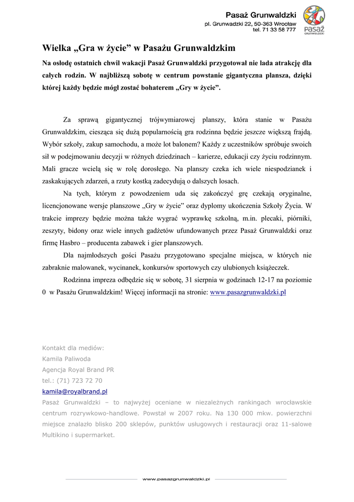 Wielka „Gra w życie” w Pasażu Grunwaldzkim Na osłodę ostatnich chwil wakacji Pasaż Grunwaldzki przygotował nie lada atrakcję dla całych rodzin. W najbliższą sobotę w centrum powstanie gigantyczna plansza, dzięki której każdy będzie mógł zostać bohaterem „Gry w życie”. Za sprawą gigantycznej trójwymiarowej planszy, która stanie w Pasażu Grunwaldzkim, ciesząca się dużą popularnością gra rodzinna będzie jeszcze większą frajdą. Wybór szkoły, zakup samochodu, a może lot balonem? Każdy z uczestników spróbuje swoich sił w podejmowaniu decyzji w różnych dziedzinach – karierze, edukacji czy życiu rodzinnym. Mali gracze wcielą się w rolę dorosłego. Na planszy czeka ich wiele niespodzianek i zaskakujących zdarzeń, a rzuty kostką zadecydują o dalszych losach. Na tych, którym z powodzeniem uda się zakończyć grę czekają oryginalne, licencjonowane wersje planszowe „Gry w życie” oraz dyplomy ukończenia Szkoły Życia. W trakcie imprezy będzie można także wygrać wyprawkę szkolną, m.in. plecaki, piórniki, zeszyty, bidony oraz wiele innych gadżetów ufundowanych przez Pasaż Grunwaldzki oraz firmę Hasbro – producenta zabawek i gier planszowych. Dla najmłodszych gości Pasażu przygotowano specjalne miejsca, w których nie zabraknie malowanek, wycinanek, konkursów sportowych czy ulubionych książeczek. Rodzinna impreza odbędzie się w sobotę, 31 sierpnia w godzinach 12-17 na poziomie 0 w Pasażu Grunwaldzkim! Więcej informacji na stronie: www.pasazgrunwaldzki.pl Kontakt dla mediów: Kamila Paliwoda Agencja Royal Brand PR tel.: (71) 723 72 70 [email protected] Pasaż Grunwaldzki – to najwyżej oceniane w niezależnych rankingach wrocławskie centrum rozrywkowo-handlowe. Powstał w 2007 roku. Na 130 000 mkw. powierzchni miejsce znalazło blisko 200 sklepów, punktów usługowych i restauracji oraz 11-salowe Multikino i supermarket.
