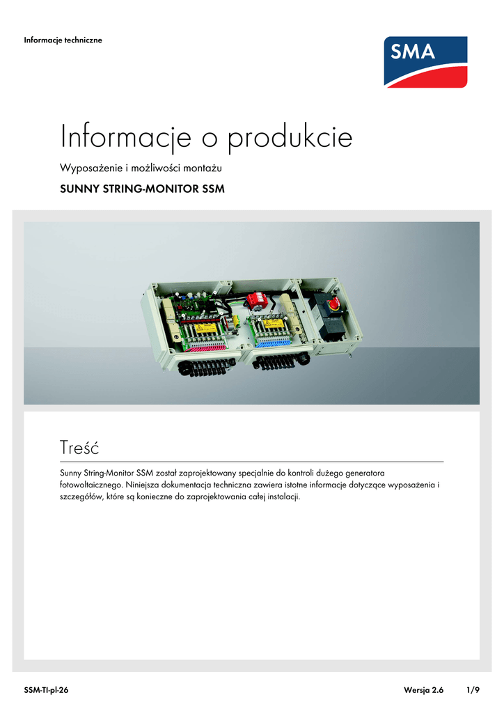 Informacje techniczne Informacje o produkcie Wyposażenie i możliwości montażu SUNNY STRING-MONITOR SSM Treść Sunny String-Monitor SSM został zaprojektowany specjalnie do kontroli dużego generatora fotowoltaicznego. Niniejsza dokumentacja techniczna zawiera istotne informacje dotyczące wyposażenia i szczegółów, które są konieczne do zaprojektowania całej instalacji. SSM-TI-pl-26 Wersja 2.6 1/9 Informacje techniczne Informacje o produkcie 1 Informacje o produkcie • Firma SMA Solar Technology dzięki Sunny String-Monitor SSM oferuje dokładne urządzenie do kontroli dużych generatorów fotowoltaicznych. • Poprzez pomiar i porównanie poszczególnych pasm prądu usterki generatora fotowoltaicznego są rozpoznawane w sposób niezawodny i analizowane bezpośrednio przez Sunny Central Control. • Sunny String-Monitor SSM oprócz pomiaru poszczególnych pasm umożliwia zabezpieczenie pasm po stronie dodatniej i ujemnej oraz zabezpieczenie antyprzepięciowe. • W przypadku uziemionych generatorów fotowoltaicznych Sunny String-Monitor SSM może zostać wyposażony w szynę zbiorczą o potencjale dodatnim lub ujemnym. • Sunny String-Monitor SSM dysponuje 8 kanałami pomiarowymi, do których można podłączyć bezpośrednio 8 lub 16 pasm. • Sunny String-Monitor SSM można odłączyć przy pomocy wyłącznika mocy po stronie zejścia w stronę przemiennika częstotliwości. Wyłącznik mocy jest dostępny opcjonalnie, a zamówić go można w firmie SMA Solar Technology. 2 Dane techniczne Obudowa Możliwość montażu na zewnątrz* Odporność na promieniowanie UV Materiał Palność Kolor Izolacja ochronna Tak, tylko w cieniu Tak Poliwęglan Samogasnąca, niezawierająca halogenów Szary Tak * Średnica otworów do zawieszenia 6,5 mm Wymiary i masa Obudowa bez wyłącznika DC, długość x wysokość x szerokość Obudowa z wyłącznikiem DC, długość x wysokość x szerokość Masa bez wyłącznika prądu stałego Masa z wyłącznikiem DC SMA Solar Technology AG 795 mm x 400 mm x 230 mm 1.050 mm x 400 mm x 230 mm 13 kg 16 kg 2/9 Informacje techniczne Dane techniczne Dane ogólne Wyłącznik mocy DC* Stopień zanieczyszczenia wg DIN EN 50178:1997 130 ADC 2 * Napęd bezpośredni Parametry wejściowe Maksymalne dopuszczalne napięcie DC, UDC, max, przy L/R o wartości 2 ms Maksymalny dopuszczalny prąd DC, IDC, max Liczba wejść pomiarowych Maksymalna liczba złączy na wejście pomiarowe Możliwe bezpieczniki pasm Maksymalny prąd pasmowy na wejście pomiarowe przy bezpieczniku pasma 10 A Maksymalny prąd pasmowy na wejście pomiarowe przy bezpieczniku pasma 12 A Maksymalny prąd pasmowy na wejście pomiarowe przy bezpieczniku pasma 16 A Maksymalny prąd pasmowy na wejście pomiarowe przy bezpieczniku pasma 20 A Maksymalny prąd pasmowy na wejście pomiarowe przy bezpieczniku pasma 25 A Zasilanie napięciem pomiarowym SMA Solar Technology AG 1.000 V 950 V w przypadku bezpiecznika 25 A 130 A 8 2, opcja 10 A/12 A/16 A/20 A/25 A 7 A, współczynnik redukcji 0,7 8,4 A, współczynnik redukcji 0,7 11,2 A, współczynnik redukcji 0,7 14 A, współczynnik redukcji 0,7 16,25 A, współczynnik redukcji 0,65 35 ... 55 VDC 3/9 Informacje techniczne Dane techniczne Strefa przyłączy Przyłącze główne prądu stałego* Przyłącze pasma DC** Przyłącze uziemienia*** Złącze RS485 i zasilanie napięciem pomiarowym**** Jarzmo zaciskowe ekranu***** Zacisk sworzniowy SUNCLIX/MC3/MC4/Tyco/zacisk sprężynowy Zacisk przewodu ochronnego Zacisk przelotowy 4-przewodowy 2 * Do 150 mm²: moment obrotowy 10 - 12 Nm, średnica sworznia M10, złącze śrubowe M40, strefa szczelności 13 - 26 mm. ** SUNCLIX: używać tylko przewodów PV1-F, przekrój kabla 2,5 …6 mm², średnica przewodu 5 … 8 mm; MC3: przekrój kabla 4 mm²; MC4: przekrój kabla 6 mm²; Tyco: przekrój kabla 4 mm²; zacisk sprężynowy: strefa zacisku 0,2 - 6 mm², wpust kablowy przez złącze śrubowe kabla M32, przelotka kablowa 3 x 5 mm/ 3 x 7 mm/ 3 x 9 mm. *** Maksymalny przekrój kabla 35 mm². Wpust kablowy przez złącze śrubowe kabla M25 z jedną strefą zacisku 7 - 14 mm. **** Przekrój kabla przy zacisku sprężynowym: 0,08 - 2,5 mm2. Wpust kablowy przez złącze śrubowe kabla M25 z jedną strefą zacisku 7 - 14 mm. Zalecany typ kabla: 4 x 2 x 0,5 mm Li2YCYv (TP) ***** Przekrój ekranu, maksymalnie 8 mm Zdalne wyzwolenie za pomocą wyzwalacza prądu roboczego (opcja) Napięcie znamionowe Rozszerzony zakres roboczy Częstotliwość znamionowa Pobór mocy 220 … 240 VAC –30% … +10% 50 Hz/ 60 Hz 100 VA Zdalne wyzwolenie za pomocą wyzwalacza podnapięciowego (opcja) Napięcie znamionowe Rozszerzony zakres roboczy Częstotliwość znamionowa Pobór mocy 220 … 240 VAC –15% … +10% 50 Hz/ 60 Hz 3 VA Zestyk sygnału zwrotnego w przypadku zdalnego wyzwolenia (opcja) Napięcie znamionowe Prąd znamionowy Wersja SMA Solar Technology AG 250 VAC/DC 5 AAC/ 0,15 ADC 1 x zestyk przełączny 4/9 Informacje techniczne Dane techniczne Stopień ochrony i warunki otoczenia Rodzaj ochrony według EN 60529 Dopuszczalne temperatury otoczenia Względna wilgotność powietrza Maksymalna wysokość nad poziomem morza, (n.p.m.) IP 54 –25 °C … +40 °C 15% … 95% 1.000 m Złącza Komunikacja Kontrolowany ochronnik przepięciowy typu II Pomiar prądów pasmowych RS485, 19200 b/s Tak Tak Standardy Deklaracja zgodności WE EMV Tak EN 61000-6-2, EN 61000-6-4 Strefa zacisku zacisków sprężynowych Jeśli przy zaciskach sprężynowych stosowane są końcówki kablowe typu "Cage Clamp", nie wolno stosować kabli przyłączeniowych przeznaczonych do maksymalnego dozwolonego przekroju normatywnego zacisku. Należy wybrać najbliższy mniejszy przekrój. Zasilanie napięciem pomiarowym Zasilanie napięciem pomiarowym oraz przyłącze interfejsu należy poprowadzić jednym kablem. Odpowiedni typ kabla musi składać się z ośmiu żył o minimalnym przekroju 0,5 mm2. Ekran kabla należy założyć na dostępne szyny ekranów w prze