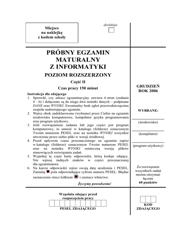 dysleksja Miejsce na naklejk z kodem szko%y PRÓBNY EGZAMIN MATURALNY Z INFORMATYKI POZIOM ROZSZERZONY Cz !" II Czas pracy 150 minut GRUDZIE$ ROK 2006 Instrukcja dla zdaj#cego 1. Sprawd , czy arkusz egzaminacyjny zawiera 6 stron (zadania 4 – 6) i do!"czone s" do niego dwa no#niki danych – podpisane DANE oraz WYNIKI. Ewentualny brak zg!o# przewodnicz"cemu zespo!u nadzoruj"cego egzamin. WYBRANE: 2. Wpisz obok zadeklarowane (wybrane) przez Ciebie na egzamin #rodowisko komputerowe, kompilator j$zyka programowania ................................... oraz program u%ytkowy. (#rodowisko) 3. Je#li rozwi"zaniem zadania lub jego cz$#ci jest program komputerowy, to umie#& w katalogu (folderze) oznaczonym ................................... Twoim numerem PESEL oraz na no#niku WYNIKI wszystkie (kompilator) utworzone przez siebie pliki w wersji ród!owej. 4. Przed up!ywem czasu przeznaczonego na egzamin zapisz ................................... w katalogu (folderze) oznaczonym Twoim numerem PESEL (program u%ytkowy) oraz na no#niku WYNIKI ostateczn" wersj$ plików stanowi"cych rozwi"zania zada'. 5. Wype!nij t$ cz$#& karty odpowiedzi, któr" koduje zdaj"cy. Nie wpisuj %adnych znaków w cz$#ci przeznaczonej dla egzaminatora. Za rozwi"zanie 6. Na karcie odpowiedzi wpisz swoj" dat$ urodzenia i PESEL. wszystkich zada' Zamaluj pola odpowiadaj"ce cyfrom numeru PESEL. B!$dne mo%na otrzyma& zaznaczenie otocz kó!kiem i zaznacz w!a#ciwe. !"cznie 60 punktów yczymy powodzenia! Wype%nia zdaj#cy przed rozpocz ciem pracy PESEL ZDAJ&CEGO KOD ZDAJ&CEGO Próbny egzamin maturalny z informatyki Poziom rozszerzony – cz !" II 4 Zadanie 5. Hurtownia (20 pkt) Hurtownia pomidorów by!a zaopatrywana w towar przez trzy szklarnie. W pliku tekstowym szklarnia_1.txt zawarta jest informacja o wielko#ci dostaw pomidorów zrealizowanych przez szklarni$ nr 1 w okresie od 1 kwietnia do 30 czerwca 2004 roku. Ka%dy wiersz pliku zawiera dat$ oraz wielko#& zrealizowanej w danym dniu dostawy (okre#lon" w kilogramach). Pliki tekstowe szklarnia_2.txt oraz szklarnia_3.txt zawieraj" analogiczne informacje o wielko#ciach dostaw zrealizowanych przez szklarni$ nr 2 i szklarni$ nr 3. Podpisana umowa z w!a#cicielami szklarni okre#la!a, %e ka%dy z nich powinien codziennie dostarczy& do hurtowni minimum 1000 kg pomidorów. Je#li dostawy w danym dniu by!y mniejsze, to w!a#ciciel szklarni p!aci! kar$ w wysoko#ci 100 z! (co oznacza, %e jego dochód by! pomniejszany w tym dniu o 100 z!). W!a#ciciele szklarni otrzymywali po 2 z! za ka%dy 1 kilogram dostarczonych pomidorów. Wykonaj nast$puj"ce polecenia: a) Podaj #redni miesi$czny dochód ka%dego z w!a#cicieli szklarni. (redni miesi$czny dochód w!a#ciciela szklarni nr 1 wynosi .................. z!. (redni miesi$czny dochód w!a#ciciela szklarni nr 2 wynosi ................... z!. (redni miesi$czny dochód w!a#ciciela szklarni nr 3 wynosi ................... z!. b) Przedstaw wykres obrazuj"cy miesi$czne udzia!y nale%no#ci dla poszczególnych w!a#cicieli szklarni w wydatkach hurtowni w kwietniu, maju i czerwcu 2004 roku. Za!ó%, %e wydatki hurtowni sk!ada!y si$ tylko z p!atno#ci dla dostawców pomidorów. Hurtownia by!a w stanie pomie#ci& jednorazowo 20 ton pomidorów. W ka%dym tygodniu, codziennie od poniedzia!ku do pi"tku, przyje%d%a! samochód po 5 ton pomidorów. Pomidory dostarczane by!y do hurtowni przed po!udniem (zgodnie z danymi w plikach), a zabierane do sklepów po po!udniu. Je#li w hurtowni by!o mniej ni% 5 ton pomidorów, to samochód zabiera! ca!y zapas. Je#li w hurtowni brakowa!o miejsca na dostarczone danego dnia pomidory, to nadmiar by! przetwarzany na sok. 1 kwietnia 2004 roku rano w hurtowni znajdowa!o si$ 8 ton pomidorów. Analizy ilo#ci towaru dokonywano codziennie w po!udnie (po dostawie pomidorów) i wieczorem (po zabraniu przez samochód). c) Dokonaj odpowiednich oblicze' i podaj prawid!ow" odpowied , wpisuj"c w trzeciej kolumnie s!owo TAK lub NIE. Je#li wpisa!e# TAK w punktach A lub B, to wpisz w!a#ciw" dat$. Dnia ........................................... po raz pierwszy wieczorem hurtownia A by!a pusta po zabraniu pomidorów przez samochód. B C Dnia ........................................... po raz pierwszy zabrak!o miejsca w hurtowni na dostarczone pomidory. Przez ca!y okres obserwacji nie wyst"pi!a %adna z wy%ej wymienionych sytuacji. Próbny egzamin maturalny z informatyki Poziom rozszerzony – cz !" II 5 Do oceny oddajesz plik(i) o nazwie ............................................................................................ tu wpisz nazw$ pliku(ów) zawieraj"cy(e) komputerowe realizacje Twoich oblicze' dla podpunktów a) i c) oraz wykres do podpunktu b). Punktacja Cz !ci zadania a b c Razem Maks. 8 5 7 20 Zadanie 6. Dodawanie liczb trójkowych (20 pkt) W plikach pary_1.txt i pary_2.txt znajduje si$ po 50 par dodatnich liczb ca!kowitych zapisanych w systemie trójkowym – w ka%dym wierszu jedna para liczb rozdzielonych znakiem odst$pu. Ka%da z liczb ma co najwy%ej 64 cyfry. Napisz program, który dla ka%dej pary liczb wczytanej z pliku pary_j.txt, gdzie j = 1, 2, obliczy ich sum$ i wynik zapisze w systemie trójkowym w pliku wyniki_j.txt, gdzie j = 1, 2 – jedna suma w jednym wierszu i bez nieznacz"cych zer. Liczba w i-tym wierszu pliku wyniki_j.txt powinna by& sum" liczb z i-tego wiersza pliku pary_j.txt. Przyk%ad Gdyby plik pary_j.txt zawiera! tylko 2 pary liczb: 12 1 22 10 to plik wyniki_j.txt mia!by posta&: 20 102 Do oceny oddajesz pliki wyniki_1.txt i wyniki_2.txt oraz plik o nazwie ................................................................................ zawieraj"cy pe!ny kod ród!owy programu. tu wpisz nazw$ pliku Punktacja Zadanie Razem Maks. 20