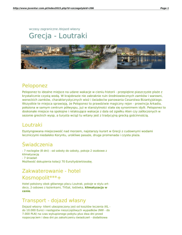 http://www.juventur.com.pl/index2015.php?d=szczegoly&id=206 Page 1 wczasy zagraniczne /dojazd własny Grecja - Loutraki Peloponez Peloponez to idealne miejsce na udane wakacje w cieniu historii - przepiękne piaszczyste plaże z krystalicznie czystą wodą. W krajobrazie nie zabraknie ruin średniowiecznych zamków i warowni, weneckich zamków, charakterystycznych wież i świadectw panowania Cesarstwa Bizantyjskiego. Wszystkie te miejsca sprawiają, że Peloponez to prawdziwie magiczny rejon - prowincja Arkadia, położona w samym centrum półwyspu, już w starożytności stała się synonimem idylli. Peloponez to doskonałe miejsce na spokojne i relaksujące wakacje z dala od zgiełku Aten czy zatłoczonych w sezonie greckich wysp, a turysta wciąż tu witany jest z tradycyjną grecką gościnnością. Loutraki Dystyngowana miejscowość nad morzem, najstarszy kurort w Grecji z cudownymi wodami leczniczymi niedaleko Koryntu, urokliwe pasaże, druga promenada i czysta plaża. Świadczenia - 7 noclegów (8 dni) - od soboty do soboty, pokoje 2 osobowe z klimatyzacją - 7 śniadań Możliwość dokupienia kolacji 70 Euro/tydzień/osobę. Zakwaterowanie - hotel Kosmopolit***+ Hotel położony obok głównego placu Loutrak, pokoje w stylu artdeco, 2-sobowe z łazienkami, TVSat, lodówka, klimatyzacja w cenie. Transport - dojazd własny Dojazd własny- klient ubezpieczony jest od kosztów leczenia (KL do 10.000 Euro) i następstw nieszczęśliwych wypadków (NW - do 7.000 PLN) na czas wykupionego pobytu plus dwa dni przed rozpoczęciem i dwa dni po zakończeniu świadczeń - dodatkowa http://www.juventur.com.pl/index2015.php?d=szczegoly&id=206 Page 2 zapłata - 40 zł/os./turnus nr grupy termin 1 m-ce w pok. 2-os. GRT-01/16 07.05-14.05.16 SPRZED. SPRZED. GRT-02/16 14.05-21.06.16 SPRZED. SPRZED. GRT-03/16 21.05-28.05.16 SPRZED. SPRZED. GRT-04/16 28.05-04.06.16 SPRZED. SPRZED. GRT-05/16 04.06-11.06.16 SPRZED. SPRZED. GRT-06/16 11.06-18.06.16 SPRZED. SPRZED. GRT-07/16 18.06-25.06.16 SPRZED. SPRZED. GRT-08/16 25.06-02.07.16 SPRZED. SPRZED. GRT-09/16 02.07-09.07.16 SPRZED. SPRZED. GRT-10/16 09.07-16.07.16 1 190,- ZAREZERWUJ GRT-11/16 16.07-23.07.16 1 190,- ZAREZERWUJ GRT-12/16 23.07-30.07.16 1 190,- ZAREZERWUJ GRT-13/16 30.07-06.08.16 1 190,- ZAREZERWUJ GRT-14/16 06.08-13.08.16 1 190,- ZAREZERWUJ GRT-15/16 13.08-20.08.16 1 190,- ZAREZERWUJ GRT-16/16 20.08-27.08.16 1 190,- ZAREZERWUJ GRT-17/16 27.08-03.09.16 990,- ZAREZERWUJ GRT-18/16 03.09-10.09.16 990,- ZAREZERWUJ GRT-19/16 10.09-17.09.16 990,- ZAREZERWUJ GRT-20/16 17.09-24.09.16 990,- ZAREZERWUJ 1. Dopłata do kolacji w hotelu - 70 Euro/tydzień/os.
