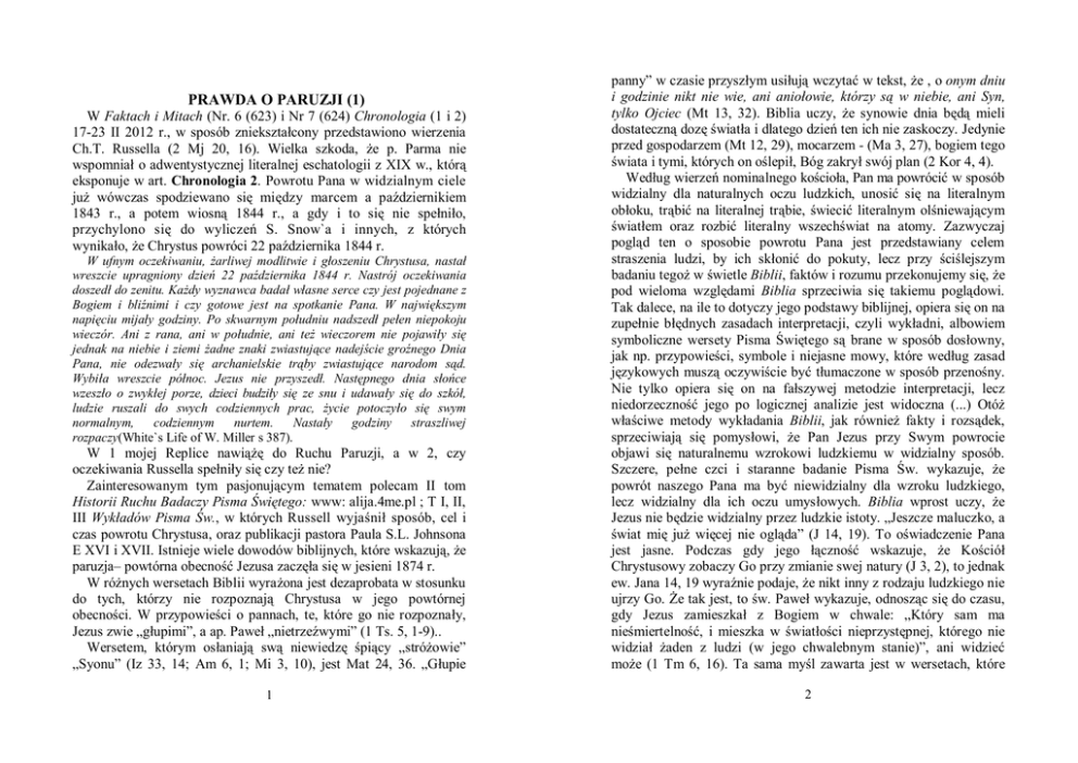 W 1 mojej Replice nawi do Ruchu Paruzji, a w 2, czy oczekiwania Russella spe ni y si czy te nie? Zainteresowanym tym pasjonuj cym tematem polecam II tom Historii Ruchu Badaczy Pisma wi tego: www: alija.4me.pl ; T I, II, III Wyk adów Pisma w., w których Russell wyja ni sposób, cel i czas powrotu Chrystusa, oraz publikacji pastora Paula S.L. Johnsona E XVI i XVII. Istnieje wiele dowodów biblijnych, które wskazuj , e paruzja– powtórna obecno Jezusa zacz a si w jesieni 1874 r. W ró nych wersetach Biblii wyra ona jest dezaprobata w stosunku do tych, którzy nie rozpoznaj Chrystusa w jego powtórnej obecno ci. W przypowie ci o pannach, te, które go nie rozpozna y, Jezus zwie „g upimi”, a ap. Pawe „nietrze wymi” (1 Ts. 5, 1-9).. Wersetem, którym os aniaj sw niewiedz pi cy „stró owie” „Syonu” (Iz 33, 14; Am 6, 1; Mi 3, 10), jest Mat 24, 36. „G upie panny” w czasie przysz ym usi uj wczyta w tekst, e , o onym dniu i godzinie nikt nie wie, ani anio owie, którzy s w niebie, ani Syn, tylko Ojciec (Mt 13, 32). Biblia uczy, e synowie dnia b mieli dostateczn doz wiat a i dlatego dzie ten ich nie zaskoczy. Jedynie przed gospodarzem (Mt 12, 29), mocarzem - (Ma 3, 27), bogiem tego wiata i tymi, których on o lepi , Bóg zakry swój plan (2 Kor 4, 4). Wed ug wierze nominalnego ko cio a, Pan ma powróci w sposób widzialny dla naturalnych oczu ludzkich, unosi si na literalnym ob oku, tr bi na literalnej tr bie, wieci literalnym ol niewaj cym wiat em oraz rozbi literalny wszech wiat na atomy. Zazwyczaj pogl d ten o sposobie powrotu Pana jest przedstawiany celem straszenia ludzi, by ich sk oni do pokuty, lecz przy ci lejszym badaniu tego w wietle Biblii, faktów i rozumu przekonujemy si , e pod wieloma wzgl dami Biblia sprzeciwia si takiemu pogl dowi. Tak dalece, na ile to dotyczy jego podstawy biblijnej, opiera si on na zupe nie b dnych zasadach interpretacji, czyli wyk adni, albowiem symboliczne wersety Pisma wi tego s brane w sposób dos owny, jak np. przypowie ci, symbole i niejasne mowy, które wed ug zasad zykowych musz oczywi cie by t umaczone w sposób przeno ny. Nie tylko opiera si on na fa szywej metodzie interpretacji, lecz niedorzeczno jego po logicznej analizie jest widoczna (...) Otó ciwe metody wyk adania Biblii, jak równie fakty i rozs dek, sprzeciwiaj si pomys owi, e Pan Jezus przy Swym powrocie objawi si naturalnemu wzrokowi ludzkiemu w widzialny sposób. Szczere, pe ne czci i staranne badanie Pisma w. wykazuje, e powrót naszego Pana ma by niewidzialny dla wzroku ludzkiego, lecz widzialny dla ich oczu umys owych. Biblia wprost uczy, e Jezus nie b dzie widzialny przez ludzkie istoty. „Jeszcze maluczko, a wiat mi ju wi cej nie ogl da” (J 14, 19). To o wiadczenie Pana jest jasne. Podczas gdy jego czno wskazuje, e Ko ció Chrystusowy zobaczy Go przy zmianie swej natury (J 3, 2), to jednak ew. Jana 14, 19 wyra nie podaje, e nikt inny z rodzaju ludzkiego nie ujrzy Go. e tak jest, to w. Pawe wykazuje, odnosz c si do czasu, gdy Jezus zamieszka z Bogiem w chwale: „Który sam ma nie miertelno , i mieszka w wiat ci nieprzyst pnej, którego nie widzia aden z ludzi (w jego chwalebnym stanie)”, ani widzie mo e (1 Tm 6, 16). Ta sama my l zawarta jest w wersetach, które 1 2 PRAWDA O PARUZJI (1) W Faktach i Mitach (Nr. 6 (623) i Nr 7 (624) Chronologia (1 i 2) 17-23 II 2012 r., w sposób zniekszta cony przedstawiono wierzenia Ch.T. Russella (2 Mj 20, 16). Wielka szkoda, e p. Parma nie wspomnia o adwentystycznej literalnej eschatologii z XIX w., któr eksponuje w art. Chronologia 2. Powrotu Pana w widzialnym ciele ju wówczas spodziewano si mi dzy marcem a pa dziernikiem 1843 r., a potem wiosn 1844 r., a gdy i to si nie spe ni o, przychylono si do wylicze S. Snow`a i innych, z których wynika o, e Chrystus powróci 22 pa dziernika 1844 r. W ufnym oczekiwaniu, arliwej modlitwie i g oszeniu Chrystusa, nasta wreszcie upragniony dzie 22 pa dziernika 1844 r. Nastrój oczekiwania doszed do zenitu. Ka dy wyznawca bada w asne serce czy jest pojednane z Bogiem i bli nimi i czy gotowe jest na spotkanie Pana. W najwi kszym napi ciu mija y godziny. Po skwarnym po udniu nadszed pe en niepokoju wieczór. Ani z rana, ani w po udnie, ani te wieczorem nie pojawi y si jednak na niebie i ziemi adne znaki zwiastuj ce nadej cie gro nego Dnia Pana, nie odezwa y si archanielskie tr by zwiastuj ce narodom s d. Wybi a wreszcie pó noc. Jezus nie przyszed . Nast pnego dnia s ce wzesz o o zwyk ej porze, dzieci budzi y si ze snu i udawa y si do szkó , ludzie ruszali do swych codziennych prac, ycie potoczy o si swym normalnym, codziennym nurtem. Nasta y godziny straszliwej rozpaczy(White`s Life of W. Miller s 387). ucz , e Jego powrót b dzie na sposób z odzieja (1 Tes. 5, 1–6; 2 Piotr 3, 10; Obj 16, 15) (...). On obieca , e Jego wierni czuwaj cy wi ci poznaj jego powrót po pewnych znakach i dowodach (Mt 24, 3, 30–33). Zauwa cie, jak w 1 Ts 5, 1–6 aposto prorokuje, e wiat nie b dzie wiadomy powrotu Pana, ze wzgl du na jego tajemniczy sposób, lecz Jego czuwaj cy lud b dzie o tym wiedzie (...). Kto dok adnie zbada wersety Pisma opisuj ce wtóre przyj cie Pana - ten zauwa y, e nie mo na poprawnie t umaczy poruszonych w nich zagadnie , je eli za ymy, i wszystkie one opisuj ten sam epizod wype niaj cy si w jednym i tym samym momencie. Dla przyk adu, Chrystus nie mo e „przyj jako z odziej w nocy” i zarazem w tym samym czasie by objawionym „dla wszelkiego oka”. Jest tak e niemo liwe, aby przyj cie Jezusa do wi tych Wieku Ewangelii - i zabranie ich z grobów, pól i (1 Kor 15, 22, 23, 51 i 52; 1 Ts 4, 15–17; k 17, 34–37) mia o by identyczne w czasie i w charakterze z Jego przyj ciem „wraz ze wi tymi” (Jud 14–15 Apk 19, 11–14). Ten kontekst u atwia zrozumienie etymologii paruzji, wokó której tocz si spory. W ród znawców przedmiotu, znany z przek adów Biblii Rotherham, w trzecim wydaniu swego Nowego Testamentu, we wszystkich przypadkach s owo „paruzja” przet umaczy j