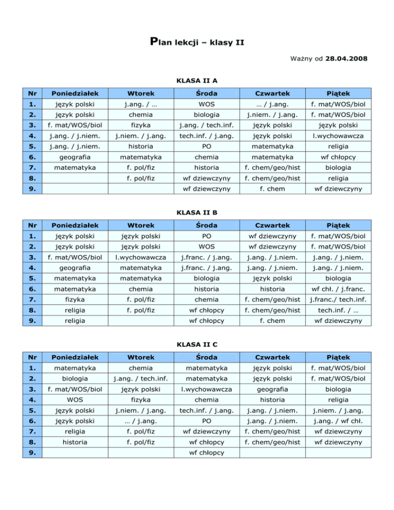Plan lekcji – klasy II WaŜny od 28.04.2008 KLASA II A Nr Poniedziałek Wtorek Środa Czwartek Piątek 1. język polski j.ang. / … WOS … / j.ang. f. mat/WOS/biol 2. język polski chemia biologia j.niem. / j.ang. f. mat/WOS/biol 3. f. mat/WOS/biol fizyka j.ang. / tech.inf. język polski język polski 4. j.ang. / j.niem. j.niem. / j.ang. tech.inf. / j.ang. język polski l.wychowawcza 5. j.ang. / j.niem. historia PO matematyka religia 6. geografia matematyka chemia matematyka wf chłopcy 7. matematyka f. pol/fiz historia f. chem/geo/hist biologia f. pol/fiz wf dziewczyny f. chem/geo/hist religia wf dziewczyny f. chem wf dziewczyny 8. 9. KLASA II B Nr Poniedziałek Wtorek Środa Czwartek Piątek 1. język polski język polski PO wf dziewczyny f. mat/WOS/biol 2. język polski język polski WOS wf dziewczyny f. mat/WOS/biol 3. f. mat/WOS/biol l.wychowawcza j.franc. / j.ang. j.ang. / j.niem. j.ang. / j.niem. 4. geografia matematyka j.franc. / j.ang. j.ang. / j.niem. j.ang. / j.niem. 5. matematyka matematyka biologia język polski biologia 6. matematyka chemia historia historia wf chł. / j.franc. 7. fizyka f. pol/fiz chemia f. chem/geo/hist j.franc./ tech.inf. 8. religia f. pol/fiz wf chłopcy f. chem/geo/hist tech.inf. / … 9. religia wf chłopcy f. chem wf dziewczyny KLASA II C Nr Poniedziałek Wtorek Środa Czwartek Piątek 1. matematyka chemia matematyka język polski f. mat/WOS/biol 2. biologia j.ang. / tech.inf. matematyka język polski f. mat/WOS/biol 3. f. mat/WOS/biol język polski l.wychowawcza geografia biologia 4. WOS fizyka chemia historia religia 5. język polski j.niem. / j.ang. tech.inf. / j.ang. j.ang. / j.niem. j.niem. / j.ang. 6. język polski … / j.ang. PO j.ang. / j.niem. j.ang. / wf chł. 7. religia f. pol/fiz wf dziewczyny f. chem/geo/hist wf dziewczyny 8. historia f. pol/fiz wf chłopcy f. chem/geo/hist wf dziewczyny 9. wf chłopcy