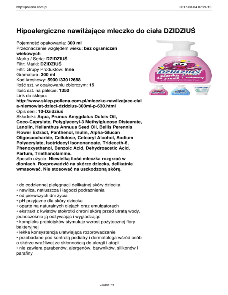 http://pollena.com.pl 2017-03-04 07:24:10 Hipoalergiczne nawilżające mleczko do ciała DZIDZIUŚ Pojemność opakowania: 300 ml Przeznaczenie względem wieku: bez ograniczeń wiekowych Marka / Seria: DZIDZIUŚ Filtr: Marki: DZIDZIUŚ Filtr: Grupy Produktów: Inne Gramatura: 300 ml Kod kreskowy: 5900133012688 Ilość szt. w opakowaniu zbiorczym: 15 Ilość szt. na palecie: 1350 Link do sklepu: http://www.sklep.pollena.com.pl/mleczko-nawilzajace-cial a-niemowlat-dzieci-dzidzius-300ml-p-630.html Opis serii: 10-Dzidziuś Składniki: Aqua, Prunus Amygdalus Dulcis Oil, Coco-Caprylate, Polyglyceryl-3 Methylglucose Distearate, Lanolin, Helianthus Annuus Seed Oil, Bellis Perennis Flower Extract, Panthenol, Inulin, Alpha-Glucan Oligosaccharide, Cellulose, Cetearyl Alcohol, Sodium Polyacrylate, Isotridecyl Isononanoate, Trideceth-6, Phenoxyethanol, Benzoic Acid, Dehydroacetic Acid, Parfum, Triethanolamine. Sposób użycia: Niewielką ilość mleczka rozgrzać w dłoniach. Rozprowadzić na skórze dziecka, delikatnie wmasować. Nie stosować na uszkodzoną skórę. • do codziennej pielęgnacji delikatnej skóry dziecka • nawilża, natłuszcza i łagodzi podrażnienia • od pierwszych dni życia • pH przyjazne dla skóry dziecka • oparte na naturalnych olejach oraz emulgatorach • ekstrakt z kwiatów stokrotki chroni skórę przed utratą wody, jednocześnie ją odżywiając i wygładzając • kompleks prebiotyków stymuluje wzrost pożytecznej flory bakteryjnej • lekka konsystencja ułatwiająca rozprowadzanie • przebadane pod kontrolą pediatry i dermatologa wśród osób o skórze wrażliwej ze skłonnością do alergii i atopii • nie zawiera parabenów, alergenów, barwników, silikonów i parafiny Strona 1/1