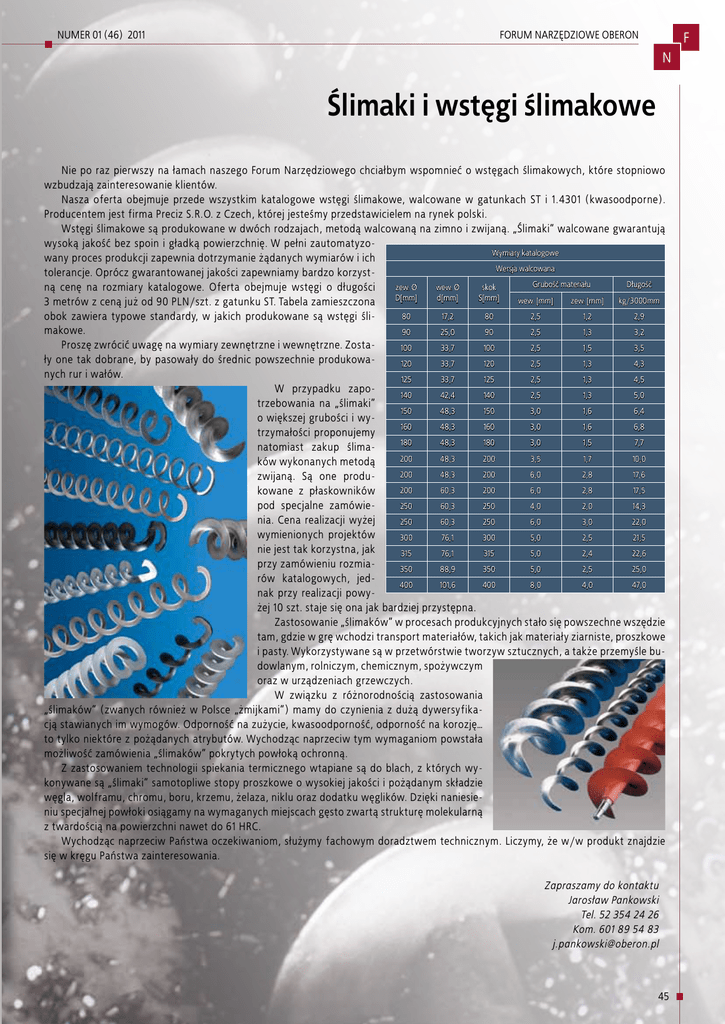 NUMER 01 (46) 2011 FORUM NARZĘDZIOWE OBERON F N Ślimaki i wstęgi ślimakowe Nie po raz pierwszy na łamach naszego Forum Narzędziowego chciałbym wspomnieć o wstęgach ślimakowych, które stopniowo wzbudzają zainteresowanie klientów. Nasza oferta obejmuje przede wszystkim katalogowe wstęgi ślimakowe, walcowane w gatunkach ST i 1.4301 (kwasoodporne). Producentem jest firma Preciz S.R.O. z Czech, której jesteśmy przedstawicielem na rynek polski. Wstęgi ślimakowe są produkowane w dwóch rodzajach, metodą walcowaną na zimno i zwijaną. „Ślimaki” walcowane gwarantują wysoką jakość bez spoin i gładką powierzchnię. W pełni zautomatyzoWymiary katalogowe wany proces produkcji zapewnia dotrzymanie żądanych wymiarów i ich Wersja walcowana tolerancje. Oprócz gwarantowanej jakości zapewniamy bardzo korzystGrubość materiału Długość zew. Ø wew. Ø skok ną cenę na rozmiary katalogowe. Oferta obejmuje wstęgi o długości D[mm] d[mm] S[mm] wew. [mm] zew. [mm] kg/3000mm 3 metrów z ceną już od 90 PLN/szt. z gatunku ST. Tabela zamieszczona 80 17,2 80 2,5 1,2 2,9 obok zawiera typowe standardy, w jakich produkowane są wstęgi ślimakowe. 90 25,0 90 2,5 1,3 3,2 Proszę zwrócić uwagę na wymiary zewnętrzne i wewnętrzne. Zosta100 33,7 100 2,5 1,5 3,5 ły one tak dobrane, by pasowały do średnic powszechnie produkowa120 33,7 120 2,5 1,3 4,3 nych rur i wałów. 125 33,7 125 2,5 1,3 4,5 W przypadku zapo140 42,4 140 2,5 1,3 5,0 trzebowania na „ślimaki” 150 48,3 150 3,0 1,6 6,4 o większej grubości i wy160 48,3 160 3,0 1,6 6,8 trzymałości proponujemy 180 48,3 180 3,0 1,5 7,7 natomiast zakup ślima200 48,3 200 3,5 1,7 10,0 ków wykonanych metodą 200 48,3 200 6,0 2,8 17,6 zwijaną. Są one produ200 60,3 200 6,0 2,8 17,5 kowane z płaskowników 250 60,3 250 4,0 2,0 14,3 pod specjalne zamówienia. Cena realizacji wyżej 250 60,3 250 6,0 3,0 22,0 wymienionych projektów 300 76,1 300 5,0 2,5 21,5 nie jest tak korzystna, jak 315 76,1 315 5,0 2,4 22,6 przy zamówieniu rozmia350 88,9 350 5,0 2,5 25,0 rów katalogowych, jed400 101,6 400 8,0 4,0 47,0 nak przy realizacji powyżej 10 szt. staje się ona jak bardziej przystępna. Zastosowanie „ślimaków” w procesach produkcyjnych stało się powszechne wszędzie tam, gdzie w grę wchodzi transport materiałów, takich jak materiały ziarniste, proszkowe i pasty. Wykorzystywane są w przetwórstwie tworzyw sztucznych, a także przemyśle budowlanym, rolniczym, chemicznym, spożywczym oraz w urządzeniach grzewczych. W związku z różnorodnością zastosowania „ślimaków” (zwanych również w Polsce „żmijkami”) mamy do czynienia z dużą dywersyfikacją stawianych im wymogów. Odporność na zużycie, kwasoodporność, odporność na korozję… to tylko niektóre z pożądanych atrybutów. Wychodząc naprzeciw tym wymaganiom powstała możliwość zamówienia „ślimaków” pokrytych powłoką ochronną. Z zastosowaniem technologii spiekania termicznego wtapiane są do blach, z których wykonywane są „ślimaki” samotopliwe stopy proszkowe o wysokiej jakości i pożądanym składzie węgla, wolframu, chromu, boru, krzemu, żelaza, niklu oraz dodatku węglików. Dzięki naniesieniu specjalnej powłoki osiągamy na wymaganych miejscach gęsto zwartą strukturę molekularną z twardością na powierzchni nawet do 61 HRC. Wychodząc naprzeciw Państwa oczekiwaniom, służymy fachowym doradztwem technicznym. Liczymy, że w/w produkt znajdzie się w kręgu Państwa zainteresowania. Zapraszamy do kontaktu Jarosław Pankowski Tel. 52 354 24 26 Kom. 601 89 54 83 [email protected] 45