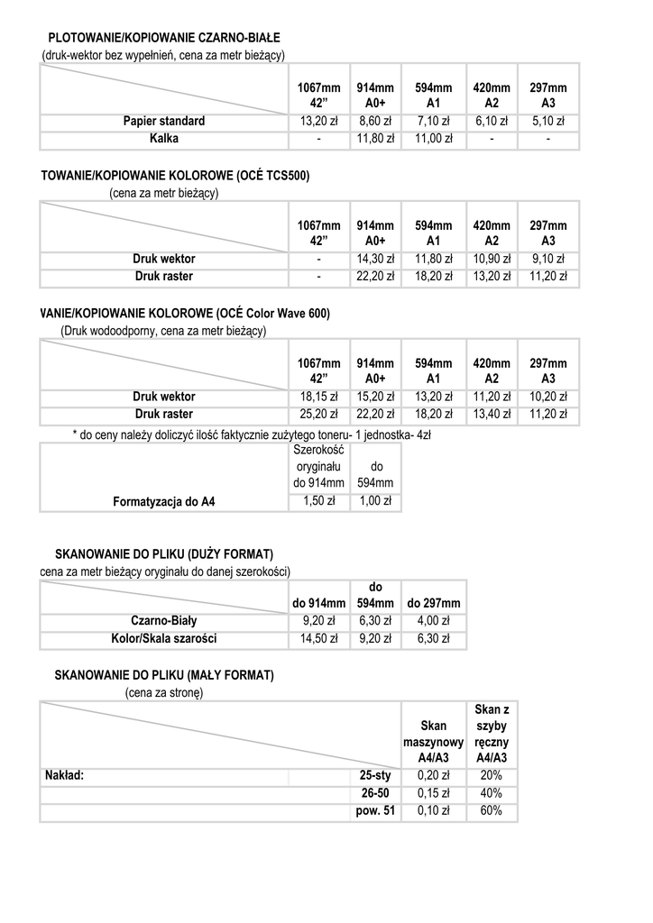 PLOTOWANIE/KOPIOWANIE CZARNO-BIAŁE (druk-wektor bez wypełnień, cena za metr bieżący) Papier standard Kalka 1067mm 42” 13,20 zł - 914mm A0+ 8,60 zł 11,80 zł 594mm A1 7,10 zł 11,00 zł 420mm A2 6,10 zł - 297mm A3 5,10 zł - 914mm A0+ 14,30 zł 22,20 zł 594mm A1 11,80 zł 18,20 zł 420mm A2 10,90 zł 13,20 zł 297mm A3 9,10 zł 11,20 zł 914mm A0+ 15,20 zł 22,20 zł 594mm A1 13,20 zł 18,20 zł 420mm A2 11,20 zł 13,40 zł 297mm A3 10,20 zł 11,20 zł PLOTOWANIE/KOPIOWANIE KOLOROWE (OCÉ TCS500) (cena za metr bieżący) Druk wektor Druk raster 1067mm 42” - PLOTOWANIE/KOPIOWANIE KOLOROWE (OCÉ Color Wave 600) (Druk wodoodporny, cena za metr bieżący) Druk wektor Druk raster 1067mm 42” 18,15 zł 25,20 zł * do ceny należy doliczyć ilość faktycznie zużytego toneru- 1 jednostka- 4zł Szerokość oryginału do do 914mm 594mm 1,50 zł 1,00 zł Formatyzacja do A4 SKANOWANIE DO PLIKU (DUŻY FORMAT) (cena za metr bieżący oryginału do danej szerokości) Czarno-Biały Kolor/Skala szarości do do 914mm 594mm do 297mm 9,20 zł 6,30 zł 4,00 zł 14,50 zł 9,20 zł 6,30 zł SKANOWANIE DO PLIKU (MAŁY FORMAT) (cena za stronę) Nakład: Skan z Skan szyby maszynowy ręczny A4/A3 A4/A3 25-sty 0,20 zł 20% 26-50 0,15 zł 40% pow. 51 0,10 zł 60% WYDRUKI / XERO MAŁE FORMATY A4 A4 dwustronne A4 kalka A3 A3 dwustronne A3 kalka czarnobiałe 0,25 zł 0,50 zł 0,50 zł 0,50 zł 1,00 zł 1,00 zł BINDOWANIE SPIRALA PLASTIK I METALOWA Ilość stron do 25 do 50 do 100 do 200 powyżej 200 4,50 zł 5,00 zł 6,00 zł 8,50 zł 11,00 zł TERMOOPRAWA Ilość stron do 25 do 50 do 100 do 200 powyżej 200 4,00 zł 4,50 zł 6,20 zł 8,00 zł 15,00 zł OPRAWA KANAŁOWA Ilość stron do 150 powyżej 150 do 150 + przekładki powyżej 150 + przekładki 11,00 zł 15,00 zł 15,00 zł 20,00 zł LISTWY WSUWANE Ilość stron do 50 do 100 do 150 3,50 zł 4,00 zł 6,00 zł LAMINOWANIE A6 A5 A4 A3 1,00 zł 1,50 zł 2,50 zł 3,50 zł kolor 1,60 zł 3,20 zł 2,15 zł 3,23 zł 6,45 zł 3,70 zł