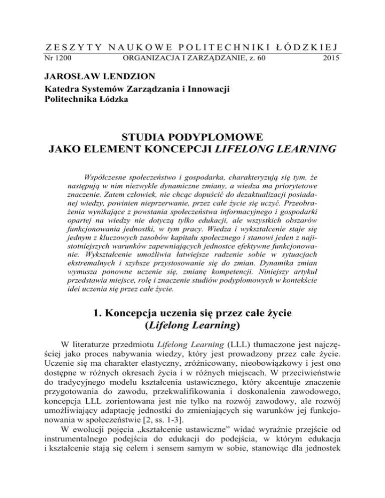 ZESZYTY NAUKOWE POLITECHNIKI ŁÓDZKIEJ Nr 1200 ORGANIZACJA I ZARZĄDZANIE, z. 60 2015 JAROSŁAW LENDZION Katedra Systemów Zarządzania i Innowacji Politechnika Łódzka STUDIA PODYPLOMOWE JAKO ELEMENT KONCEPCJI LIFELONG LEARNING Współczesne społeczeństwo i gospodarka, charakteryzują się tym, że następują w nim niezwykle dynamiczne zmiany, a wiedza ma priorytetowe znaczenie. Zatem człowiek, nie chcąc dopuścić do dezaktualizacji posiadanej wiedzy, powinien nieprzerwanie, przez całe życie się uczyć. Przeobrażenia wynikające z powstania społeczeństwa informacyjnego i gospodarki opartej na wiedzy nie dotyczą tylko edukacji, ale wszystkich obszarów funkcjonowania jednostki, w tym pracy. Wiedza i wykształcenie staje się jednym z kluczowych zasobów kapitału społecznego i stanowi jeden z najistotniejszych warunków zapewniających jednostce efektywne funkcjonowanie. Wykształcenie umożliwia łatwiejsze radzenie sobie w sytuacjach ekstremalnych i szybsze przystosowanie się do zmian. Dynamika zmian wymusza ponowne uczenie się, zmianę kompetencji. Niniejszy artykuł przedstawia miejsce, rolę i znaczenie studiów podyplomowych w kontekście idei uczenia się przez całe życie. 1. Koncepcja uczenia się przez całe życie (Lifelong Learning) W literaturze przedmiotu Lifelong Learning (LLL) tłumaczone jest najczęściej jako proces nabywania wiedzy, który jest prowadzony przez całe życie. Uczenie się ma charakter elastyczny, zróżnicowany, nieobowiązkowy i jest ono dostępne w różnych okresach życia i w różnych miejscach. W przeciwieństwie do tradycyjnego modelu kształcenia ustawicznego, który akcentuje znaczenie przygotowania do zawodu, przekwalifikowania i doskonalenia zawodowego, koncepcja LLL zorientowana jest nie tylko na rozwój zawodowy, ale rozwój umożliwiający adaptację jednostki do zmieniających się warunków jej funkcjonowania w społeczeństwie [2, ss. 1-3]. W ewolucji pojęcia „kształcenie ustawiczne” widać wyraźnie przejście od instrumentalnego podejścia do edukacji do podejścia, w którym edukacja i kształcenie stają się celem i sensem samym w sobie, stanowiąc dla jednostek 108 Jarosław Lendzion coraz częściej wartość autoteliczną. Od ponad półwiecza pedagodzy dostrzegają w kształceniu ustawicznym trzy wymiary. Pionowe kształcenie to przede wszystkim edukacja szkolna, obejmująca szczeble od przedszkola do uniwersytetu (w tym studia podyplomowe). Kształcenie poziome ma miejsce w pozaszkolnych instytucjach oświaty i służy również edukacji kulturalnej. Kształcenie w głąb to styl życia (w tym sposób spędzania czasu wolnego) związany z całożyciowym uczeniem się [5]. Idea LLL oznacza zatem zachowanie ciągłości i systematyczności procesu uczenia się, ale wskazuje także na wielowymiarowość i wszechstronność uczenia się. Coraz częściej mówi się zatem też o Lifewide Learning, czyli uczeniu się w każdych okolicznościach. W tym podejściu akcentuje się fakt, iż jednostka ma szansę w sposób holistyczny zadbać o swój całościowy rozwój, ucząc się w ciągu całego swojego życia z rozmaitych własnych doświadczeń. Model LLL oparty jest na czterech filarach edukacji dla przyszłości Delorsa [8, s. 70]: • uczenie się dla wiedzy (Learning to know) – opanowanie narzędzi zdobywania nowej wiedzy, a nie nabycie wiedzy ustrukturalizowanej. • uczenie się pracy i kompetencji (Learning to do) – uczenie się różnego rodzajów prac potrzebnych obecnie i w przyszłości, a także możliwości zastosowania nowej wiedzy do zmieniającego się środowiska pracy. • uczenie się dla zrozumienia innych (Learning to live together, and with other) – nabywanie umiejętności rozwiązywania konfliktów, odkrywanie innych ludzi i ich kultur, rozwijanie kompetencji społecznych i indywidualnych. • uczenie się dla własnego rozwoju (Learning to be) – edukacja przyczynia się do pełnego rozwoju człowieka: jego umysłu i ciała, inteligencji, wrażliwości, estetyki i duchowości. Uczenie się przez całe życie ma na celu pobudzenie kreatywności, inicjatywy i elastyczności ludzi, umożliwiając im tym samym rozwinięcie zdolności adaptacyjnych w społeczeństwie postindustrialnym poprzez zwiększenie ich umiejętności [9]: • zarządzania niepewnością, • komunikacji interpersonalnej i międzykulturowej się w kręgu kultur, subkultur, rodziny i społeczności, • negocjowania i rozwiązywania konfliktów. W LLL nacisk jest zatem kładziony na rozwijanie umiejętność uczenia się oraz nabywania i wykorzystywania nowej wiedzy przez całe życie. Zgodnie z przesłaniem polityki unijnej uczenie się przez całe życie to klucz do społeczeństwa opartego na wiedzy, zaś społeczeństwo oparte na wiedzy to motor rozwoju konkurencyjnej w skali globalnej, bo opartej na wiedzy, gospodarki (GOW). W komunikacie Komisji Europejskiej Making a European Area of Lifelong Learning a Reality stwierdzono, że LLL ma „cztery szerokie i wzajemnie wspierających się cele” [1, s. 3]: Studia podyplomowe jako element koncepcji Lifelong Learning 109 • • • • samorealizacja, bycie aktywnym obywatelem, integracja społeczna, zdolności adaptacyjne. W związku z tym, LLL przybiera różnorodne fory i wymiary, które wykraczają poza wąskie aspekty ekonomiczne i zawodowe. Według definicji zawartej w Rezolucji Rady Unii Europejskiej z 27 czerwca 2002 r. „(...) pojęcie LLL (uczenie się przez całe życie) powinno dotyczyć uczenia się od fazy przedszkolnej do późnej emerytalnej, włączając w to całe spektrum uczenia się formalnego (w szkołach i innych placówkach systemu edukacji), pozaformalnego (w instytucjach poza system edukacji) i nieformalnego (naturalnego). Ponadto, powinno się ono odnosić do wszelkiej, trwającej przez całe życie, aktywności uczenia się, mającej na celu rozwój wiedzy, kompetencji i umiejętności w perspektywie osobistej, obywatelskiej, s