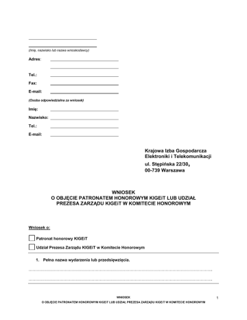 (Imię, nazwisko lub nazwa wnioskodawcy) Adres: Tel.: Fax: E-mail: (Osoba odpowiedzialna za wniosek) Imię: Nazwisko: Tel.: E-mail: Krajowa Izba Gospodarcza Elektroniki i Telekomunikacji ul. Stępińska 22/30, 00-739 Warszawa WNIOSEK O OBJĘCIE PATRONATEM HONOROWYM KIGEiT LUB UDZIAŁ PREZESA ZARZĄDU KIGEiT W KOMITECIE HONOROWYM Wniosek o: Patronat honorowy KIGEiT Udział Prezesa Zarządu KIGEiT w Komitecie Honorowym 1. Pełna nazwa wydarzenia lub przedsięwzięcia. ……………………………………………………………………………………………………………………….. ……………………………………………………………………………………………………………………….. WNIOSEK O OBJĘCIE PATRONATEM HONOROWYM KIGEiT LUB UDZIAŁ PREZESA ZARZĄDU KIGEiT W KOMITECIE HONOROWYM 1 2. Cel wydarzenia lub przedsięwzięcia. ……………………………………………………………………………………………………………………….. ……………………………………………………………………………………………………………………….. ……………………………………………………………………………………………………………………….. ……………………………………………………………………………………………………………………….. ……………………………………………………………………………………………………………………….. ……………………………………………………………………………………………………………………….. 3. Jakie korzyści mogą zostać osiągnięte dzięki realizacji wydarzenia lub przedsięwzięcia? ……………………………………………………………………………………………………………………….. ……………………………………………………………………………………………………………………….. ……………………………………………………………………………………………………………………….. ……………………………………………………………………………………………………………………….. ……………………………………………………………………………………………………………………….. ……………………………………………………………………………………………………………………….. 4. Data rozpoczęcia, miejsce oraz czas trwania wydarzenia lub przedsięwzięcia. ……………………………………………………………………………………………………………………….. ……………………………………………………………………………………………………………………….. 5. Opis planowanego wydarzenia lub przedsięwzięcia oraz uzasadnienie związku z zakresem działań i kompetencji KIGEiT. ……………………………………………………………………………………………………………………….. ……………………………………………………………………………………………………………………….. ……………………………………………………………………………………………………………………….. ……………………………………………………………………………………………………………………….. ……………………………………………………………………………………………………………………….. ……………………………………………………………………………………………………………………….. ……………………………………………………………………………………………………………………….. ……………………………………………………………………………………………………………………….. WNIOSEK O OBJĘCIE PATRONATEM HONOROWYM KIGEiT LUB UDZIAŁ PREZESA ZARZĄDU KIGEiT W KOMITECIE HONOROWYM 2 6. Informacja o organizatorze oraz o osobach odpowiedzialnych za zarządzanie wydarzeniem lub przedsięwzięciem. ……………………………………………………………………………………………………………………….. ……………………………………………………………………………………………………………………….. ……………………………………………………………………………………………………………………….. ……………………………………………………………………………………………………………………….. 7. Inni partnerzy lub współorganizatorzy wydarzenia lub przedsięwzięcia. ……………………………………………………………………………………………………………………….. ……………………………………………………………………………………………………………………….. ……………………………………………………………………………………………………………………….. ……………………………………………………………………………………………………………………….. ……………………………………………………………………………………………………………………….. ……………………………………………………………………………………………………………………….. 8. Proszę wymienić wszystkich partnerów i sponsorów wydarzenia lub przedsięwzięci