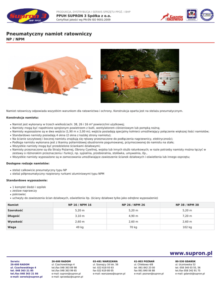 PRODUKCJA, DYSTRYBUCJA I SERWIS SPRZĘTU PPOŻ. I BHP PPUH SUPRON 3 Spółka z o.o. Certyfikat jakości wg PN-EN ISO 9001:2009 Pneumatyczny namiot ratowniczy NP / NPM Namiot ratowniczy odpowiada wszystkim warunkom dla ratownictwa i ochrony. Konstrukcja oparta jest na stelażu pneumatycznym. Konstrukcja namiotu: ● ● ● ● ● ● ● ● ● Namiot jest wykonany w trzech wielkościach: 38, 26 i 16 m² powierzchni użytkowej; Namioty mogą być napełnione sprężonym powietrzem z butli, wentylatorem ciśnieniowym lub pompką nożną; Namioty wyposażone są w dwa wejścia (1,90 m x 2,00 m); wejścia posiadają specjalny kołnierz umożliwiający połączenie większej ilości namiotów; Standardowo namioty posiadają 4 okna (2 okna z każdej strony namiotu); Na ścianie szczytowej i bocznej namiotu znajdują się rękawy przeznaczone do podłączenia nagrzewnicy, elektryczności; Podłoga namiotu wykonana jest z tkaniny poliamidowej obustronnie pogumowanej, przymocowanej do namiotu na stałe; Wszystkie namioty mogą być przedzielone ściankami działowymi; Namioty przeznaczone są dla Straży Pożarnej, Obrony Cywilnej, wojska lub innych służb ratunkowych; w razie potrzeby namioty można łączyć w zestawy o różnorakim przeznaczeniu i funkcji, np. sypialnia, przebieralnia, stołówka, umywalnia, itp., Wszystkie namioty wyposażone są w zamocowania umożliwiające zawieszenie ścianek działowych i oświetlenia lub innego osprzętu; Dostępne rodzaje namiotów: ● ● stelaż całkowicie pneumatyczny typu NP stelaż półpneumatyczny rozpierany rurkami aluminiowymi typu NPM Standardowe wyposażenie: ● ● ● ● 1 komplet śledzi i szpilek zestaw naprawczy pokrowiec uchwyty do zawieszenia ścian działowych, oświetlenia itp. (ściany działowe tylko jako odrębne wyposażenie) Namiot NP 16 / NPM 16 NP 26 / NPM 26 NP 38 / NPM 38 Szerokość 5,20 m 5,20 m 5,20 m Długość 3,10 m 4,90 m 7,20 m Wysokość 2,60 m 2,60 m 2,60 m 49 kg 70 kg 102 kg Waga www.supron.pl Serwis: 26-600 RADOM ul. Czachowskiego 4 tel. 048 363 21 85 tel./fax 048 363 21 86 e-mail: [email protected] 26-600 RADOM ul. Czachowskiego 4 tel./fax 048 363 89 98 tel./fax 048 363 99 65 e-mail: [email protected] e-mail: [email protected] 03-481 WARSZAWA ul. Szanajcy 16 lok. 56 tel. 022 618 93 63 fax 022 619 80 05 e-mail: [email protected] 61-003 POZNAŃ ul. Chlebowa 4/8 tel. 061 842 23 00 fax 061 840 06 88 e-mail: [email protected] 80-530 GDAŃSK ul. Uczniowska 52 tel. 058 340 03 55, 56 tel./fax 058 342 91 75 e-mail: [email protected]