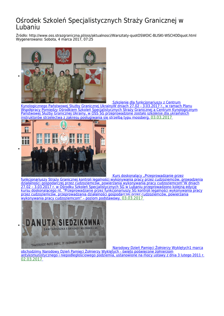 Ośrodek Szkoleń Specjalistycznych Straży Granicznej w Lubaniu Źródło: http://www.oss.strazgraniczna.pl/oss/aktualnosci/Warsztaty-quotOSWOIC-BLISKI-WSCHODquot.html Wygenerowano: Sobota, 4 marca 2017, 07:25 ● Szkolenie dla funkcjonariuszy z Centrum Kynologicznego Państwowej Służby Granicznej UkrainyW dniach 27.02 - 3.03.2017 r., w ramach Planu Współpracy Pomiędzy Ośrodkiem Szkoleń Specjalistycznych Straży Granicznej a Centrum Kynologicznym Państwowej Służby Granicznej Ukrainy, w OSS SG przeprowadzone zostało szkolenie dla ukraińskich instruktorów strzelectwa z zakresu posługiwania się strzelbą typu mossberg. 03.03.2017 ● Kurs doskonalący „Przeprowadzanie przez funkcjonariuszy Straży Granicznej kontroli legalności wykonywania pracy przez cudzoziemców, prowadzenia działalności gospodarczej przez cudzoziemców, powierzania wykonywania pracy cudzoziemcom”W dniach 27.02 – 3.03.2017 r. w Ośrodku Szkoleń Specjalistycznych SG w Lubaniu przeprowadzono kolejną edycję kursu doskonalącego nt. "Przeprowadzanie przez funkcjonariuszy SG kontroli legalności wykonywania pracy przez cudzoziemców, przeprowadzania działalności gospodarczej przez cudzoziemców, powierzania wykonywania pracy cudzoziemcom" – poziom podstawowy. 03.03.2017 ● Narodowy Dzień Pamięci Żołnierzy Wyklętych1 marca obchodzimy Narodowy Dzień Pamięci Żołnierzy Wyklętych - święto poświęcone żołnierzom antykomunistycznego i niepodległościowego podziemia, ustanowione na mocy ustawy z dnia 3 lutego 2011 r. 02.03.2017 ● Akcja honorowego krwiodawstwa „spoKREWnieni służbą”W ramach akcji honorowego krwiodawstwa „spoKREWnieni służbą” pod patronatem Ministra Spraw Wewnętrznych i Administracji pana Mariusza Błaszczaka, w dniach 28 lutego – 1 marca 2017 r. krwiobus z RCKiK w Wałbrzychu stacjonował na terenie Ośrodka Szkoleń Specjalistycznych SG w Lubaniu. 01.03.2017 ● Przeciwdziałanie wypaleniu zawodowemu w Straży GranicznejW dniach 20 – 24.02.2017 r. w Szklarskiej Porębie zrealizowana została I edycja kursu doskonalącego pt. „Przeciwdziałanie wypaleniu zawodowemu w Straży Granicznej”, w którym wzięli udział funkcjonariusze z Podlaskiego, Nadbużańskiego, Śląskiego, Nadwiślańskiego Oddziału Straży Granicznej oraz Komendy Głównej Straży Granicznej. 27.02.2017 ● ● Kurs doskonalący pt. "Rola organów w postępowaniu o udzielenie ochrony międzynarodowej”W dniach 21 - 24.02.2017 r. wykładowcy Zakładu do Spraw Cudzoziemców Ośrodka Szkoleń Specjalistycznych Straży Granicznej w Lubaniu przeprowadzili kurs doskonalący pt. "Rola organów w postępowaniu o udzielenie ochrony międzynarodowej”. 24.02.2017 List Ministra Spraw Wewnętrznych i AdministracjiW liście skierowanym do funkcjonariuszy i pracowników cywilnych Straży Granicznej minister Mariusz Błaszczak poinformował o wprowadzonych podwyżkach wynagrodzeń oraz przeznaczeniu kwoty ponad 840 mln zł na planowaną w latach 2017-2020 modernizację formacji – rozbudowę infrastruktury, nowoczesny sprzęt i wyposażenie, aby funkcjonariusze mogli pełnić swoją trudną służbę w odpowiednich warunkach. 17.02.2017 ● Kurs doskonalący nt. „Postępowanie funkcjonariuszy Straży Granicznej w przypadku wystąpienia sytuacji kryzysowych”W dniach 14 - 17 lutego 2017 r. w Ośrodku Szkoleń Specjalistycznych Straży Granicznej w Lubaniu przeprowadzony został kurs doskonalący nt. „Postępowanie funkcjonariuszy Straży Granicznej w przypadku wystąpienia sytuacji kryzysowych”. 17.02.2017 ● Zatrzymywanie osób w działaniach specjalnychW dniach 13 - 17.02.2017 r. funkcjonariusze z Zakładu Zabezpieczenia Działań Ośrodka Szkoleń Specjalistycznych SG w Lubaniu przeprowadzili kurs doskonalący z zakresu „Zatrzymywania osób w działaniach specjalnych”. 17.02.2017 ● Ćwiczenia pk. „KARKONOSZE 2017”15.02.2017 roku na terenie Ośrodka Szkoleń Specjalistycznych Straży Granicznej w Lubaniu odbyły się ćwiczenia zgrywające Straży Granicznej i Państwowej Straży Pożarnej pod kryptonimem „KARKONOSZE 2017”. 15.02.2017 Archiwum