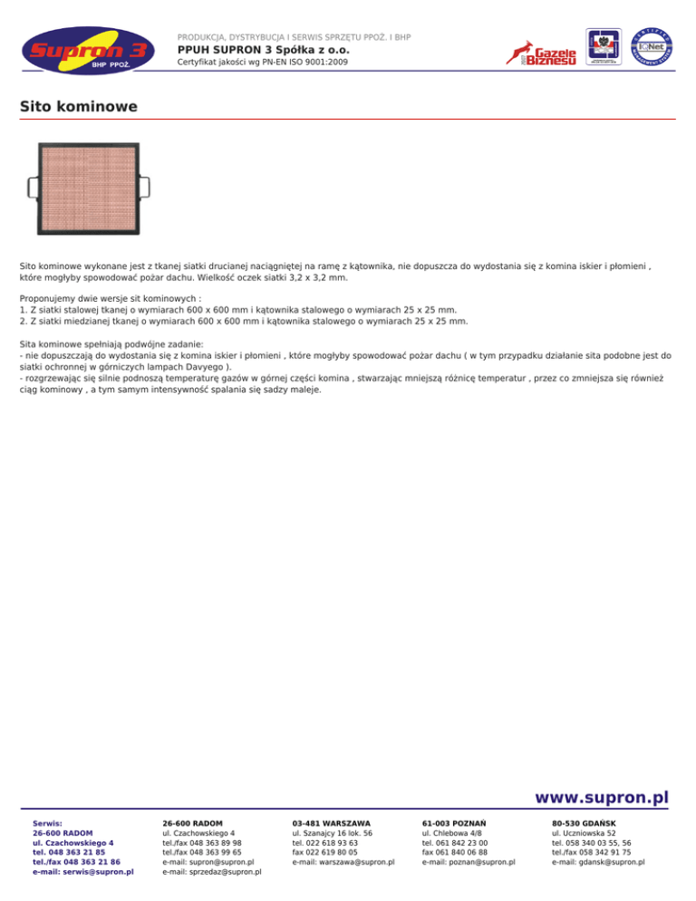 PRODUKCJA, DYSTRYBUCJA I SERWIS SPRZĘTU PPOŻ. I BHP PPUH SUPRON 3 Spółka z o.o. Certyfikat jakości wg PN-EN ISO 9001:2009 Sito kominowe Sito kominowe wykonane jest z tkanej siatki drucianej naciągniętej na ramę z kątownika, nie dopuszcza do wydostania się z komina iskier i płomieni , które mogłyby spowodować pożar dachu. Wielkość oczek siatki 3,2 x 3,2 mm. Proponujemy dwie wersje sit kominowych : 1. Z siatki stalowej tkanej o wymiarach 600 x 600 mm i kątownika stalowego o wymiarach 25 x 25 mm. 2. Z siatki miedzianej tkanej o wymiarach 600 x 600 mm i kątownika stalowego o wymiarach 25 x 25 mm. Sita kominowe spełniają podwójne zadanie: - nie dopuszczają do wydostania się z komina iskier i płomieni , które mogłyby spowodować pożar dachu ( w tym przypadku działanie sita podobne jest do siatki ochronnej w górniczych lampach Davyego ). - rozgrzewając się silnie podnoszą temperaturę gazów w górnej części komina , stwarzając mniejszą różnicę temperatur , przez co zmniejsza się również ciąg kominowy , a tym samym intensywność spalania się sadzy maleje. www.supron.pl Serwis: 26-600 RADOM ul. Czachowskiego 4 tel. 048 363 21 85 tel./fax 048 363 21 86 e-mail: [email protected] 26-600 RADOM ul. Czachowskiego 4 tel./fax 048 363 89 98 tel./fax 048 363 99 65 e-mail: [email protected] e-mail: [email protected] 03-481 WARSZAWA ul. Szanajcy 16 lok. 56 tel. 022 618 93 63 fax 022 619 80 05 e-mail: [email protected] 61-003 POZNAŃ ul. Chlebowa 4/8 tel. 061 842 23 00 fax 061 840 06 88 e-mail: [email protected] 80-530 GDAŃSK ul. Uczniowska 52 tel. 058 340 03 55, 56 tel./fax 058 342 91 75 e-mail: [email protected]