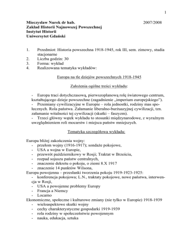 1 Mieczysław Nurek dr hab. Zakład Historii Najnowszej Powszechnej Instytut Historii Uniwersytet Gdański 1. 2. 3. 4. 2007/2008 Przedmiot: Historia powszechna 1918-1945, rok III, sem. zimowy, studia stacjonarne Liczba godzin: 30 Forma: wykład Realizowana tematyka wykładów: Europa na tle dziejów powszechnych 1918-1945 Założenia ogólne treści wykładu: - Europa traci dotychczasową, pierwszoplanową rolę światowego centrum, kształtującego dzieje powszechne (zagadnienie „imperium europejskiego”). - Przemiany cywilizacyjne w Europie – rola jednostki, rodziny mas społecznych. Rola państwa. Załamanie liberalno-burżuazyjnej cywilizacji, tzn. załamanie witalności tej cywilizacji (skutki – faszyzm). - Trzeci główny wątek wykładu to stosunki międzynarodowe, z wyraźnym uwzględnieniem roli mocarstw i miejsca państw mniejszych. Tematyka szczegółowa wykładu: Europa bliżej zakończenia wojny: - przełom wojny (1916-1917); sondaże pokojowe, - USA a wojna w Europie, - przewrót październikowy w Rosji; Traktat w Brześciu, - rozpad sojuszu państw centralnych, - znaczenie dekretu o pokoju, o ziemi 8.X 1917 - znaczenie 14 punktów Wilsona, Europa powojenna – przesłanki tworzenia pokoju 1919-1923-1925: - konferencja pokojowa; L.N., traktaty pokojowe, nowe państwa, interwencja w Rosji, - USA a powojenne problemy Europy - Francja a Niemcy - Locarno Ekonomiczne, społeczne i kulturowe zmiany (nie tylko w Europie) 1918-1939 - wieloaspektowe skutki wojny - cechy charakterystyczne gospodarki 1919-1939 - rola rodziny w społeczeństwie powojennym - nauka, edukacja, sztuka 2 Ku II wojnie światowej – mocarstwa zachodnie, ZSRR i kraje mniejsze Europy wobec polityki państw faszystowskich - cz. I (1933-1938) problem rozbrojenia, Pakt Czterech, Pakt Wschodni, Stresa, )6. 1935 r.-układ morski bryt.-niem. (reakcja państw M. Bałtyckiego),koniec ery Locarno, Oś Berlin-Rzym-Tokio, pakt antykominternowski, Appeasement w polityce międzynarodowej (geneza, ewolucja zasad polit. appeasementu) – układ monachijski (apogeum polityki appeasementu, postawa Benesza art.) - cz. II rok 1939 – zerwanie przez Hitlera układu monachijskiego, punkt zerowy w polityce międzynarodowej – reakcja W. Br., Fr. (polityka gwarancji), krajów mniejszych i ZSRR. Stosunki radziecko-niemieckie w l. 1919 – 1939 (Rapallo 1922, Traktat berliński 1926, po 1933 r. (Kandelaki –Gruzin), sierpień 1939-wrzesień 1939. Europa w II wojnie światowej - geneza II w. św.; los krajów bałtyckich, Finlandii, bloki politycznomilitarne; wizje kształtowania porządku międzynarodowego po II w. św. Wojna po wojnie czyli geneza zimnej wojny - przyczyny pośrednie i bezpośrednie (dwa tzw. długie telegramy: G. Kennan, F. Roberts) - los PSZ na Zachodzie (koniec sojuszu brytyjsko-polskiego). WYKAZ LITERATURY DO EGZAMINU Z HISTORII POWSZECHNEJ 1918-1945 ROK III Literatura o charakterze podręcznikowym 1. A. Czubiński, Europa dwudziestego wieku, Poznań 1997. 2. Tenże i W. Olszewski, Historia Powszechna 1939-1994, Poznań 1997 3. S. Sierpowski, Między Wojnami 1919-1939, cz. 1 i 2, Poznań:Kurpisz `99 4. A. Czubiński, Druga Wojna Światowa 1939-1945, cz. 1 i 2, Poznań: Kurpisz 5. A. Czubiński, Historia Drugiej Wojny Światowej 1939-1945, Poznań 2004. 6. H. Batowski, Między dwiema wojnami, 1919-1939. Zarys historii dyplomatycznej. Kraków 1988. 7. P. Johnson, Historia świata /od roku 1917/. Polonia, Londyn 1989 [oraz wydania krajowe]. 8. P. Kennedy, Mocarstwa Świata. Narodziny - Rozkwit - Upadek. 3 Książka i Wiedza, Warszawa 1994. 9. Druga Wojna światowa. Biuro Informacyjne Stanów Zjednoczonych. Kraków 1947, przedruk 1990. 10. Druga Wojna światowa. Praca zbiorowa. K i W, Warszawa 1987. 11. W.S. Churchill, Druga Wojna Światowa, t. I-VI, Gdańsk 1994 i n. 12. N. Davies, Europa, Kraków 1998 i n. 13. J. Karski, Wielkie mocarstwa wobec Polski 1919-1945. Od Wersalu do Jałty, Lublin 1998. 14. L.C. Gardner, Strefy wpływów. Wielkie mocarstwa i podział Europy. Od Monachium do Jałty, Warszawa: KiW 1999. UWAGA! - Autorzy prac zalecanych najbardziej: A. Czubiński, S. Sierpowski, N. Davies, J. Karski. Z podanego poniżej zestawu literaturynależy wybrać 4 pozycje (po jednej z wybranych 4 zestawów). Spośród wybranych 4 pozycji jedną można zastąpić inną nie ujętą w wykazie. Propozycję wprowadzenia do zestawu nowego tytułu należy uzgodnić z prowadzącym wykład, najpóźniej do końca zajęć. Zestaw I 1. A. Bullock, Hitler i Stalin. Warszawa 1994. 2. A. Kastory, W. S. Churchill. Wrocław 2004. 3. S. Haffner, Churchill, Lublin 1994. 4. A. Harasimowicz, James Ramsay MacDonald - życiorys socjaldemokraty. Łódź 1986. 5. J. Fest, Oblicze Trzeciej Rzeszy. Warszawa 1970. 6. R. Wapiński, Władysław Sikorski. Warszawa 1978 i n. 7. O. Terlecki, Generał ostatniej legendy. Londyn 1976. 8. O. Terlecki, Generał Sikorski. T. I-II, Kraków 1981. 9. W. Korpalska, Władysław Eugeniusz Sikorski. Biografia polityczna. Wrocław..., 1981 i n. 10. O. Terlecki, Pułkownik Beck. Kraków 1985. Zestaw II 1. 2. 3. 4. 5. 6. 7. 8. J. Beck, Ostatni raport. Warszawa 1987. P. Schmidt, Statysta na dyplomatycznej scenie. Kraków 1965. L. Noël, Agresja niemiecka na Polskę. Warszawa 1966. N. Henderson, Nieudana misja. Berlin 1937-1939. Warszawa 1970. C. Burckhardt, Moja misja w Gdańsku 1937-1939. Warszawa 1970. A. Eden, Pamiętniki 1923-1938. T. I, W obliczu dyktatorów. Warszawa 1970. E. Raczyński, W sojuszniczym Londynie. Londyn 1960. K. Moczarski, Rozmowy z katem. Warszawa 1978 i n. ( np. wyd. 16. – Znak: Kraków 2004). 9. W. Bartoszewski, Wywiad rzeka, Warszawa 2006. 4 Zestaw III 1. A. Eden, Pamiętniki. T.II, 1938-1945, Obrachunki, Warszawa 1972. 1. Ch. de Gaulle, Pamiętniki wojenne, t. I-III, Warszawa 1962 i n. 2. K. Dönitz, 10 lat i 20 dni. Wspomnienia 1935-1945, Gdańsk 1997 i n. 3. H. Macmillan, Pamiętniki 1914-1945. Warszawa 1981. 4. D. Eisenhower, Krucjata w Europie. Warszawa 1959. 5. A. Speer, W