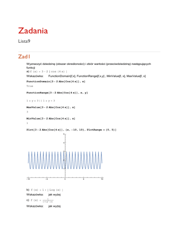 Zadania Lista9 Zad1 Wyznaczyć dziedzinę (obszar określoności) i zbiór wartości (przeciwdziedzinę) następujących funkcji a) f x 3 2 cos 4 x Wskazówka: FunctionDomain[f,x], FunctionRange[f,x,y] , MinValue[f, x], MaxValue[f, x] FunctionDomain 3 2 Abs Cos 4 x ,x True FunctionRange 3 1 y 3 1 MaxValue 3 y 2 Abs Cos 4 x , x, y 3 2 Abs Cos 4 x ,x 2 Abs Cos 4 x ,x 3 MinValue 3 1 Plot 3 2 Abs Cos 4 x , x, 10, 10 , PlotRange 5 4 3 2 1 10 b) f x 5 1 Wskazówka: c) f x 0 Log x jak wyżej 1 1 tg2 x Wskazówka: jak wyżej 5 10 0, 5 2 lista9-wskazowki.nb d) f x ln x2 1 Wskazówka: e) f x 1 jak wyżej sin x Wskazówka: 1 sin x jak wyżej Zad2 Które z podanych niżej funkcji są równe: a) f(x)=x, g(x)= x2 Wskazówka: FunctionDomain[f,x], FunctionRange[f,x,y] , Reduce[expr, var, dom] Reduce Sqrt x ^ 2 x x, x, Reals 0 FunctionRange x, x, y FunctionDomain x, x True True FunctionRange Sqrt x ^ 2 , x, y FunctionDomain Sqrt x ^ 2 , x y 0 True In[99]:= Plot x, x, 10, 10 , PlotRange 5, 5 4 2 Out[99]= 10 5 5 2 4 10 lista9-wskazowki.nb In[100]:= Plot Sqrt x ^ 2 , x, 10, 10 , PlotRange 5, 5 4 2 Out[100]= 10 5 5 10 2 4 b) f(x)=x+1, g(x)= xx2 11 Wskazówka: c) f x ln FunctionDomain[f,x], FunctionRange[f,x,y] 1 x 1 Wskazówka: , g(x)=ln x 1 x2 1 FunctionDomain[f,x], FunctionRange[f,x,y] Zad3 x2 -4, g(x)= x 4 . W jakim zbiorze X określone są funkcje Dane są funkcje f x a) f x f x g x gx : x^2 4 : Sqrt x Plot f x 4 g x , x, 10, 10 , PlotRange 5, 20 20 15 10 5 4 2 2 4 5 FunctionDomain f x x 4 b) f x g x g x ,x 6 8 10 3 4 lista9-wskazowki.nb Wskazówka: c) jak wyżej f x gx Wskazówka: jak wyżej Zad4 Dane są funkcje: x2 , g(x)= 1 2 x , h(x)=sin(x) x2 2 x 6, g x ln x , h x a) f x b) f x 2x 1 Wyznaczyć´ następujące funkcje złożone (jeśli istnieją): f(f(f(x))); g(h(f(x))); f(g(h(x))); g(f(h(x))); g(g(g(x))). a) f x g x h x f g f g g : x^2 : Sqrt 1 : Sin x f h g f g f f h h g 1 2 Sinx2 2x x x x x x x8 1 2 Sin x 1 2 Sin x 1 2 1 2 2 1 2x b) Wskazówka: jak wyżej