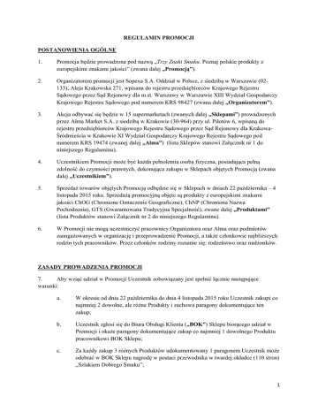 REGULAMIN PROMOCJI POSTANOWIENIA OGÓLNE 1. Promocja będzie prowadzona pod nazwą „Trzy Znaki Smaku. Poznaj polskie produkty z europejskimi znakami jakości” (zwana dalej „Promocją”). 2. Organizatorem promocji jest Sopexa S.A. Oddział w Polsce, z siedzibą w Warszawie (02133), Aleja Krakowska 271, wpisana do rejestru przedsiębiorców Krajowego Rejestru Sądowego przez Sąd Rejonowy dla m.st. Warszawy w Warszawie XIII Wydział Gospodarczy Krajowego Rejestru Sądowego pod numerem KRS 98427 (zwana dalej „Organizatorem”). 3. Akcja odbywać się będzie w 15 supermarketach (zwanych dalej „Sklepami”) prowadzonych przez Alma Market S.A. z siedzibą w Krakowie (30-964) przy ul. Pilotów 6, wpisaną do rejestru przedsiębiorców Krajowego Rejestru Sądowego przez Sąd Rejonowy dla KrakowaŚródmieścia w Krakowie XI Wydział Gospodarczy Krajowego Rejestru Sądowego pod numerem KRS 19474 (zwanej dalej „Alma”) (lista Sklepów stanowi Załącznik nr 1 do niniejszego Regulaminu). 4. Uczestnikiem Promocji może być każda pełnoletnia osoba fizyczna, posiadająca pełną zdolność do czynności prawnych, dokonująca zakupu w Sklepach objętych Promocją (zwana dalej „Uczestnikiem”). 5. Sprzedaż towarów objętych Promocją odbędzie się w Sklepach w dniach 22 października – 4 listopada 2015 roku. Sprzedażą promocyjną objęte są produkty z europejskimi znakami jakości ChOG (Chronione Oznaczenie Geograficzne), ChNP (Chroniona Nazwa Pochodzenia), GTS (Gwarantowana Tradycyjna Specjalność), zwane dalej „Produktami” (lista Produktów stanowi Załącznik nr 2 do niniejszego Regulaminu). 6. W Promocji nie mogą uczestniczyć pracownicy Organizatora oraz Alma oraz podmiotów zaangażowanych w organizację i przeprowadzenie Promocji, a także członkowie najbliższych rodzin tych pracowników. Przez członków rodziny rozumie się: rodzeństwo oraz małżonków. ZASADY PROWADZENIA PROMOCJI 7. Aby wziąć udział w Promocji Uczestnik zobowiązany jest spełnić łącznie następujące warunki: a. W okresie od dnia 22 października do dnia 4 listopada 2015 roku Uczestnik zakupi co najmniej 2 dowolne, ale różne Produkty i zachowa paragony dokumentujące ten zakup; b. Uczestnik zgłosi się do Biura Obsługi Klienta („BOK”) Sklepu biorącego udział w Promocji i okaże paragony dokumentujące zakup co najmniej 1 dowolnego Produktu pracownikowi BOK Sklepu; c. Za każdy zakup 3 różnych Produktów udokumentowany 1 paragonem Uczestnik może odebrać w BOK Sklepu nagrodę w postaci przewodnika w twardej okładce (110 stron) „Szlakiem Dobrego Smaku”; 1 d. Za każdy zakup 2 różnych Produktów udokumentowany 1 paragonem Uczestnik może otrzymać w BOK Sklepu nagrodę w postaci broszury w miękkiej okładce (62 strony) „Szlakiem Dobrego Smaku”. e. Za każdy zakup 1 Produktu udokumentowany 1 paragonem Uczestnik może otrzymać w BOK Sklepu nagrodę w postaci torby bawełnianej Trzy znaki smaku. 8. Po wydaniu Uczestnikowi nagrody w Promocji pracownik BOK Sklepu napisze na paragonie wydanym Uczestnikowi „WN”, co oznaczać będzie, że Nagroda została wydana. W przypadku, gdy Uczestnik nie odbierze nagrody w Promocji w terminie do dnia 5 listopada 2015 roku uznaje się, że Uczestnik zrzekł się prawa do nagrody (odbiór nagrody po dniu 5 listopada 2015 roku jest niemożliwy) 9. Każdy Uczestnik może odebrać dowolną liczbę nagród, jeżeli spełnia wszystkie wymogi zawarte w pkt 7 niniejszego Regulaminu (do wyczerpania zapasów nagród – ilość nagród została określona w pkt 11. Regulaminu poniżej). NAGRODY 10. Nagrody są dostępne do wyczerpania zapasów. 11. Gwarantowana ilość nagród (w 15 Sklepach): - Przewodniki w twardej okładce „Szlakiem Dobrego Smaku” 900 szt. o wartości 20 zł/sztukę, czyli o łącznej wartości 18000 zł; - Broszury w miękkiej okładce „Szlakiem Dobrego Smaku” 4200 szt. o wartości 11,50 zł/sztukę, czyli o łącznej wartości 48300zł - Torby bawełniane 1500szt o wartości 10zł/sztukę, czyli o łącznej wartości 15000zł POSTANOWIENIA KOŃCOWE 12. Odbiorcy nagrody nie przysługuje prawo do zastrzeżenia szczególnych właściwości nagrody ani do otrzymania jej ekwiwalentu (pieniężnego, rzeczowego). 13. W Promocji biorą udział wyłącznie oryginalne paragony. Poza innymi zapisami w niniejszym Regulaminie paragony podrobione, przerobione, zniszczone lub uszkodzone w sposób uniemożliwiający weryfikację ich autentyczności nie uprawniają do udziału w Promocji. 14. W razie utraty lub zniszczenia paragonu Uczestnikowi nie przysługują żadne roszczenia wobec Organizatora. 15. Uczestnik Promocji poprzez fakt przystąpienia do Promocji wyraża zgodę na wykorzystanie i przetwarzanie przez Organizatora jego danych osobowych na potrzeby przeprowadzenia Promocji na warunkach określonych w ustawie z dnia 29 sierpnia 1997 r. o ochronie danych osobowych. Podanie danych przez Uczestników jest dobrowolne. Każdy Uczestnik ma prawo wglądu w swoje dane oraz prawo ich poprawiania i usuwania. Administratorem danych osobowych Uczestników jest Organizator. 2 16. Wszystkie treści zawarte w materiałach reklamowo-promocyjnych mają charakter jedynie informacyjny. Moc prawną mają jedynie postanowienia niniejszego Regulaminu i obowiązujące przepisy prawa. 17. W kwestiach nieuregulowanych w niniejszym Regulaminie mają zastosowanie przepisy Kodeksu cywilnego. 18. Reklamacje związane z Promocją mogą być składane na adres Organizatora. Reklamacje rozpatrzone zostaną w terminie 7 dni kalendarzowych od daty ich otrzymania przez Organizatora. O decyzji Organizatora Uczestnik zostanie powiadomiony listem poleconym wysłanym na adres podany w reklamacji w terminie 7 dni od daty otrzymania reklamacji przez Organizatora. Po wyczerpaniu postępowania reklamacyjnego Uczestnikowi przysługuje prawo dochodzenia roszczeń w sądzie powszechnym. 19. Regulamin Promocji dostępny jest w siedzibie Organizatora, na stro