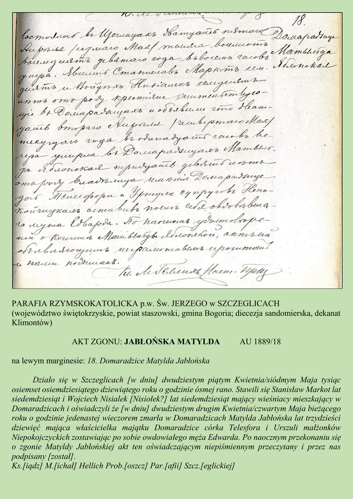 PARAFIA RZYMSKOKATOLICKA p.w. Św. JERZEGO w SZCZEGLICACH (województwo świętokrzyskie, powiat staszowski, gmina Bogoria; diecezja sandomierska, dekanat Klimontów) AKT ZGONU: JABŁOŃSKA MATYLDA AU 1889/18 na lewym marginesie: 18. Domaradzice Matylda Jabłońska Działo się w Szczeglicach [w dniu] dwudziestym piątym Kwietnia/siódmym Maja tysiąc osiemset osiemdziesiątego dziewiątego roku o godzinie ósmej rano. Stawili się Stanisław Markot lat siedemdziesiąt i Wojciech Nisialek [Nisiołek?] lat siedemdziesiąt mający wieśniacy mieszkający w Domaradzicach i oświadczyli że [w dniu] dwudziestym drugim Kwietnia/czwartym Maja bieżącego roku o godzinie jedenastej wieczorem zmarła w Domaradzicach Matylda Jabłońska lat trzydzieści dziewięć mająca właścicielka majątku Domaradzice córka Telesfora i Urszuli małżonków Niepokojczyckich zostawiając po sobie owdowiałego męża Edwarda. Po naocznym przekonaniu się o zgonie Matyldy Jabłońskiej akt ten oświadczającym niepiśmiennym przeczytany i przez nas podpisany [został]. Ks.[iądz] M.[ichał] Hellich Prob.[oszcz] Par.[afii] Szcz.[eglickiej]