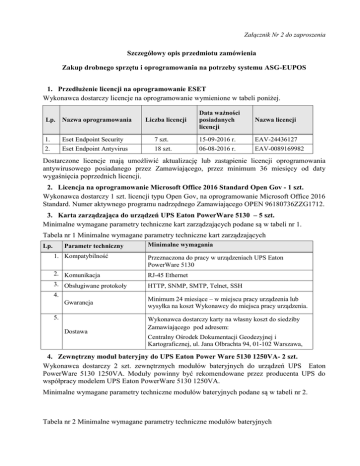 Załącznik Nr 2 do zaproszenia Szczegółowy opis przedmiotu zamówienia Zakup drobnego sprzętu i oprogramowania na potrzeby systemu ASG-EUPOS 1. Przedłużenie licencji na oprogramowanie ESET Wykonawca dostarczy licencje na oprogramowanie wymienione w tabeli poniżej. Lp. Nazwa oprogramowania Liczba licencji Data ważności posiadanych licencji Nazwa licencji 1. Eset Endpoint Security 7 szt. 15-09-2016 r. EAV-24436127 2. Eset Endpoint Antyvirus 18 szt. 06-08-2016 r. EAV-0089169982 Dostarczone licencje mają umożliwić aktualizację lub zastąpienie licencji oprogramowania antywirusowego posiadanego przez Zamawiającego, przez minimum 36 miesięcy od daty wygaśnięcia poprzednich licencji. 2. Licencja na oprogramowanie Microsoft Office 2016 Standard Open Gov - 1 szt. Wykonawca dostarczy 1 szt. licencji typu Open Gov, na oprogramowanie Microsoft Office 2016 Standard. Numer aktywnego programu nadrzędnego Zamawiającego OPEN 96180736ZZG1712. 3. Karta zarządzająca do urządzeń UPS Eaton PowerWare 5130 – 5 szt. Minimalne wymagane parametry techniczne kart zarządzających podane są w tabeli nr 1. Tabela nr 1 Minimalne wymagane parametry techniczne kart zarządzających Lp. Parametr techniczny Minimalne wymagania 1. Kompatybilność Przeznaczona do pracy w urządzeniach UPS Eaton PowerWare 5130 2. Komunikacja 3. Obsługiwane protokoły RJ-45 Ethernet 4. Minimum 24 miesiące – w miejscu pracy urządzenia lub wysyłka na koszt Wykonawcy do miejsca pracy urządzenia. Gwarancja 5. Dostawa HTTP, SNMP, SMTP, Telnet, SSH Wykonawca dostarczy karty na własny koszt do siedziby Zamawiającego pod adresem: Centralny Ośrodek Dokumentacji Geodezyjnej i Kartograficznej, ul. Jana Olbrachta 94, 01-102 Warszawa, 4. Zewnętrzny moduł bateryjny do UPS Eaton Power Ware 5130 1250VA- 2 szt. Wykonawca dostarczy 2 szt. zewnętrznych modułów bateryjnych do urządzeń UPS Eaton PowerWare 5130 1250VA. Moduły powinny być rekomendowane przez producenta UPS do współpracy modelem UPS Eaton PowerWare 5130 1250VA. Minimalne wymagane parametry techniczne modułów bateryjnych podane są w tabeli nr 2. Tabela nr 2 Minimalne wymagane parametry techniczne modułów bateryjnych Lp. Parametr techniczny Minimalne wymagania 1. Obudowa Typu RACK 2. Kompatybilność Z modelem Eaton PW5130 Minimum 24 miesiące – w miejscu pracy urządzenia lub wysyłka na koszt wykonawcy do miejsca pracy urządzenia. Baterie znajdujące się w dostarczanych modułach nie powinny być wyprodukowane wcześniej niż 6 miesięcy przed datą podpisania umowy na dostawę. Elementy montażowe do umieszczenia w szafie RACK Wykonawca dostarczy moduły na własny koszt do siedziby Zamawiającego, pod adresem: Centralny Ośrodek Dokumentacji Geodezyjnej i Kartograficznej, ul. Jana Olbrachta 94, 01-102 Warszawa 3. Gwarancja 4. Akumulatory 5. W zestawie 6. Dostawa Wszystkie dostarczone urządzenia mają być fabrycznie nowe, zamknięte w oryginalnych opakowaniach.