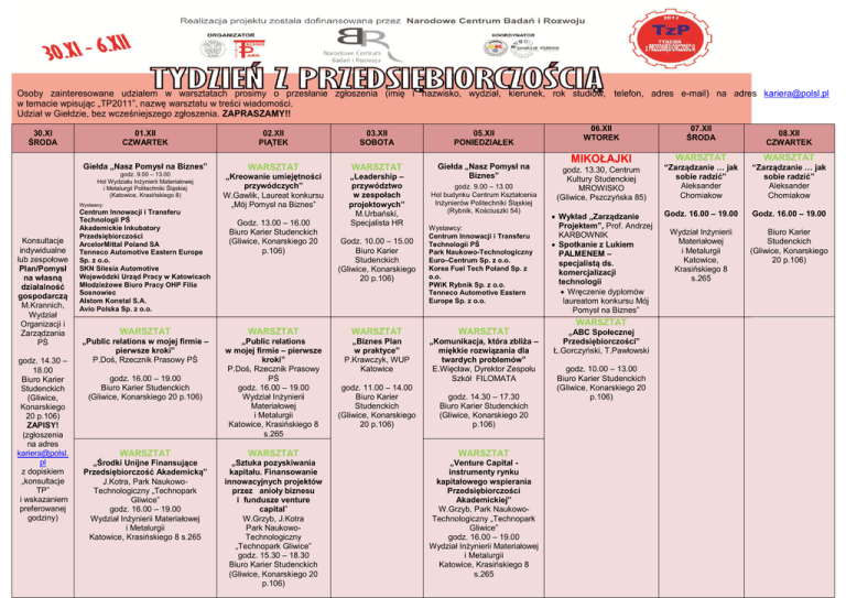 Osoby zainteresowane udziałem w warsztatach prosimy o przesłanie zgłoszenia (imię i nazwisko, wydział, kierunek, rok studiów, telefon, adres e-mail) na adres [email protected] w temacie wpisując „TP2011”, nazwę warsztatu w treści wiadomości. Udział w Giełdzie, bez wcześniejszego zgłoszenia. ZAPRASZAMY!! 30.XI ŚRODA 01.XII CZWARTEK 02.XII PIĄTEK 03.XII SOBOTA 05.XII PONIEDZIAŁEK Giełda „Nasz Pomysł na Biznes” WARSZTAT WARSZTAT „Kreowanie umiejętności przywódczych” W.Gawlik, Laureat konkursu „Mój Pomysł na Biznes” „Leadership – przywództwo w zespołach projektowych” M.Urbański, Specjalista HR Giełda „Nasz Pomysł na Biznes” godz. 9.00 – 13.00 Hol Wydziału Inżynierii Materiałowej i Metalurgii Politechniki Śląskiej (Katowice, Krasińskiego 8) Wystawcy: Konsultacje indywidualne lub zespołowe Plan/Pomysł na własną działalność gospodarczą M.Krannich, Wydział Organizacji i Zarządzania PŚ godz. 14.30 – 18.00 Biuro Karier Studenckich (Gliwice, Konarskiego 20 p.106) ZAPISY! (zgłoszenia na adres kariera@polsl. pl z dopiskiem „konsultacje TP” i wskazaniem preferowanej godziny) Centrum Innowacji i Transferu Technologii PŚ Akademickie Inkubatory Przedsiębiorczości ArcelorMittal Poland SA Tenneco Automotive Eastern Europe Sp. z o.o. SKN Silesia Automotive Wojewódzki Urząd Pracy w Katowicach Młodzieżowe Biuro Pracy OHP Filia Sosnowiec Alstom Konstal S.A. Avio Polska Sp. z o.o. Godz. 13.00 – 16.00 Biuro Karier Studenckich (Gliwice, Konarskiego 20 p.106) Godz. 10.00 – 15.00 Biuro Karier Studenckich (Gliwice, Konarskiego 20 p.106) godz. 9.00 – 13.00 Hol budynku Centrum Kształcenia Inżynierów Politechniki Śląskiej (Rybnik, Kościuszki 54) Wystawcy: Centrum Innowacji i Transferu Technologii PŚ Park Naukowo-Technologiczny Euro–Centrum Sp. z o.o. Korea Fuel Tech Poland Sp. z o.o. PWiK Rybnik Sp. z o.o. Tenneco Automotive Eastern Europe Sp. z o.o. 06.XII WTOREK MIKOŁAJKI WARSZTAT WARSZTAT WARSZTAT „Public relations w mojej firmie – pierwsze kroki” P.Doś, Rzecznik Prasowy PŚ „Public relations w mojej firmie – pierwsze kroki” P.Doś, Rzecznik Prasowy PŚ godz. 16.00 – 19.00 Wydział Inżynierii Materiałowej i Metalurgii Katowice, Krasińskiego 8 s.265 „Biznes Plan w praktyce” P.Krawczyk, WUP Katowice „Komunikacja, która zbliża – miękkie rozwiązania dla twardych problemów” E.Więcław, Dyrektor Zespołu Szkół FILOMATA godz. 16.00 – 19.00 Biuro Karier Studenckich (Gliwice, Konarskiego 20 p.106) godz. 11.00 – 14.00 Biuro Karier Studenckich (Gliwice, Konarskiego 20 p.106) godz. 14.30 – 17.30 Biuro Karier Studenckich (Gliwice, Konarskiego 20 p.106) WARSZTAT WARSZTAT WARSZTAT „Środki Unijne Finansujące Przedsiębiorczość Akademicką” J.Kotra, Park NaukowoTechnologiczny „Technopark Gliwice” godz. 16.00 – 19.00 Wydział Inżynierii Materiałowej i Metalurgii Katowice, Krasińskiego 8 s.265 „Sztuka pozyskiwania kapitału. Finansowanie innowacyjnych projektów przez anioły biznesu i fundusze venture capital” W.Grzyb, J.Kotra Park NaukowoTechnologiczny „Technopark Gliwice” godz. 15.30 – 18.30 Biuro Karier Studenckich (Gliwice, Konarskiego 20 p.106) „Venture Capital instrumenty rynku kapitałowego wspierania Przedsiębiorczości Akademickiej” W.Grzyb, Park NaukowoTechnologiczny „Technopark Gliwice” godz. 16.00 – 19.00 Wydział Inżynierii Materiałowej i Metalurgii Katowice, Krasińskiego 8 s.265 08.XII CZWARTEK WARSZTAT WARSZTAT godz. 13.30, Centrum Kultury Studenckiej MROWISKO (Gliwice, Pszczyńska 85) “Zarządzanie … jak sobie radzić” Aleksander Chomiakow “Zarządzanie … jak sobie radzić” Aleksander Chomiakow Wykład „Zarządzanie Projektem”, Prof. Andrzej KARBOWNIK Spotkanie z Lukiem PALMENEM – specjalistą ds. komercjalizacji technologii Wręczenie dyplomów laureatom konkursu Mój Pomysł na Biznes” Godz. 16.00 – 19.00 Godz. 16.00 – 19.00 Wydział Inżynierii Materiałowej i Metalurgii Katowice, Krasińskiego 8 s.265 Biuro Karier Studenckich (Gliwice, Konarskiego 20 p.106) WARSZTAT WARSZTAT 07.XII ŚRODA „ABC Społecznej Przedsiębiorczości” Ł.Gorczyński, T.Pawłowski godz. 10.00 – 13.00 Biuro Karier Studenckich (Gliwice, Konarskiego 20 p.106)