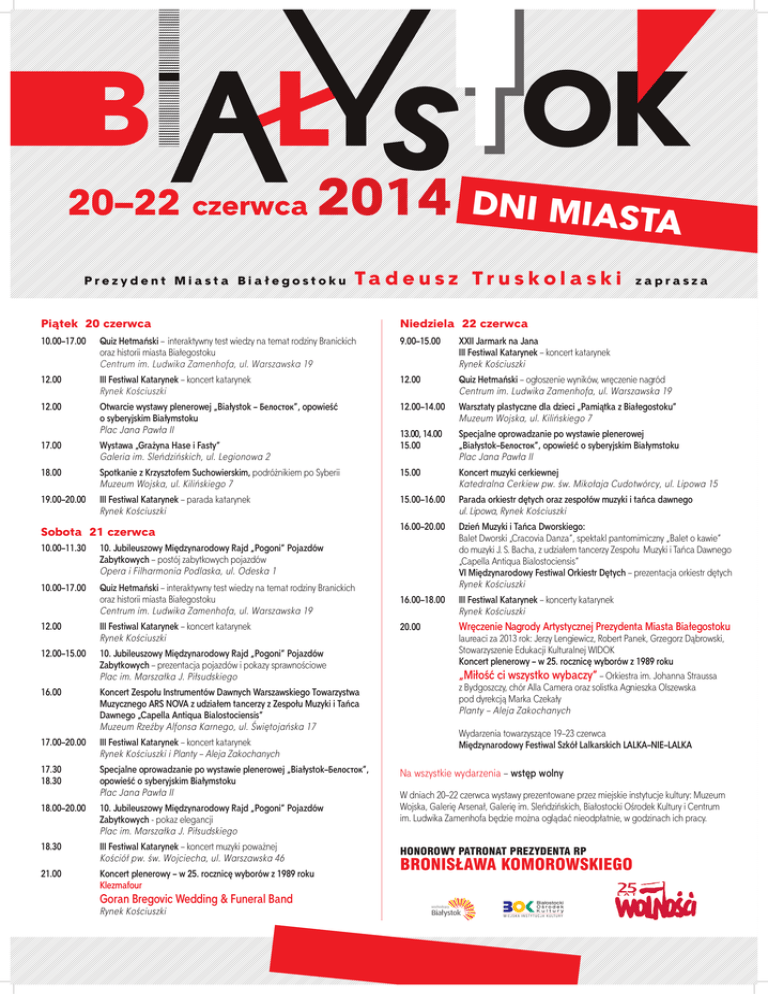 20–22 czerwca 2014 Prezydent Miasta Białegostoku DNI MIAS TA Ta d e u s z Tr u s k o l a s k i zaprasza Piątek 20 czerwca Niedziela 22 czerwca 10.00–17.00 Quiz Hetmański – interaktywny test wiedzy na temat rodziny Branickich oraz historii miasta Białegostoku Centrum im. Ludwika Zamenhofa, ul. Warszawska 19 9.00–15.00 XXII Jarmark na Jana III Festiwal Katarynek – koncert katarynek Rynek Kościuszki 12.00 III Festiwal Katarynek – koncert katarynek Rynek Kościuszki 12.00 Quiz Hetmański – ogłoszenie wyników, wręczenie nagród Centrum im. Ludwika Zamenhofa, ul. Warszawska 19 12.00 Otwarcie wystawy plenerowej „Białystok – Белосток”, opowieść o syberyjskim Białymstoku Plac Jana Pawła II 12.00–14.00 Warsztaty plastyczne dla dzieci „Pamiątka z Białegostoku” Muzeum Wojska, ul. Kilińskiego 7 13.00, 14.00 15.00 Specjalne oprowadzanie po wystawie plenerowej „Białystok–Белосток”, opowieść o syberyjskim Białymstoku Plac Jana Pawła II 17.00 Wystawa „Grażyna Hase i Fasty” Galeria im. Sleńdzińskich, ul. Legionowa 2 18.00 Spotkanie z Krzysztofem Suchowierskim, podróżnikiem po Syberii Muzeum Wojska, ul. Kilińskiego 7 15.00 Koncert muzyki cerkiewnej Katedralna Cerkiew pw. św. Mikołaja Cudotwórcy, ul. Lipowa 15 19.00–20.00 III Festiwal Katarynek – parada katarynek Rynek Kościuszki 15.00–16.00 Parada orkiestr dętych oraz zespołów muzyki i tańca dawnego ul. Lipowa, Rynek Kościuszki 16.00–20.00 Dzień Muzyki i Tańca Dworskiego: Balet Dworski „Cracovia Danza”, spektakl pantomimiczny „Balet o kawie” do muzyki J. S. Bacha, z udziałem tancerzy Zespołu Muzyki i Tańca Dawnego „Capella Antiqua Bialostociensis” VI Międzynarodowy Festiwal Orkiestr Dętych – prezentacja orkiestr dętych Rynek Kościuszki 16.00–18.00 III Festiwal Katarynek – koncerty katarynek Rynek Kościuszki 20.00 Wręczenie Nagrody Artystycznej Prezydenta Miasta Białegostoku Sobota 21 czerwca 10.00–11.30 10. Jubileuszowy Międzynarodowy Rajd „Pogoni” Pojazdów Zabytkowych – postój zabytkowych pojazdów Opera i Filharmonia Podlaska, ul. Odeska 1 10.00–17.00 Quiz Hetmański – interaktywny test wiedzy na temat rodziny Branickich oraz historii miasta Białegostoku Centrum im. Ludwika Zamenhofa, ul. Warszawska 19 12.00 III Festiwal Katarynek – koncert katarynek Rynek Kościuszki 12.00–15.00 10. Jubileuszowy Międzynarodowy Rajd „Pogoni” Pojazdów Zabytkowych – prezentacja pojazdów i pokazy sprawnościowe Plac im. Marszałka J. Piłsudskiego 16.00 Koncert Zespołu Instrumentów Dawnych Warszawskiego Towarzystwa Muzycznego ARS NOVA z udziałem tancerzy z Zespołu Muzyki i Tańca Dawnego „Capella Antiqua Bialostociensis” Muzeum Rzeźby Alfonsa Karnego, ul. Świętojańska 17 17.00–20.00 III Festiwal Katarynek – koncert katarynek Rynek Kościuszki i Planty – Aleja Zakochanych 17.30 18.30 Specjalne oprowadzanie po wystawie plenerowej „Białystok–Белосток”, opowieść o syberyjskim Białymstoku Plac Jana Pawła II 18.00–20.00 10. Jubileuszowy Międzynarodowy Rajd „Pogoni” Pojazdów Zabytkowych - pokaz elegancji Plac im. Marszałka J. Piłsudskiego 18.30 III Festiwal Katarynek – koncert muzyki poważnej Kościół pw. św. Wojciecha, ul. Warszawska 46 21.00 Koncert plenerowy – w 25. rocznicę wyborów z 1989 roku Klezmafour Goran Bregovic Wedding & Funeral Band Rynek Kościuszki laureaci za 2013 rok: Jerzy Lengiewicz, Robert Panek, Grzegorz Dąbrowski, Stowarzyszenie Edukacji Kulturalnej WIDOK Koncert plenerowy – w 25. rocznicę wyborów z 1989 roku „Miłość ci wszystko wybaczy” – Orkiestra im. Johanna Straussa z Bydgoszczy, chór Alla Camera oraz solistka Agnieszka Olszewska pod dyrekcją Marka Czekały Planty – Aleja Zakochanych Wydarzenia towarzyszące 19–23 czerwca Międzynarodowy Festiwal Szkół Lalkarskich LALKA–NIE–LALKA Na wszystkie wydarzenia – wstęp wolny W dniach 20–22 czerwca wystawy prezentowane przez miejskie instytucje kultury: Muzeum Wojska, Galerię Arsenał, Galerię im. Sleńdzińskich, Białostocki Ośrodek Kultury i Centrum im. Ludwika Zamenhofa będzie można oglądać nieodpłatnie, w godzinach ich pracy. HONOROWY PATRONAT PREZYDENTA RP BRONISŁAWA KOMOROWSKIEGO