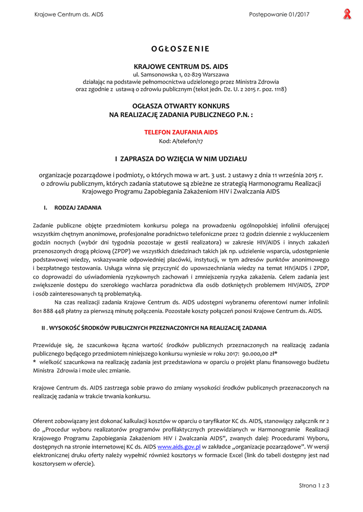 Krajowe Centrum ds. AIDS Postępowanie 01/2017 OGŁOSZENIE KRAJOWE CENTRUM DS. AIDS ul. Samsonowska 1, 02-829 Warszawa działając na podstawie pełnomocnictwa udzielonego przez Ministra Zdrowia oraz zgodnie z ustawą o zdrowiu publicznym (tekst jedn. Dz. U. z 2015 r. poz. 1118) OGŁASZA OTWARTY KONKURS NA REALIZACJĘ ZADANIA PUBLICZNEGO P.N. : TELEFON ZAUFANIA AIDS Kod: A/telefon/17 I ZAPRASZA DO WZIĘCIA W NIM UDZIAŁU organizacje pozarządowe i podmioty, o których mowa w art. 3 ust. 2 ustawy z dnia 11 września 2015 r. o zdrowiu publicznym, których zadania statutowe są zbieżne ze strategią Harmonogramu Realizacji Krajowego Programu Zapobiegania Zakażeniom HIV i Zwalczania AIDS I. RODZAJ ZADANIA Zadanie publiczne objęte przedmiotem konkursu polega na prowadzeniu ogólnopolskiej infolinii oferującej wszystkim chętnym anonimowe, profesjonalne poradnictwo telefoniczne przez 12 godzin dziennie z wykluczeniem godzin nocnych (wybór dni tygodnia pozostaje w gestii realizatora) w zakresie HIV/AIDS i innych zakażeń przenoszonych drogą płciową (ZPDP) we wszystkich dziedzinach takich jak np. udzielenie wsparcia, udostępnienie podstawowej wiedzy, wskazywanie odpowiedniej placówki, instytucji, w tym adresów punktów anonimowego i bezpłatnego testowania. Usługa winna się przyczynić do upowszechniania wiedzy na temat HIV/AIDS i ZPDP, co doprowadzi do uświadomienia ryzykownych zachowań i zmniejszenia ryzyka zakażenia. Celem zadania jest zwiększenie dostępu do szerokiego wachlarza poradnictwa dla osób dotkniętych problemem HIV/AIDS, ZPDP i osób zainteresowanych tą problematyką. Na czas realizacji zadania Krajowe Centrum ds. AIDS udostępni wybranemu oferentowi numer infolinii: 801 888 448 płatny za pierwszą minutę połączenia. Pozostałe koszty połączeń ponosi Krajowe Centrum ds. AIDS. II . WYSOKOŚĆ ŚRODKÓW PUBLICZNYCH PRZEZNACZONYCH NA REALIZACJĘ ZADANIA Przewiduje się, że szacunkowa łączna wartość środków publicznych przeznaczonych na realizację zadania publicznego będącego przedmiotem niniejszego konkursu wyniesie w roku 2017: 90.000,00 zł* * wielkość szacunkowa na realizację zadania jest przedstawiona w oparciu o projekt planu finansowego budżetu Ministra Zdrowia i może ulec zmianie. Krajowe Centrum ds. AIDS zastrzega sobie prawo do zmiany wysokości środków publicznych przeznaczonych na realizację zadania w trakcie trwania konkursu. Oferent zobowiązany jest dokonać kalkulacji kosztów w oparciu o taryfikator KC ds. AIDS, stanowiący załącznik nr 2 do „Procedur wyboru realizatorów programów profilaktycznych przewidzianych w Harmonogramie Realizacji Krajowego Programu Zapobiegania Zakażeniom HIV i Zwalczania AIDS”, zwanych dalej: Procedurami Wyboru, dostępnych na stronie internetowej KC ds. AIDS www.aids.gov.pl w zakładce „organizacje pozarządowe”. W wersji elektronicznej druku oferty należy wypełnić również kosztorys w formacie Excel (link do tabeli dostępny jest nad kosztorysem w ofercie). Strona 1 z 3 Krajowe Centrum ds. AIDS Postępowanie 01/2017 III. TERMIN I WARUNKI UBIEGANIA SIĘ O REALIZACJĘ ZADANIA PUBLICZNEGO 1. Termin realizacji zadania: od 02 stycznia 2017 r. do 31 grudnia 2017 r. 2. Warunki ubiegania się o realizację zadania publicznego: O realizację zadania może ubiegać się każdy oferent, który spełnia wszystkie wymienione niżej warunki: 1) posiada status organizacji pozarządowej w rozumieniu art. 3 ust. 2 ustawy o zdrowiu publicznym, lub podmiotu, o którym mowa w art. 3 ust. 2 cyt. ustawy; 2) jego zadania statutowe są zbieżne z obszarem, którego dotyczy otwarty konkurs ofert; 3) jest wiarygodny pod względem finansowym; 4) dysponuje środkami finansowym własnymi i/lub z innych źródeł, wkładem osobowym (praca społeczna członków i świadczenia wolontariuszy na podstawie umów lub porozumień) w realizacji zadania co najmniej 10%; 5) wykaże, że przez cały okres realizacji zadania publicznego dysponować będzie kadrą odpowiednio wyszkoloną, doświadczoną i zdolną do realizacji zadania publicznego będącego przedmiotem konkursu. Ocena spełnienia w/w warunków ubiegania się o realizację zadania publicznego dokonywana będzie na podstawie załączonych do oferty dokumentów wymienionych w pkt 7 p.n. „Wymagania formalne stawiane Oferentom” Rozdziału 3 Procedur Wyboru. Jeżeli z treści tych dokumentów wynikać będzie, że Oferent spełnia wyżej opisane warunki, Krajowe Centrum ds. AIDS uzna, je za spełnione. Jeżeli natomiast Oferent nie załączy do oferty, któregokolwiek z dokumentów wymienionych w pkt.7 Rozdziału 3 Procedur wyboru lub z treści załączonych dokumentów będzie wynikać, że oferta nie spełnia tych warunków, Krajowe Centrum ds. AIDS uzna je za niespełnione. IV. ZASADY PRZYZNAWANIA DOTACJI Dotacja budżetowa na realizację zadania publicznego objętego przedmiotem konkursu może zostać przyznana oferentowi: 1) którego rozliczenie z wcześniej otrzymanych dotacji budżetowych zostało zaakceptowane w całości w terminie określonym przez Krajowe Centrum ds. AIDS, ale nie później niż przed dniem rozstrzygnięcia niniejszego konkursu; 2) który złoży ofertę spełniającą wszystkie wymagania formalne i merytoryczne określone w Rozdziale 3 pkt 7 i 8 Procedur Wyboru; 3) który zostanie zakwalifikowany przez Komisję Konkursową (w oparciu o kryteria oceny ofert wskazane w Rozdziale VI. pkt 2 niniejszego ogłoszenia) do realizacji zadania publicznego i przyznania na ten cel dotacji budżetowej. Dotacja celowa na realizację zadania publicznego objętego przedmiotem niniejszego konkursu przyznawana jest ze środków budżetu Ministra Zdrowia przeznaczonych na realizację zadań z zakresu problematyki HIV/AIDS - w drodze umowy zawieranej z Ministrem Zdrowia, w imieniu którego działa Krajowe Centrum ds. AIDS . Zlecanie realizacji zadania publicznego i udzielanie na ten cel dotacji budżetowej, odbywa się z zachowaniem przepisów usta