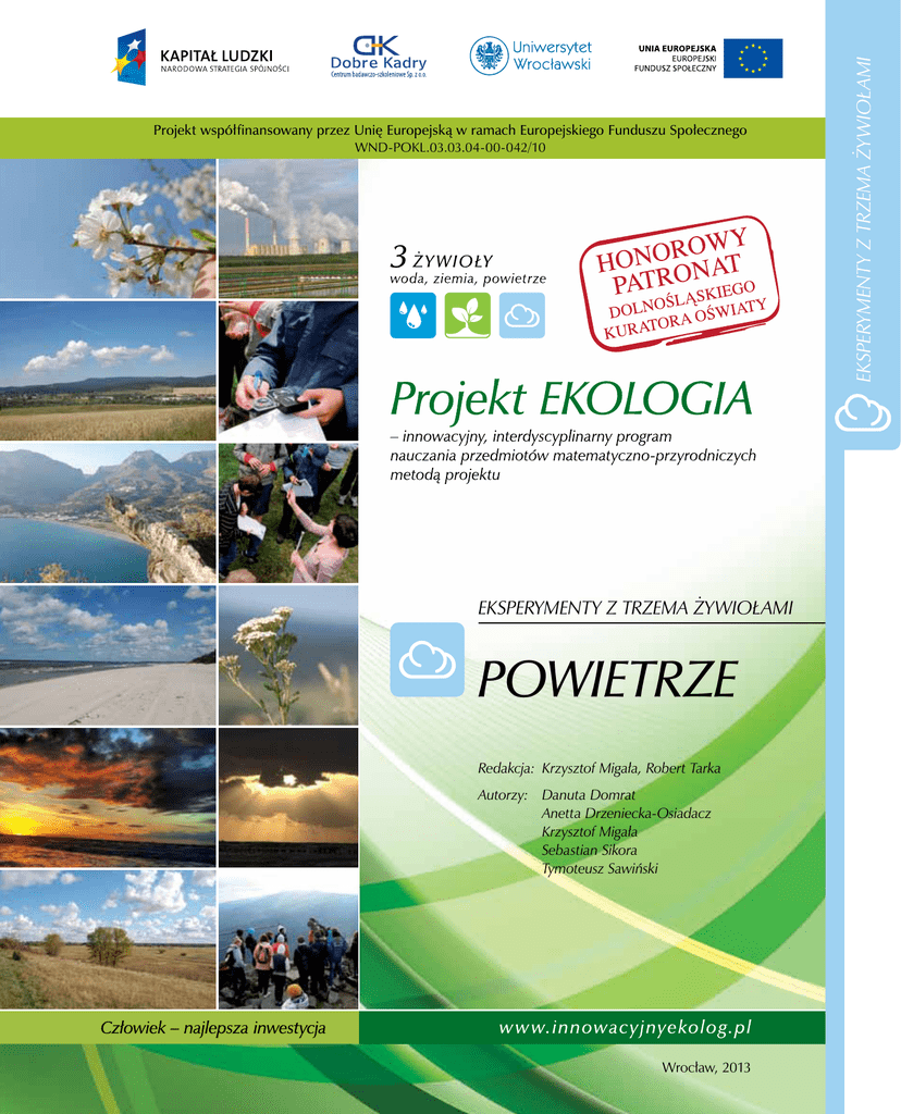 EKSPERYMENTY Z TRZEMA ŻYWIOŁAMI POWIETRZE Redakcja: Krzysztof Migała, Robert Tarka Autorzy: Danuta Domrat Anetta Drzeniecka-Osiadacz Krzysztof Migała Sebastian Sikora Tymoteusz Sawiński Wrocław, 2013 EKSPERYMENTY Z TRZEMA ŻYWIOŁAMI Projekt współfinansowany przez Unię Europejską w ramach Europejskiego Funduszu Społecznego WND-POKL.03.03.04-00-042/10 P4. OBSERWUJEMY POGODĘ Wydział Nauk o Ziemi i Kształtowania Środowiska ul. Kuźnicza 35 50-138 Wrocław Eksperymenty z trzema żywiołami POWIETRZE Redakcja: Krzysztof Migała, Robert Tarka Autorzy: Danuta Domrat, Anetta Drzeniecka-Osiadacz, Krzysztof Migała Sebastian Sikora, Tymoteusz Sawiński 1 P4. OBSERWUJEMY POGODĘ Recenzenci: Lidia Borowska Maria Tkaczyk-Dynel Ryszard Pawlak Lucyna Zygmunt Opracowanie redakcyjne: Krzysztof Moskwa Opracowanie graficzne: Anetta Drzeniecka-Osiadacz, Krzysztof Migała, Sebastian Sikora, Tymoteusz Sawiński Fotografie: Sebastian Sikora (SS), Krzysztof Migała (KMi), Robert Tarka (RT), Michał Drzeniecki (MD) Tymoteusz Sawiński (TS), Anetta Drzeniecka-Osiadacz (ADO), NASA, serwis fotolia Projekt graficzny okładki: MP Design Marta Płonka Skład komputerowy: KAMBIT Graf Marcin Klekotko Wszelkie prawa zastrzeżone. Żadna część niniejszej książki, zarówno w całości, jaki i we fragmentach, nie może być reprodukowana w sposób elektroniczny, fotograficzny i inny bez zgody wydawcy i właścicieli praw autorskich. © Copyright by Uniwersytet Wrocławski Wrocław 2013 Wydanie drugie poprawione Publikacja współfinansowana przez Unię Europejską w ramach Europejskiego Funduszu Społecznego oraz budżet Państwa. „Projekt Ekologia – innowacyjny, interdyscyplinarny program nauczania przedmiotów matematyczno-przyrodniczych metodą projektu” realizowany jest pod nadzorem Ministerstwa Edukacji Narodowej w ramach Programu Operacyjnego Kapitał Ludzki w partnerstwie czterech podmiotów: Lider – Dobre Kadry, Centrum badawczo-szkoleniowe. Sp. z o.o., Partner 1 – Uniwersytet Wrocławski Wydział Nauk o Ziemi i Kształtowania Środowiska, Partner 2 – SGS Eko-Projekt sp. z o.o. Pszczyna, Partner 3 – Dr. Kerth + Lampe Geo-Infometric GmbH (Niemcy). Publikacja dystrybuowana bezpłatnie 2 P4. OBSERWUJEMY POGODĘ Spis treści Wstęp....................................................................................................................................................................... 4 P4.1. OBSERWUJEMY POGODĘ................................................................................................................................ 5 P4.1. Jak to się robi?........................................................................................................................................ 5 P4.2. Na tropie pogody…................................................................................................................................. 11 P4.3. Dane, analizy i wnioski........................................................................................................................... 14 P4.4. Nasze laboratorium pogody................................................................................................................... 17 P4.5. Nasz biuletyn.......................................................................................................................................... 21 P5. CZY WIESZ, CZYM ODDYCHASZ?......................................................................................................................... 23 P5.1. Powietrze wokół nas............................................................................................................................... 23 P5.2. Zanieczyszczenia powietrza a jakość wody opadowej............................................................................ 28 P5.3. Jak bada się zanieczyszczenia powietrza?.............................................................................................. 31 P5.4. Pogoda a chemizm atmosfery................................................................................................................ 32 P5.5. Jak dbać o czyste powietrze w mojej miejscowości?.............................................................................. 35 P6. ŚRODOWISKOWI DYWERSANCI – HAŁAS, ODÓR I NADMIERNE OŚWIETLENIE.................................................. 39 P6.1. Hałas, odór i nadmierne oświetlenie – rozpoznajemy skalę problemu.................................................. 39 P6.2. Hałas wokół nas...................................................................................................................................... 42 P6.3. Zapachy w naszym otoczeniu................................................................................................................. 48 P6.4. Czy światło może być uciążliwe?............................................................................................................ 53 P7. POGODA W NASZYM ŻYCIU................................................................................................................................ 59 P7.1. Porzekadła ludowe i przysłowia a prognozy pogody.............................................................................. 59 P7.2. Meteoropaci czy hipochondrycy?.......................................................................................................... 64 P7.3. Bioklimat naszej okolicy......................................................................................................................... 67 P8. ZANIECZYSZCZENIA POWIETRZA – LICZY SIĘ TYLKO DAWKA?............................................................................. 75 P8.1. Zanieczyszczenia powietrza.................................................................................................................... 75 P8.2. System monitoringu powietrza – wycieczka...........................................................................