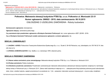8.10.2015 bzp0.portal.uzp.gov.pl/index.php?ogloszenie=show&pozycja=266922&rok=20151008 Ogłoszenie powiązane: Ogłoszenie nr 2201602015 z dnia 20150826 r. Ogłoszenie o zamówieniu Polkowice Przedmiotem zamówienia jest malowanie odtworzeniowe zabrudzonych elewacji budynków ocieplonych w technologii lekkiej mokrej w Polkowicach przy ul. Moniuszki 2331. Zakres robót budowlanych obejmuje m.in.: zabezpieczenie folią budowlaną... Termin składania ofert: 20150910 Polkowice: Malowanie elewacji budynków PTBS Sp. z o.o. Polkowice ul. Moniuszki 2331 Numer ogłoszenia: 266922 2015; data zamieszczenia: 08.10.2015 OGŁOSZENIE O UDZIELENIU ZAMÓWIENIA Roboty budowlane Zamieszczanie ogłoszenia: obowiązkowe. Ogłoszenie dotyczy: zamówienia publicznego. Czy zamówienie było przedmiotem ogłoszenia w Biuletynie Zamówień Publicznych: tak, numer ogłoszenia w BZP: 220160 2015r. Czy w Biuletynie Zamówień Publicznych zostało zamieszczone ogłoszenie o zmianie ogłoszenia: nie. SEKCJA I: ZAMAWIAJĄCY I. 1) NAZWA I ADRES: Polkowickie Towarzystwo Budownictwa Społecznego Sp. z o.o., Rynek 6, 59100 Polkowice, woj. dolnośląskie, tel. 076 749 33 74, faks 076 749 33 70. I. 2) RODZAJ ZAMAWIAJĄCEGO: Inny: Spółka z o.o. stanowiąca 100% własność gminy. SEKCJA II: PRZEDMIOT ZAMÓWIENIA II.1) Nazwa nadana zamówieniu przez zamawiającego: Malowanie elewacji budynków PTBS Sp. z o.o. Polkowice ul. Moniuszki 2331. II.2) Rodzaj zamówienia: Roboty budowlane. II.3) Określenie przedmiotu zamówienia: Przedmiotem zamówienia jest malowanie odtworzeniowe zabrudzonych elewacji budynków ocieplonych w technologii lekkiej mokrej w Polkowicach przy ul. Moniuszki 2331. Zakres robót budowlanych obejmuje m.in.: zabezpieczenie folią budowlaną osłonową przed zabrudzeniem okien, drzwi, cokołów budynku, opasek przyściennych na szerokości ok. 1,0m ustawienie i demontaż rusztowań elewacyjnych zmycie wodą z dodatkiem http://bzp0.portal.uzp.gov.pl/index.php?ogloszenie=show&pozycja=266922&rok=20151008 1/3 8.10.2015 bzp0.portal.uzp.gov.pl/index.php?ogloszenie=show&pozycja=266922&rok=20151008 środków myjących zakurzonych elewacji z brudu i kurzu malowanie odtworzeniowe elewacji budynku farbami silikonowymi malowanie odtworzeniowe podbitek drewnianych farbami olejnymi lub ftalowymi Szczegółowy opis przedmiotu umowy został określony w dokumentacji przetargowej, która składa się ze Specyfikacji Technicznej wykonania i odbioru robót budowlanych oraz Przedmiaru robót. Zamawiający dopuszcza zastosowanie materiałów i produktów równoważnych do wskazanych w niniejszej specyfikacji i załączonej do niej dokumentacji przetargowej. Warunkiem zastosowania materiałów i produktów równoważnych jest posiadanie przez te materiały i produkty parametrów technicznych i jakościowych charakteryzujących, stanowiących o ich przydatności, charakterze itp. nie gorszych niż wskazane w niniejszej specyfikacji i załączonej do niej dokumentacji technicznej. Podane w dokumentacji przetargowej nazwy własne wyrobów i producentów należy traktować jako przykładowe. Dopuszcza się zastosowanie innych wyrobów pod warunkiem zachowania ich parametrów technicznych na poziomie zgodnym z dokumentacją projektową lub wyższym. Zamawiający wymaga aby wykonawcy udzielili minimum: 36 miesięcy gwarancji jakości i 36 miesięcy rękojmi na wykonany przedmiot zamówienia. Okres udzielenia gwarancji jakości i rękojmi za wady dłuższej niż wymagane 36 miesięcy stanowi kryterium oceny.. II.4) Wspólny Słownik Zamówień (CPV): 45.45.30.007, 45.26.21.002, 45.44.21.008. SEKCJA III: PROCEDURA III.1) TRYB UDZIELENIA ZAMÓWIENIA: Przetarg nieograniczony III.2) INFORMACJE ADMINISTRACYJNE Zamówienie dotyczy projektu/programu finansowanego ze środków Unii Europejskiej: nie SEKCJA IV: UDZIELENIE ZAMÓWIENIA IV.1) DATA UDZIELENIA ZAMÓWIENIA: 08.10.2015. IV.2) LICZBA OTRZYMANYCH OFERT: 5. IV.3) LICZBA ODRZUCONYCH OFERT: 1. IV.4) NAZWA I ADRES WYKONAWCY, KTÓREMU UDZIELONO ZAMÓWIENIA: NAGBUD Sebastian Naglak, Osiek, ul. Makowa 6, 59300 Lubin, kraj/woj. dolnośląskie. IV.5) Szacunkowa wartość zamówienia (bez VAT): 207596,52 PLN. http://bzp0.portal.uzp.gov.pl/index.php?ogloszenie=show&pozycja=266922&rok=20151008 2/3 8.10.2015 bzp0.portal.uzp.gov.pl/index.php?ogloszenie=show&pozycja=266922&rok=20151008 IV.6) INFORMACJA O CENIE WYBRANEJ OFERTY ORAZ O OFERTACH Z NAJNIŻSZĄ I NAJWYŻSZĄ CENĄ Cena wybranej oferty: 108045,67 Oferta z najniższą ceną: 99447,00 / Oferta z najwyższą ceną: 291988,52 Waluta: PLN . http://bzp0.portal.uzp.gov.pl/index.php?ogloszenie=show&pozycja=266922&rok=20151008 3/3