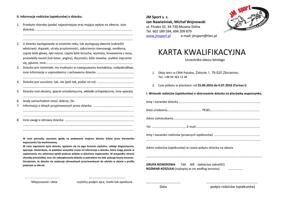 II. Informacje rodziców (opiekunów) o dziecku. 1. 2. 3. 4. 5. 6. 7. 8. Przebyte choroby (podać najważniejsze oraz mające wpływ na obecny stan dziecka)……………………………………………………………………………………………………………… …………………………………………………………………………………………………………………………… …………………………………………………………………………………………………………………………... U dziecka występowały w ostatnim roku, lub występują obecnie (zakreślić właściwe): drgawki, utraty przytomności, zaburzenia równowagi, omdlenia, częste bóle głowy, lęki nocne, częste bóle brzucha, wymioty, krwawienia z nosa, przewlekły kaszel (lub katar, anginy), duszności, bóle stawów, szybkie męczenie się, jąkanie, inne…………………………………………………………………………………………………. Dziecko jest nieśmiałe, ma trudności w nawiązywaniu kontaktów, nadpobudliwe, inne informacje o usposobieniu i zachowaniu dziecka ………………………………………... ……………………………………………………………………………………………………………………………. Dziecko jest uczulone: tak, nie (jeśli tak, podać na co): ........................................... ……………………………………………………………………………………………………………………………. Dziecko nosi okulary, aparat ortodontyczny, wkładki ortopedyczne, inne aparaty ……………………………………………………………………………………………………………………………. Jazdę samochodem znosi: dobrze, źle. Informacja o lekach przyjmowanych przez dziecko …………………………………………… ………………………………………………………………………………………………………………………....... .................................................................................................................................. Inne uwagi o zdrowiu dziecka: …………………………………………………............................. …………………………………………………………………………………………………………………………… ……………………………………………………………………………………………………………………………. W razie potrzeby, wyrażam zgodę na podawanie mojemu dziecku leków przez kierownika wypoczynku lub wychowawcę. W razie zagrożenia życia dziecka, zgadzam się na jego leczenie szpitalne, zabiegi diagnostyczne, operacje. Stwierdzam, że podałem wszystkie znane mi informacje o dziecku, które mogą pomóc w zapewnieniu mu właściwej opieki podczas pobytu w placówce wypoczynku. W przypadku ukrycia choroby przewlekłej, oraz nie zabezpieczenia dziecka w potrzebne mu leki, pokryję koszty leczenia. Oznajmiam, że dziecko nie wykazuje zdrowotnych przeciwwskazań do udziału w obozie o profilu podanym w ofercie. ……………………………………………….. Miejscowość i data ……………………………………….. czytelny podpis ojca, matki lub opiekuna JM Sport s. c. Jan Nawieśniak, Michał Wojnowski ul. Flizaka 32, 34-730 Mszana Dolna Tel. 602 189 594, 694 209 879 www.jmsport.pl e-mail: [email protected] KARTA KWALIFIKACYJNA Uczestnika obozu letniego 1. Obóz letni w CRW Polubie, Zatonie 1, 78-520 Złocieniec, Tel. +48 94 363 13 44 2. Czas pobytu w placówce: od 25.06.2016 do 6.07.2016 (Turnus I) I. Wniosek rodziców (opiekunów) o skierowanie dziecka na placówkę wypoczynku. Imię i nazwisko dziecka …………………………………………………………………………………………… Data urodzenia…………………………………….. PESEL……………………………………………………… Adres zamieszkania…………………………………………………………………………………………………. Tel. ………………………………………E-mail……………………………………………………………………….. Imię i nazwisko rodziców (prawnych opiekunów) …………………………………………………… ………………………………………………………………………………………………………………………………… Adres rodziców (opiekunów) w czasie pobytu dziecka na obozie ……………………………………………………………………………………………………………………… GRUPA ROWEROWA TAK NIE (właściwe zakreślić) ROZMIAR KOSZULKI (najlepiej w cm według wzrostu) ………………. …………………………………. Data ………….………….……………………………. podpis rodziców (opiekunów) III. Dodatkowe warunki uczestnictwa. REGULAMIN OBOZU LETNIEGO 1. Uczestnik powinien zabrać ze sobą niezbędny ekwipunek (ubrania, obuwie, przybory toaletowe, itp.), poza tym: - odzież odpowiednią do zajęć w terenie (kurtkę nieprzemakalną, czapkę, odpowiednie buty do wędrówek, buty sportowe, polar, koszulkę sportową - nie bawełnianą) - strój kąpielowy, dodatkowy ręcznik kąpielowy, krem do opalania, środek przeciw ukąszeniom owadów, klapki, przydatna będzie latarka, - zachęcamy do zabrania rowerów – rowery powinny być przygotowane technicznie (sugerujemy sprawdzenie w serwisie), dodatkowo należy zaopatrzyć się w dodatkową dętkę, obowiązkowy kask, przydatne będą okulary (mogą być zwykłe ochronne okulary), plecak. 1.Obóz ma charakter rekreacyjny. 2.Uczestników obowiązuje przestrzeganie ramowego porządku dnia i stawianie się na zbiórki punktualni