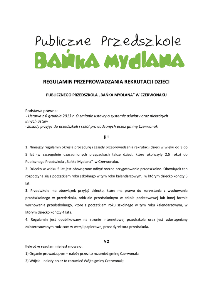REGULAMIN PRZEPROWADZANIA REKRUTACJI DZIECI PUBLICZNEGO PRZEDSZKOLA „BAŃKA MYDLANA” W CZERWONAKU Podstawa prawna: - Ustawa z 6 grudnia 2013 r. O zmianie ustawy o systemie oświaty oraz niektórych innych ustaw - Zasady przyjęć do przedszkoli i szkół prowadzonych przez gminę Czerwonak §1 1. Niniejszy regulamin określa procedurę i zasady przeprowadzania rekrutacji dzieci w wieku od 3 do 5 lat (w szczególnie uzasadnionych przypadkach także dzieci, które ukończyły 2,5 roku) do Publicznego Przedszkola „Bańka Mydlana” w Czerwonaku. 2. Dziecko w wieku 5 lat jest obowiązane odbyć roczne przygotowanie przedszkolne. Obowiązek ten rozpoczyna się z początkiem roku szkolnego w tym roku kalendarzowym, w którym dziecko kończy 5 lat. 3. Przedszkole ma obowiązek przyjąć dziecko, które ma prawo do korzystania z wychowania przedszkolnego w przedszkolu, oddziale przedszkolnym w szkole podstawowej lub innej formie wychowania przedszkolnego, które z początkiem roku szkolnego w tym roku kalendarzowym, w którym dziecko kończy 4 lata. 4. Regulamin jest opublikowany na stronie internetowej przedszkola oraz jest udostępniany zainteresowanym rodzicom w wersji papierowej przez dyrektora przedszkola. §2 Ilekroć w regulaminie jest mowa o: 1) Organie prowadzącym – należy przez to rozumieć gminę Czerwonak; 2) Wójcie - należy przez to rozumieć Wójta gminy Czerwonak; 3) Dyrektorze – należy przez to rozumieć dyrektora Publicznego Przedszkola „Bańka Mydlana” w Czerwonaku; 4) Przedszkolu należy przez to rozumieć Publiczne Przedszkole „Bańka Mydlana” w Czerwonaku; 5) Komisji należy przez to rozumieć Komisję Rekrutacyjną powołaną przez dyrektora do celów przeprowadzenia w przedszkolu rekrutacji zgodnie z niniejszym regulaminem; 6) Wielodzietności należy przez to rozumieć rodzinę wychowującą troje lub więcej dzieci; 7) Samotnym wychowywaniu dziecka – należy przez to rozumieć wychowywanie dziecka przez pannę, kawalera, wdowę, wdowca, osobę pozostająca w separacji orzeczonej prawomocnym wyrokiem sądu, osobę rozwiedzioną. Osobą samotną nie jest osoba, która ze względu na stan cywilny jest wolna, jednak wychowuje dziecko – kandydata do przedszkola wspólnie z jego rodzicem; 8) Rodzicu – należy przez to rozumieć rodzica posiadającego pełną władzę rodzicielską, prawnego opiekuna dziecka oraz osoby sprawujące pieczę zastępczą nad dzieckiem; 9) Kandydacie – należy przez to rozumieć dziecko objęte rekrutacją do przedszkola; 10)Karcie zgłoszenia – należy przez to rozumieć „Kartę zgłoszenia do przedszkola” – załącznik nr 1 do niniejszego Regulaminu. 11) Deklaracji – należy przez to rozumieć „Deklarację o kontynuowaniu wychowania przedszkolnego w przedszkolu” – załącznik nr 2 do niniejszego Regulaminu. 12) GOPS – należy przez to rozumieć Gminny Ośrodek Pomocy Społecznej 13) Regulaminie – należy przez to rozumieć Regulamin przeprowadzania rekrutacji dzieci do Publicznego Przedszkola „Bańka Mydlana” w Czerwonaku. §3 Procedura postępowania 1. Do przedszkola przyjmuje się kandydatów zamieszkałych na obszarze gminy Czerwonak. 2. Jeżeli po przeprowadzeniu postępowania rekrutacyjnego przedszkole nadal dysponuje wolnymi miejscami w przedszkolu, to w postępowaniu uzupełniającym do przedszkola mogą być przyjęci kandydaci spoza obszaru gminy. 3. Postępowanie uzupełniające powinno zakończyć się do końca sierpnia roku szkolnego poprzedzającego rok szkolny, na który jest przeprowadzane postępowanie rekrutacyjne. 4. Do postępowania uzupełniającego stosuje się przepisy niniejszego regulaminu. 5. W przypadku, gdy liczba zgłoszonych kandydatów jest mniejsza lub zgodna z liczbą miejsc, przyjęć do przedszkola dokonuje dyrektor. 6. W przypadku większej liczby zgłoszeń, dyrektor przeprowadza rekrutację zgodnie z regulaminem. 7. Wzór karty zgłoszenia jest określany przez dyrektora. 8. Rodzice dzieci uczęszczających do danego przedszkola składają na kolejny rok szkolny deklarację o kontynuowaniu wychowania przedszkolnego w tym przedszkolu. Dzieci, których rodzice złożą ww. deklarację są przyjęte do przedszkola w pierwszej kolejności. Wzór deklaracji jest określany przez dyrektora. 9. Miejsca w przedszkolu mają zapewnione dzieci objęte obowiązkowym przygotowaniem przedszkolnym (art. 14 ust. 3 i 3a Ustawy z 7 września 1991 r. O systemie oświaty - Dz. U. z 2004 nr 256, poz. 2572 ze zm. ) i dzieci 4 letnie (art. 7 ust. 1 i 2 Ustawy z 7 września 1991 r. O systemie oświaty - Dz. U. z 2004 nr 256, poz. 2572 ze zm.). §4 Zasady postępowania rekrutacyjnego 1. Rekrutacje do przedszkola ogłasza na kolejny rok szkolny dyrektor przedszkola w formie pisemnego ogłoszenia. 2. Ogłoszenie, o którym mowa u ust. 1. zawiera termin składania przez rodziców kart zgłoszenia i deklaracji oraz informację o miejscu udostępnienia regulaminu. 3. Ogłoszenie, o którym mowa w ust. 1. umieszcza się: a) na tablicy ogłoszeń przedszkola b) na stronie internetowej przedszkola §5 Kryteria rekrutacji 1. Rozpatrywanie kart zgłoszenia w I etapie rekrutacji dotyczy kandydatów zamieszkałych na terenie gminy. 2. W przypadku zgłoszenia w trakcie rekrutacji większej liczby kandydatów spełniających warunek określony w ust. 1 w stosunku do ilości wolnych miejsc w przedszkolu, brane są pod uwagę łącznie następujące kryteria o wartości wyrażonej w punktach: 1) wielodzietność rodziny kandydata – 10 pkt 2) niepełnosprawność kandydata – 10 pkt 3) niepełnosprawność jednego z rodziców kandydata – 10 pkt 4) niepełnosprawność obojga rodziców kandydata – 10 pkt 5) niepełnosprawność rodzeństwa kandydata – 10 pkt 6) samotne wychowywanie kandydata w rodzinie – 10 pkt 7) objęcie kandydata piecza zastępczą – 10 pkt 3. Jeśli po zakończeniu postępowania w I etapie w przedszkolu nadal są wolne miejsca lub kandydaci uzyskali taki sam wynik,