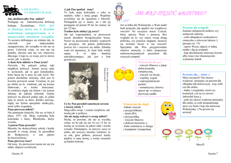 I ANI SŁOWA O LOKOMTYWACH... Jak zdefiniowałby Pan miłość? Posługuje się matematyczną definicją biskupa śycińskiego. OtóŜ jest to funkcja, która ma w liczniku maksimum zaangaŜowania, a w mianowniku minimum rozsądku. Gazeta 18 Fot. Ślubne zdjęcie państwa śołędziewskich To uczucie definiujące się właśnie tak, Ŝe człowiek jest maksymalnie zaangaŜowany, ale rozsądku to nie ma za grosz. Człowiek czuje, Ŝe ona mu się podoba, chociaŜ sam nie wie właściwie dlaczego. Czuje to, co czuje, jest to mowa uczuć, jak w poezji. A duŜo było miłości w Pana Ŝyciu? Niewiele. Na palcach jednej ręki mógłbym policzyć. Jestem raczej stały w uczuciach, jak te gęsi kanadyjskie, które łączą się w pary na całe Ŝycie. Nie jestem absolutnie zmienny, choć jest to kwestia pewnych zasad. UwaŜam, Ŝe juŜ po ślubie no to wiadomo, jak się komuś ślubowało, to trzeba dotrzymać. Ja osobiście nigdy nie byłem i nie jestem skłonny do jakichś miłostek. Gdyby policzyć na placach jednej ręki, to jedna ręka to nawet za duŜo. Krótko mówiąc, nigdy nie byłem specjalnie atrakcyjny, moŜe tylko wygadany. Pana pierwsza miłość? Nie pamiętam (śmiech). Nie no, to była 8 klasa, 1971 rok. Moją wybranką była koleŜanka z klasy. Blondynka, dosyć wysoka. A potem Panu przeszło? Musiało, bo skończyliśmy szkołę i kaŜdy poszedł w swoją stronę. Ja poszedłem do Bydgoszczy, a ona gdzieś do Inowrocławia. Pana pierwszy kosz? Od Ŝony. Za pierwszym razem mi się nie udało, dopiero za którymś. A jak Pan spotkał Ŝonę? To była moja koleŜanka z roku ze studiów, tylko z innej grupy. Wspólnie uczyliśmy się do egzaminu z filozofii. Pomagałem jej w nauce, no i tak jej pomagam od ponad 30 lat, bo znamy się juŜ 32 lata. Trudno było zdobyć jej serce? Jak juŜ wspominałem, za pierwszym razem dostałem bezapelacyjnie kosza. Nawet na pocieszenie koledzy wyprawili mi przyjęcie. Ale potem próbowałem jeszcze raz i wreszcie się udało. Zdradzę wam teŜ tajemnicę, Ŝe Ŝona była wtedy zajęta. A to takie bardziej satysfakcjonujące, jak jest z kim powalczyć. Co by Pan poradził samotnym sercom z naszej szkoły ? Mają robić swoje i czekać cierpliwie, tak trochę jak w polityce. Ale nie mają walczyć o swoją miłość? Myślę, Ŝe powinni, ale nie za wszelką cenne, no bo jak się ma 16 czy 15 lat, to trochę za wcześnie na jakieś stałe i trwałe związki. Pamiętajcie, Ŝe porywy serca to jedno, ale wszyscy musimy wiedzieć, Ŝe za rok, góra półtora, przecieŜ kaŜdy pójdzie w inną stronę, a wtedy rozstania są bardzo bolesne. JAK MIŁO SPĘDZIĆ WALENTYNKI? JuŜ za kilka dni Walentynki, a Wam nadal brak pomysłu, jak spędzić ten wyjątkowy wieczór? Na szczęście macie Cedzak, który spieszy Wam z pomocą. Bez względu na to, czy macie swoją drugą połówkę, czy jesteście singlami, moŜecie się świetnie bawić w ten wieczór! Specjalnie dla Was przygotowałam ciekawe pomysły, a takŜe propozycje niekonwencjonalnych prezentów dla waszych sympatii. Walentynki dla par: - wieczór filmowy z jakąś dobrą komedią romantyczną, - wieczór we dwoje, - wspólny wypad z zaprzyjaźnionymi parami, - romantyczny zimowy spacer np. w miejsce pierwszej randki. Walentynki dla singli: -babski wieczór z przyjaciółkami, - dzień SPA z przyjaciółką, - wieczór filmowy z dobrym horrorem ;), -białe szaleństwo w śniegu z kumplami i kumpelami. Prezenty dla sympatii: Zamiast oklepanych miśków czy serduszek radzimy: - zrób chłopakowi serduszkowe ciasteczka z róŜowym lukrem ;) (przepis str. 15) - opraw Wasze zdjęcie w ładną ramkę i daj ją sympatii, - kup ukochanemu śmieszny krawat albo wręcz mu własnoręcznie wykonany kubek. Prezenty dla… siebie ;) Masz szczęście! Nie musisz wydawać pieniędzy na prezent dla chłopaka lub dziewczyny więc zrób coś dla siebie: - ładny i oryginalny ciuch czy kosmetyk, coś na co zawsze Ŝałowałaś kasy;), - jeśli nie chcesz wydawać pieniędzy dla siebie, to zrób niespodziankę tacie czy bratu i kup mu śmieszną Walentynkę :) Na pewno się ucieszą! Mery☺ Gazeta 7