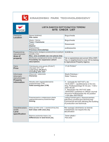 LISTA DANYCH DOTYCZĄCYCH TERENU SITE CHECK LIST Położenie Nazwa lokalizacji Location Site name Boguchwała Boguchwała Miasto / Gmina Town / Commune Powiat Rzeszowski District Województwo podkarpackie Province (Voivodship) Powierzchnia nieruchomości Maksymalna dostępna powierzchnia (w jednym 8,0438 ha kawałku) ha Area of property Max. area available (as one piece) ha Możliwości powiększenia terenu (krótki opis) Cena Orientacyjna cena gruntu PLN/m włączając 22% VAT Price Informacje dotyczące nieruchomości Property information Possibility for expansion (short description) 2 2 2 Skarb Państwa / State Treasury Własciciel / właściciele Owner(s) Aktualny plan zagospodarowania przestrzennego (T/N) Przeznaczenie w miejscowym planie zagospodarowania przestrzennego Zoning Land specification 17-22 PLN/m Land price PLN/m including 22% VAT Valid zoning plan (Y/N) Charakterystyka działki Tak w sąsiedztwie jest ponad 30ha ANR / Yes, in neighborhood is over 30 ha belong to Agricultural Property Agency Klasa gruntów wraz z powierzchnią ha Soil class with area ha Różnica poziomów terenu m T, Uchwała Nr VII/71/07 z dn. 19.04.2007 r. opublikowana w Dz.Urz. Woj. Podkarpackiego Nr 42 poz. 1128 z 2007-05-25/ Y, Resolution No VII/71/07 date 19/04/2007 published In Official Journal Province Podkarpackie No 42 position 1128 date 2007/05/25 Usługi komercyjne z dopuszczeniem zabudowy produkcyjno-technicznej/ Commercial services allowing the building of production and technical. Nie wymaga odrolnienia na terenie miasta/Does not require the city decultivation Teren płaski / Flat area Differences in land level m 1 Obecne użytkowanie Present usage Rolnicze / Farm Zanieczyszczenia wód powierzchniowych i gruntowych (T/N) Nie wystepują / There is no pollution Soil and underground water pollution (Y/N) Odpady znajdujące się na terenie (T/N) Waste materials on site (Y/N) Poziom wód gruntowych m Underground water level m W obszarze przyległym 1,2 m/ In the area adjecent 1,2 m Ryzyko wystąpienia zalań lub obsunięć terenu (T/N) Nie / No Risk of flooding or land slide (Y/N) Przeszkody podziemne (T/N) Underground obstacles (Y/N) Nie / No Przeszkody występujące na powierzchni terenu (T/N) Nie / No Ground and overhead obstacles (Y/N) Istniejące ograniczenia ekologiczne (T/N) Ecological restrictions (Y/N) Budynki i zabudowania na terenie (T/N) Buildings / other constructions on site (Y/N) Ograniczenia budowlane Procent dopuszczalnej zabudowy Building coverage % Building restrictions Ograniczenia wysokości budynków m Building height limit m Strefa buforowa m Buffer zone m Inne, jeśli występują Połączenia transportowe Transport Nie wystepują / There is lack of waste materials Nie / No Nie / No Powierzchnia zabudowy nie może przekraczać 50% powierzchni wydzielonej działki/ Building area shall not exceed 50% of the land subdivision Obowiązuje realizacja budynków o wysokości nie przekraczającej 17 m od poziomu terenu/ Spaces, the buildings of a height not exceeding 17 m from ground level Nie wystepuje/ There is lack of buffer zone Others if any Nie wystepuje/ There is no others Droga dojazdowa do terenu (rodzaj drogi i jej szerokość) Do wybudowania 600 m drogi / To build 600 m Access road to the plot (type and width of access road) 2 links Autostrada / droga krajowa km Droga Krajowa nr 9 w odległości 0,50 km od granicy terenu/ National Road No 9, 0,50 km the boundaries of the site Stacja Boguchwała w odległości 1,50 km od granic terenu, linia kolejowa 400 m od granic terenu/ Station Boguchwała – 1,50 km the boundaries of the site, railway line 400 m the boundaries of the site Boguchwała - 1,5 km / Boguchwala - 1,5 km Nearest motorway / national road km Kolej km Railway line km Bocznica kolejowa km Railway siding km Najbliższe lotnisko międzynarodowe km Nearest international airport km Najbliższe miasto wojewódzkie km Nearest province capital km Istniejąca infrastruktura Existing infrastructure Elektryczność na terenie (T/N) Odległość przyłącza od granicy terenu Connection point (distance from boundary) m Miasto Rzeszów w odległości 3,0 km od granic terenu/ The Provence capital Rzeszów – 3.0 km the boundaries of the site Nie / No Electricity (Y/N) Międzynarodowe Lotnisko RzeszówJasionka w odległości 20 km od granic terenu/ International airport Rzeszów-Jasionka 20 km the boundaries of the site Napięcie Voltage kV Dostępna moc Elektryczność w odległości 200m od granic terenu/ Electricity – 200 m the boundaries of the site Sieć 15kV / system 15 kV 1MW Available capacity MW Gaz na terenie (T/N) Nie / Gas (Y/N) No Odległość przyłącza od granicy działki Connection point (distance from boundary) m 3 Wartość kaloryczna Calorific value MJ/Nm 3 3000 m od granic terenu/ 3000 m the boundaries of the site 35MJ/Nm od granic terenu/ 3 35MJ/Nm the boundaries of the site Średnica rury Pipe diameter mm Dostępna objętość Available capacity Nm /h 3 Woda na terenie (T/N) Nie / No Water supply (Y/N) 3 Odległość przyłącza od granicy terenu Connection point (distance from boundary) m 250 m od granic terenu/ 250 m the boundaries of the site 3 Dostępna objętość 720m /24h Available capacity m /24h 3 Kanalizacja na terenie (T/N) Nie / No Sewage discharge (Y/N) Odległość przyłącza od granicy terenu Connection point (distance from boundary) m 200 m od granic terenu/ 200 m the boundaries of the site 3 Dostępna objętość 800m /24h Available capacity m /24h 3 Ograniczenie zrzutu ścieków Limitation of discharge Odprowadzenie wód deszczowych na terenie (T/N) Rain water discharge (Y/N) Oczyszczalnia ścieków na terenie bądź w bezpośrednim sąsiedztwie Treatment plant (Y/N) Telefony (T/N) Telephone (Y/N) Odległość przyłącza od granicy terenu Connection point (distance from boundary) m Liczba dostępnych linii analogowych Number of available analog lines Liczba dostępnych linii ISDN Number of available ISDN lines Osoby do kontaktu 