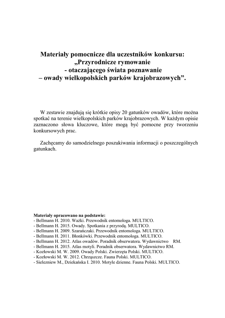 Materiały pomocnicze dla uczestników konkursu: „Przyrodnicze rymowanie - otaczającego świata poznawanie – owady wielkopolskich parków krajobrazowych”. W zestawie znajdują się krótkie opisy 20 gatunków owadów, które można spotkać na terenie wielkopolskich parków krajobrazowych. W każdym opisie zaznaczono słowa kluczowe, które mogą być pomocne przy tworzeniu konkursowych prac. Zachęcamy do samodzielnego poszukiwania informacji o poszczególnych gatunkach. Materiały opracowano na podstawie: - Bellmann H. 2010. Ważki. Przewodnik entomologa. MULTICO. - Bellmann H. 2015. Owady. Spotkania z przyrodą. MULTICO. - Bellmann H. 2009. Szarańczaki. Przewodnik entomologa. MULTICO. - Bellmann H. 2011. Błonkówki. Przewodnik entomologa. MULTICO. - Bellmann H. 2012. Atlas owadów. Poradnik obserwatora. Wydawnictwo RM. - Bellmann H. 2015. Atlas motyli. Poradnik obserwatora. Wydawnictwo RM. - Kozłowski M. W. 2009. Owady Polski. Zwierzęta Polski. MULTICO. - Kozłowski M. W. 2012. Chrząszcze. Fauna Polski. MULTICO. - Sielezniew M., Dziekańska I. 2010. Motyle dzienne. Fauna Polski. MULTICO. Jelonek rogacz (Lucanus cervus) Jeden z największych chrząszczy w Polsce, należący do rodziny jelonkowatych. Jest barwy ciemnobrązowej. Osiąga 6 cm długości (bez żuwaczek). Ozdobą samca są potężnie rozrośnięte żuwaczki, przypominające poroże jelenia, stąd wzięła się nazwa chrząszcza. Samice są nieco mniejsze i posiadają normalne żuwaczki. Przednia para skrzydeł jest zmieniona w twarde pokrywy, szczelnie ochraniające ciało, tylne skrzydła są błoniaste i pozwalają na stabilny choć ciężkawy lot. Dorosłe owady odżywiają się głównie sokiem wyciekającym z drzew. Larwa jelonka jest pędrakiem, żyjącym w zmurszałym drewnie. W tym stadium żyje 4 lata. Dorosłe jelonki żyją kilka miesięcy choć najłatwiej je spotkać w czerwcu, podczas godów nazywanych też rójką oraz w ciepłe popołudnia i wieczory. Jest znany z całego kraju poza górami. Jego miejsca występowania są bardzo rozproszone i niełatwo go spotkać. Zasiedla prześwietlone naturalne drzewostany, a także obrzeża lasów gospodarczych, stare parki i sady. Związany przede wszystkim z dębami, rzadziej z innymi gatunkami drzew liściastych. Konieczne są martwe lub obumierające drzewa, w których żerują pędraki. Podlega częściowej ochronie gatunkowej. Złotook pospolity Chrysopa perla Owad sieciarka z rodziny złotookowatych. Posiada charakterystyczną głowę z dużymi, mieniącymi się złotem oczami, przypominającą głowę modliszki. Czułki cienkie ale długie. Ciało o długości ok 1,5 cm jest barwy zielonozłotej. Ma 2 pary przeźroczystych, wyraźnie użyłkowanych skrzydeł chociaż lata niezbyt sprawnie. Tak owady dorosłe jak i larwy są drapieżnikami i odżywiają się mszycami, roztoczami i innymi małymi stawonogami, także ich larwami i jajami. Jedna samica w ciągu miesiąca może zjeść nawet 1000 mszyc. Z tego względu są uważana za bardzo pożyteczne. Występują w całej Polsce. Przebywają w różnych środowiskach, przede wszystkim tam, gdzie jest dużo mszyc. Regularnie spotykane w sadach i ogrodach są ważnym elementem biologicznej walki ze szkodnikami. Na zimę często wciskają się do mieszkań w celu znalezienia kryjówki na zimę gdyż są bardzo wrażliwe na mróz. W tym celu można im budować specjalne schronienia w postaci skrzyneczek barwy czerwonej lub brązowej, kolory te przyciągają złotooki. Szczeciowłos Chaetopteryx villosa Szczeciowłos jest chruścikiem należącym do rodziny bagiennikowatych. Nazwa pochodzi od licznych, szczecinowatych włosków pokrywających skrzydła. Dorosłe szczeciowłosy wyglądem przypominają brązowe ćmy, z którymi są z resztą spokrewnione. Larwy przypominające gąsienice motyli żyją w wodzie i w celu ochrony ciała budują rurkowate domki o długości ok. 2 cm. Materiałem na domek są ziarenka piasku, fragmenty roślin i cząstki detrytusu zespojone przędzą. Stąd pochodzi też nazwa wszystkich chruścików gdyż domek wielu z nich wygląda jak pokryty chrustem. Dorosłe owady nie odżywiają się wcale natomiast larwy są detrytusożerne, często zjadają opadłe jesienią liście. Dorosłe szczeciowłosy pojawiają się późną jesienią, często spotyka się je na śniegu. Larwy występują w wodach płynących, najczęściej w leśnych strumieniach i źródłach. Spotkać je można w całym kraju choć częściej w górach i na wyżynach. Obcężnica nadbrzeżna Labidura riparia Gatunek skorka z rodziny obcężnicowatych. Jest to największy z krajowych skorków o długości ciała dochodzącej do 3 cm. Ciało barwy rudobrązowej jest wydłużone i lekko spłaszczone, zaopatrzone w długie nogi i charakterystyczne cęgi przypominające obcęgi – stąd nazwa, dzięki którym powszechnie nazywa się je szczypawkami. Po kształcie cęgów można odróżnić samce, o cęgach wygiętych z zębem po wewnętrznej stronie, od samic, o cęgach prostych. Owady te potrafią latać aczkolwiek czynią to rzadko, skrzydła są niewidoczna pod pokrywami, starannie ułożone dzięki specjalnym zawiasom, podobnym do tych jakie występują u chrząszczy. Larwy są podobne do dorosłych obcężnic ale nie maja skrzydeł i tak wyeksponowanych cęgów. Są to owady ciepłolubne, aktywne nocą, drapieżne. Najchętniej zamieszkują miejsca wilgotne i piaszczyste jak brzegi wód, gdzie drążą korytarze w które składają jaja. Występują powszechnie w całym kraju lecz chętniej w południowej, cieplejszej części. Trzyszcz piaskowy Cicindela hybryda Jest to gatunek chrząszcza z rodziny biegaczowatych. Osiąga długość 1,5 cm. Ciało barwy metalicznej, brązowej od góry i zielonej od spodu. Pokrywy pokryte są żółtymi przepaskami co tworzy bardzo interesujący deseń. Trzyszcz posiada głowę z dużymi, wypukłymi oczami i bardzo długimi, ząbkowanymi żuwaczkami. Dzięki długim nogom spra